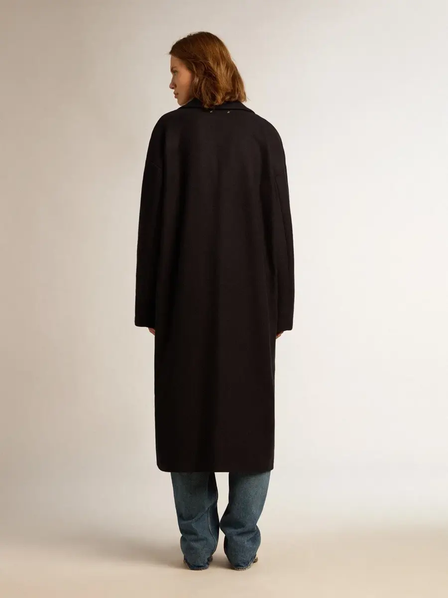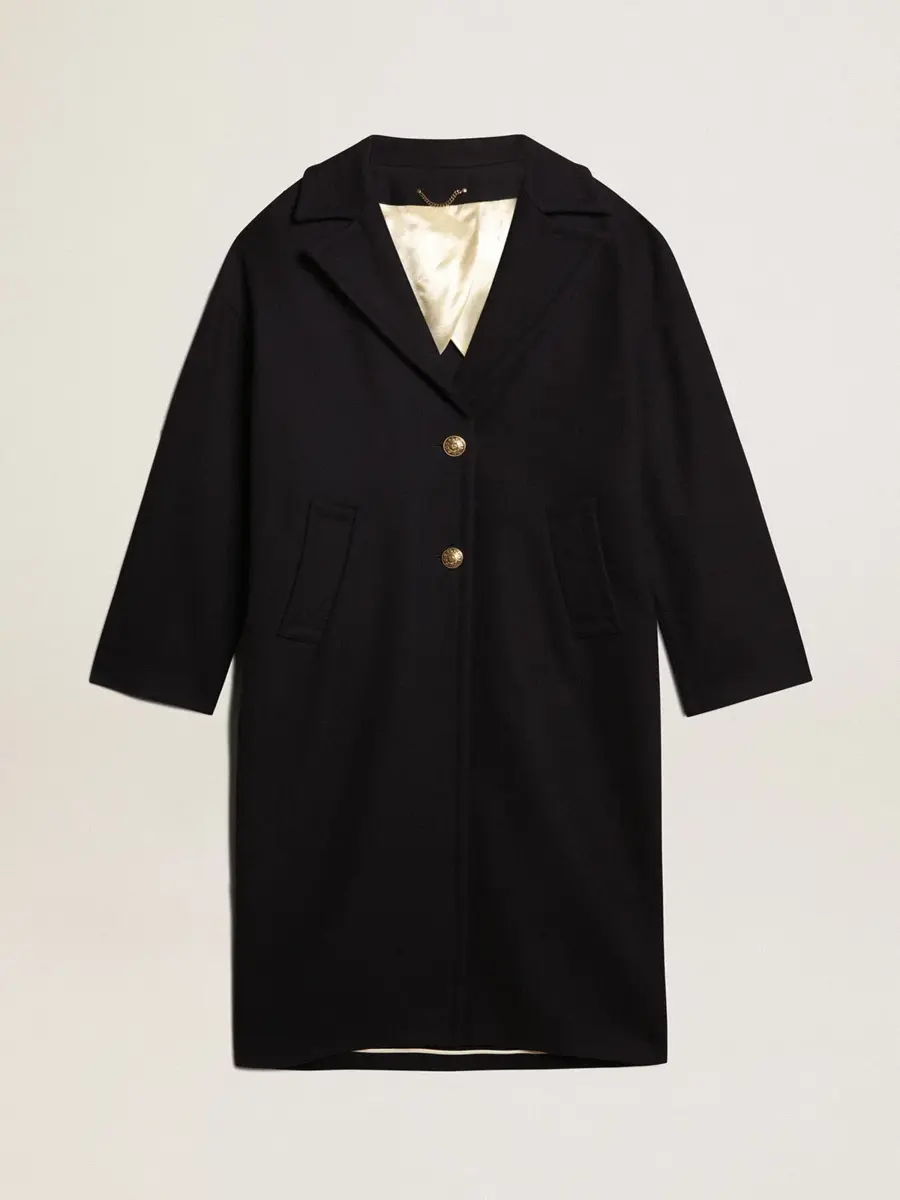 Una colección única y atemporal que engloba la esencia de Golden Goose, diseñada para acompañarte cada día y acompañarte en tus altibajos, llueva o haga sol. Este abrigo cocoon de lana azul oscuro con botones heráldicos dorados cuenta con un cierre con botones heráldicos dorados.