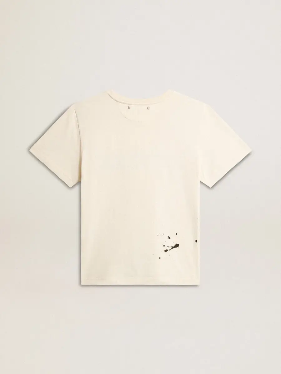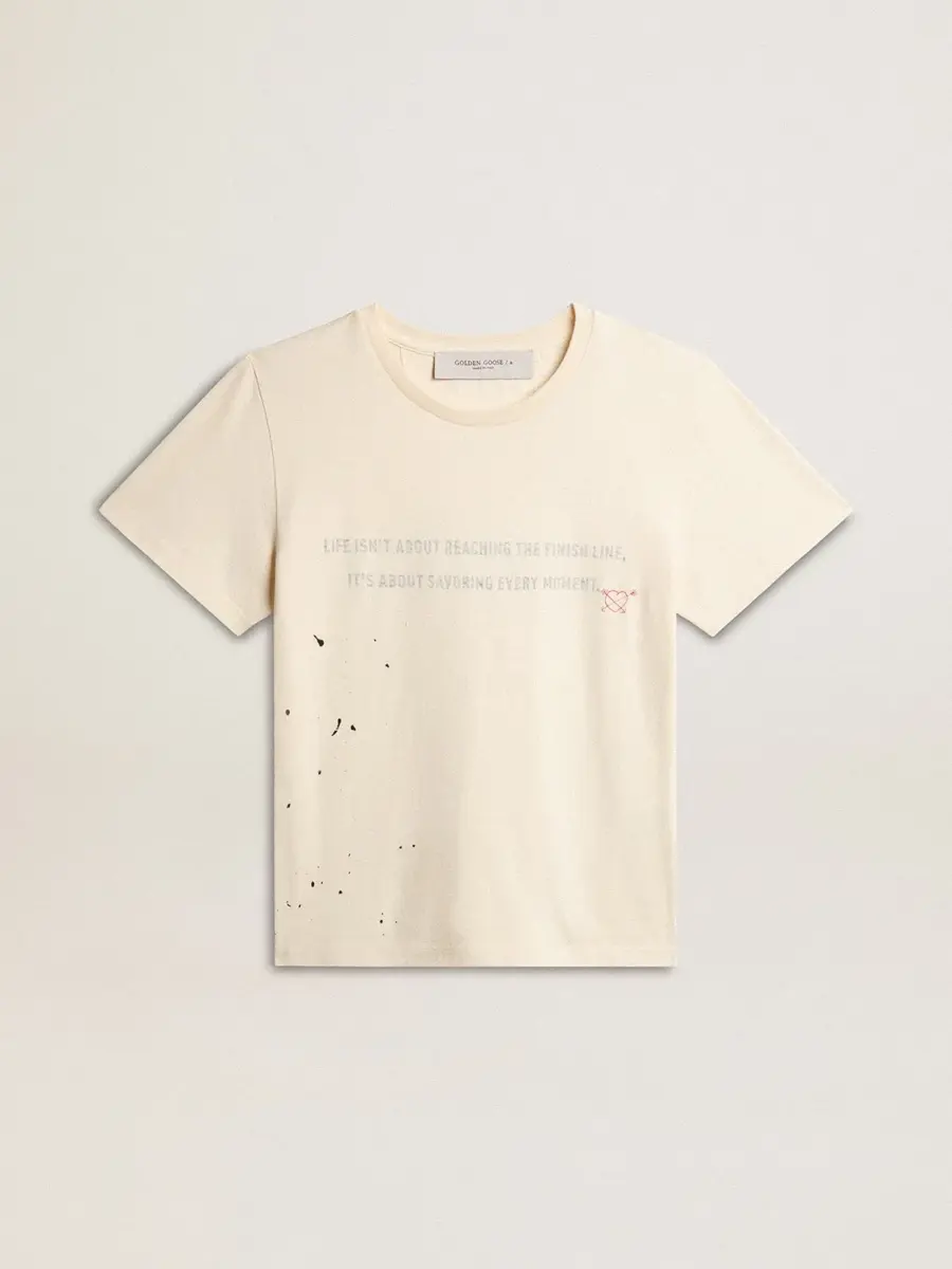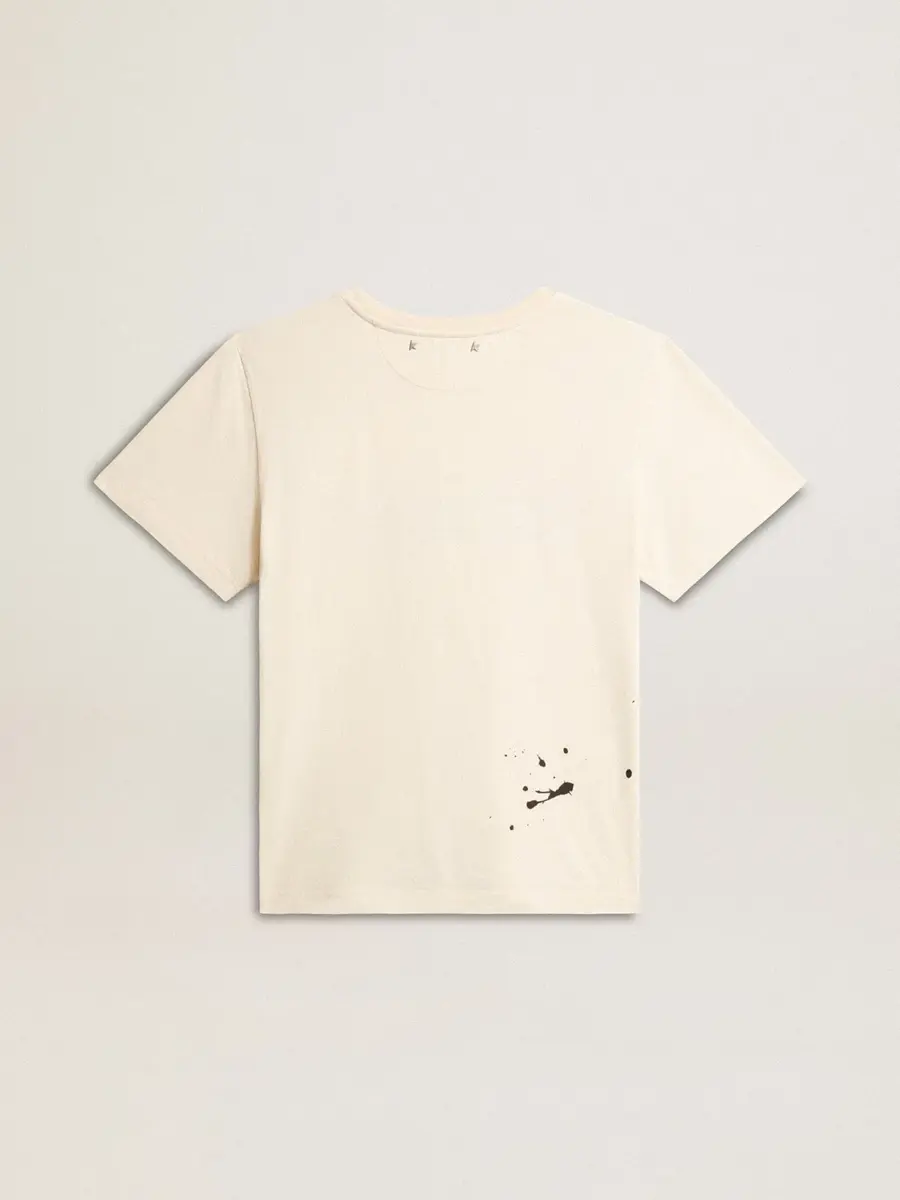 Una historia de amor con nuestra ciudad natal, Marghera. Donde todo comenzó. Nuestra última colección refleja el espíritu de nuestro lugar de origen, sus contrastes, su alma industrial y sus paisajes manufactureros, entrelazando inspiraciones tanto de la vibrante energía de la ropa de trabajo como de la refinada esencia de la sastrería tradicional. Confeccionada en jersey de algodón blanco envejecido, esta camiseta de mujer presenta un estampado acuarela en la espalda y un pequeño corazón bordado. Las marcas impresas en negro añaden un efecto desgastado a la prenda para darle el toque final.