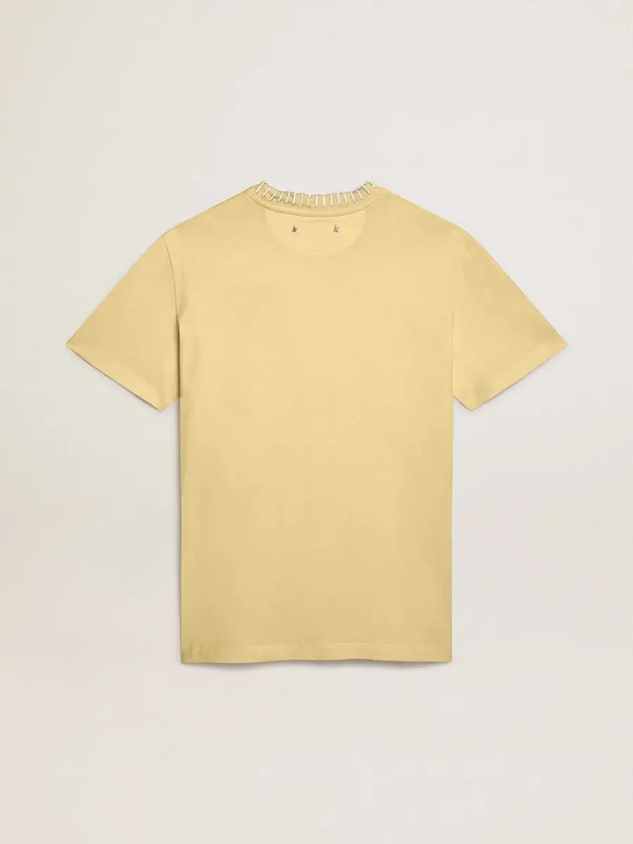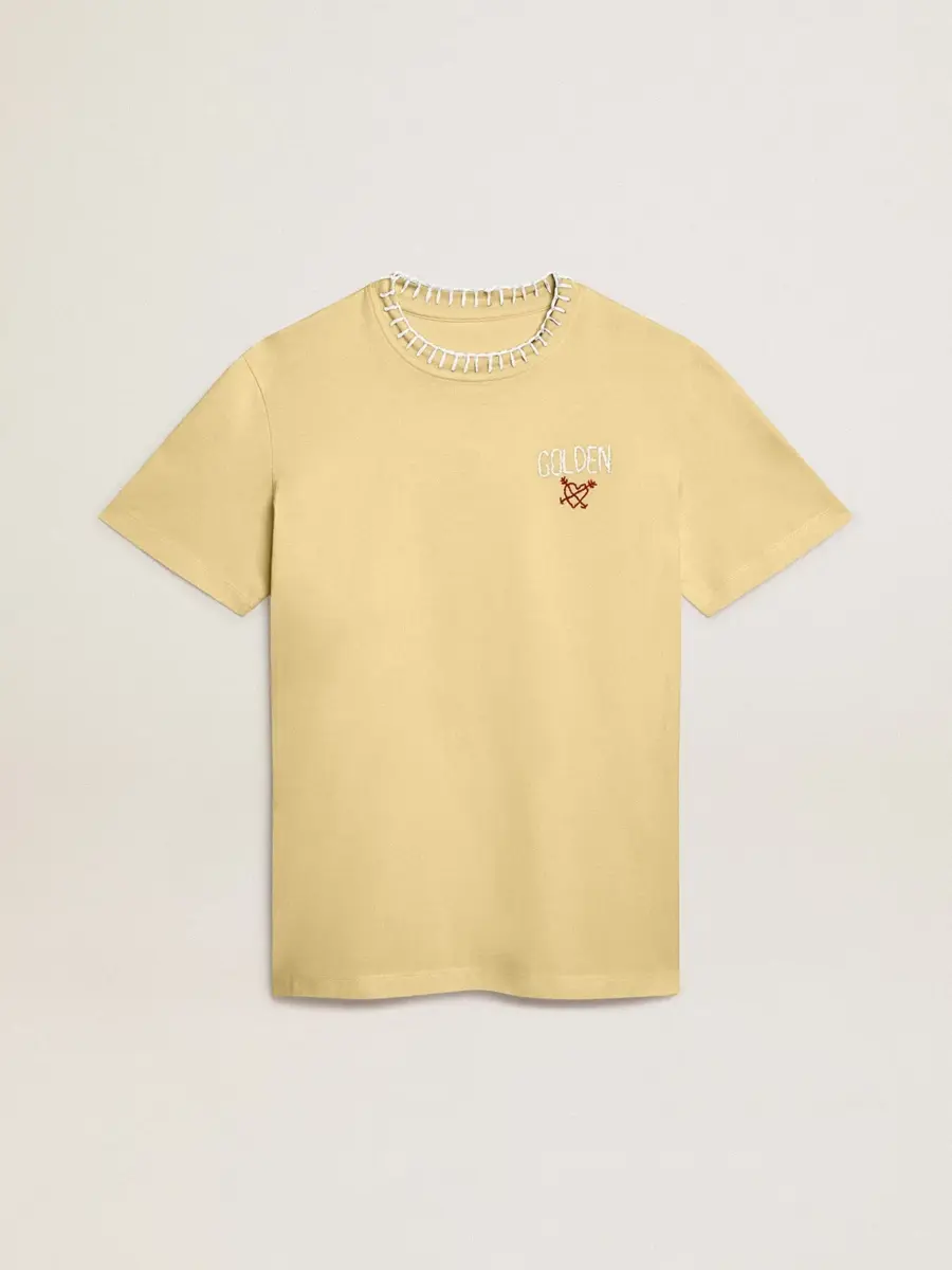 Una historia de amor a nuestra ciudad natal, Marghera. Donde todo comenzó. Nuestra última colección refleja el espíritu de nuestro lugar de origen, sus contrastes, su alma industrial y sus paisajes manufactureros, entrelazando inspiraciones tanto de la vibrante energía de la ropa de trabajo como de la refinada esencia de la sastrería tradicional. En algodón amarillo pálido, esta camiseta slim fit para mujer presenta bordados blancos en el cuello y el corazón.