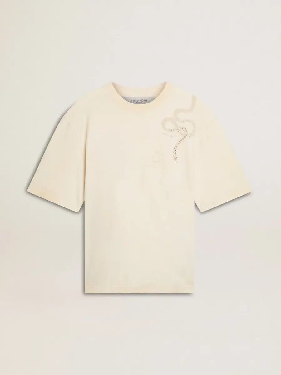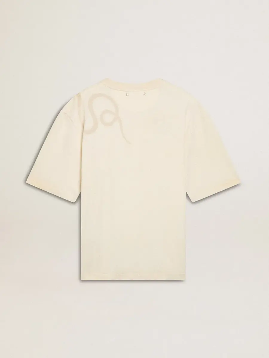 Creada para celebrar el Año Nuevo chino y el Año de la Serpiente, esta prenda representa la transformación y el renacimiento, combinando elegancia y simbolismo en cada detalle. Confeccionada en algodón blanco desgastado, esta camiseta unisex de cuello redondo presenta un efecto desgastado en los bordes y un corte holgado, perfecto tanto para hombres como para mujeres. Un estampado bordado de una serpiente adornado con cristales en el lado izquierdo le da el toque final.