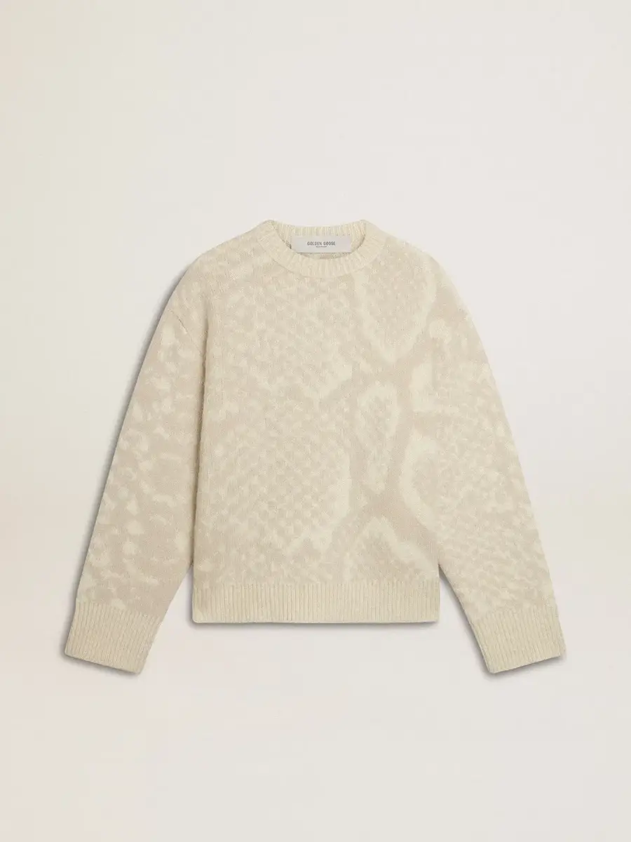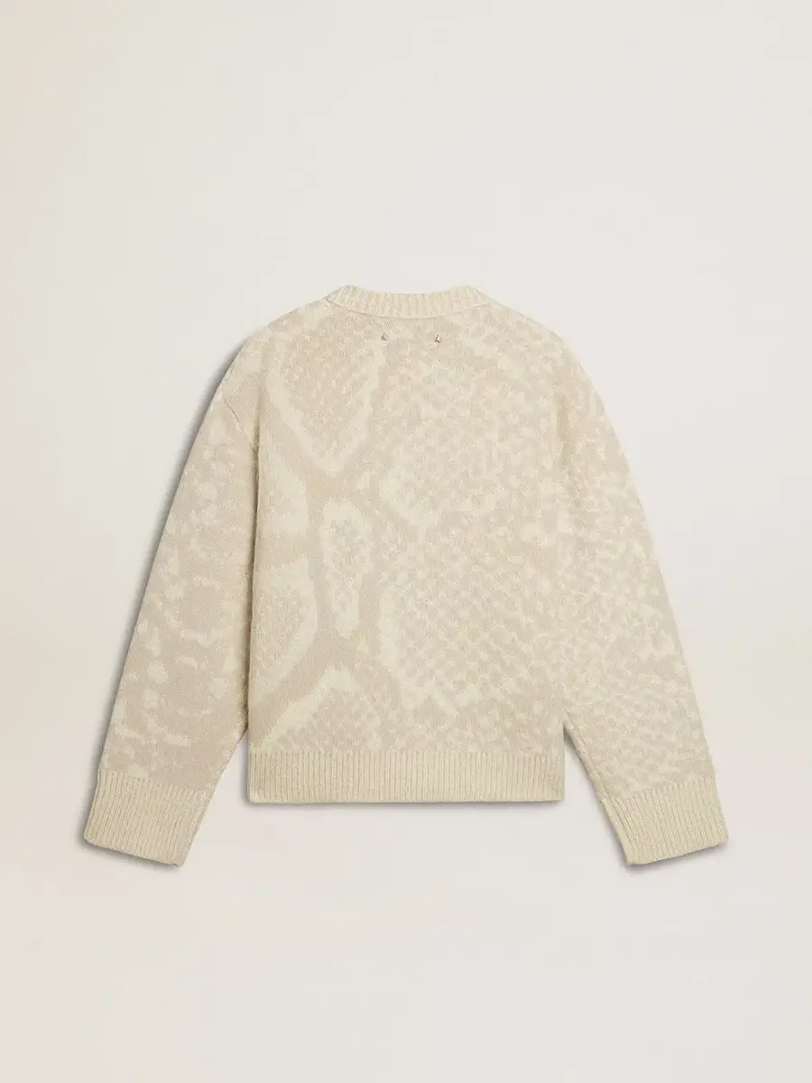 Creada para celebrar el Año Nuevo Chino y el Año de la Serpiente, esta prenda representa la transformación y el renacimiento, combinando elegancia y simbolismo en cada detalle. Este jersey beige para mujer tiene un diseño relajado y sencillo, lo que lo hace perfecto tanto para looks informales como elegantes. Confeccionado en lana virgen, presenta un estampado de piel de serpiente tono sobre tono. El ribete de tejido acanalado en los bordes de las mangas y el dobladillo, y la doble estrella dorada en la espalda añaden el toque final.