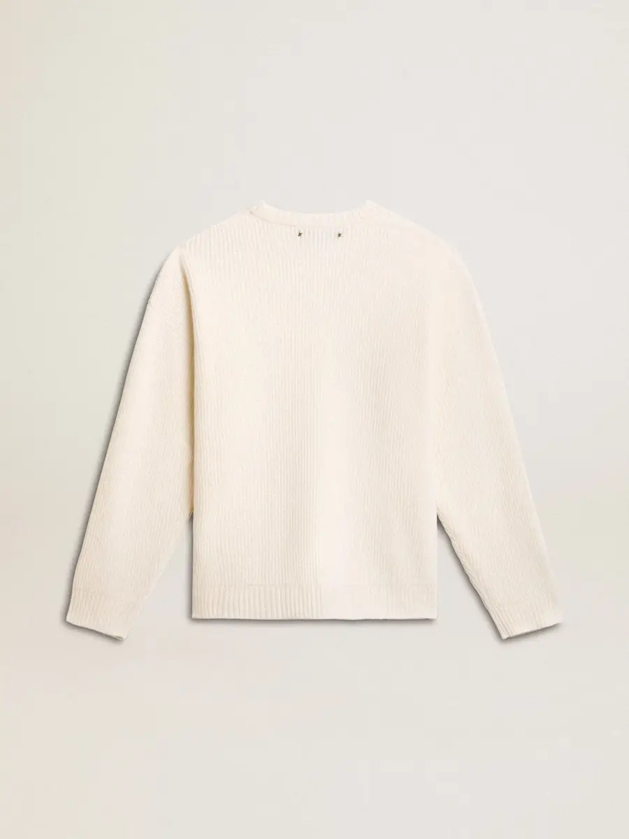 Una historia de amor con nuestra ciudad natal, Marghera. Donde todo comenzó. Nuestra última colección refleja el espíritu de nuestro lugar de origen, sus contrastes, su alma industrial y sus paisajes manufactureros, entrelazando inspiraciones tanto de la vibrante energía de la ropa de trabajo como de la refinada esencia de la sastrería tradicional. Este jersey de hombre de lana acanalada en blanco desgastado presenta un corte recto y dos pequeñas estrellas aplicadas en la espalda.
