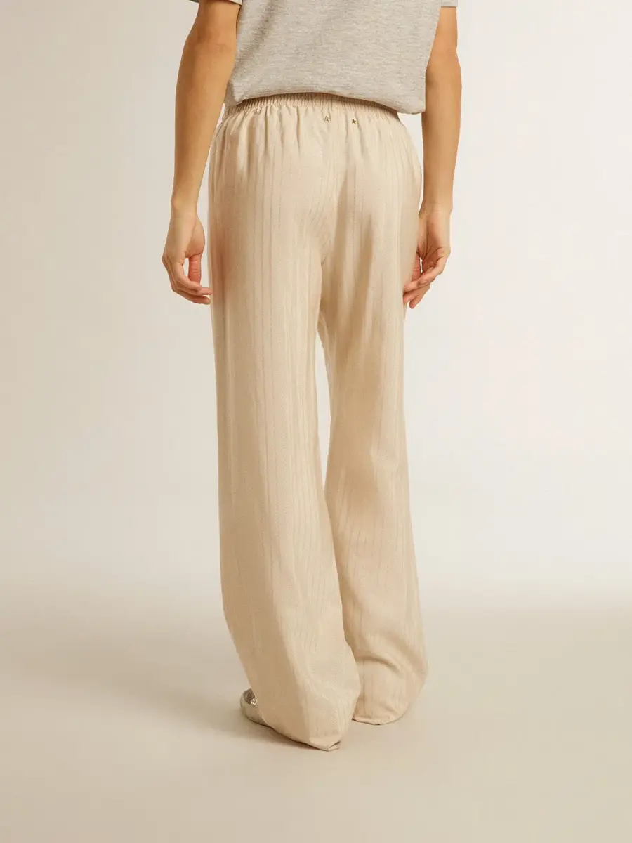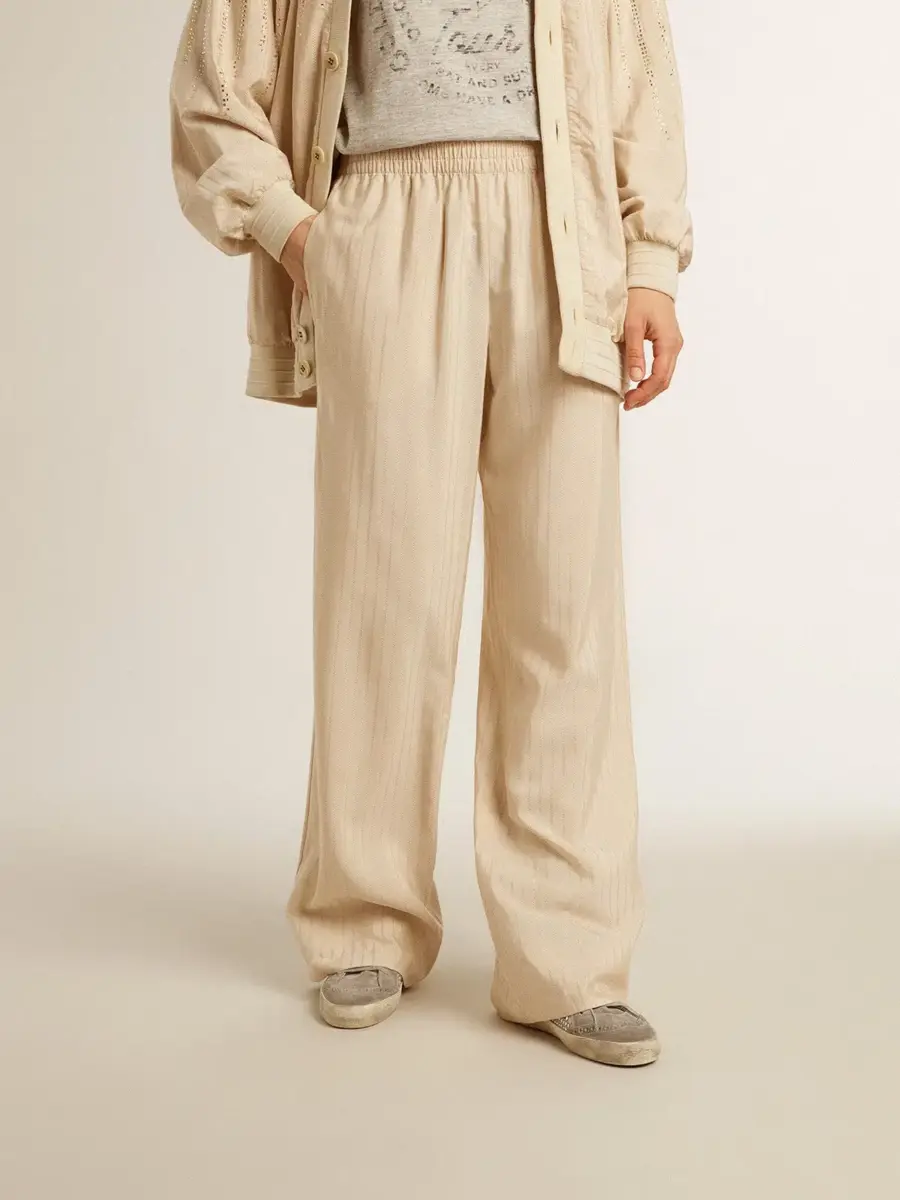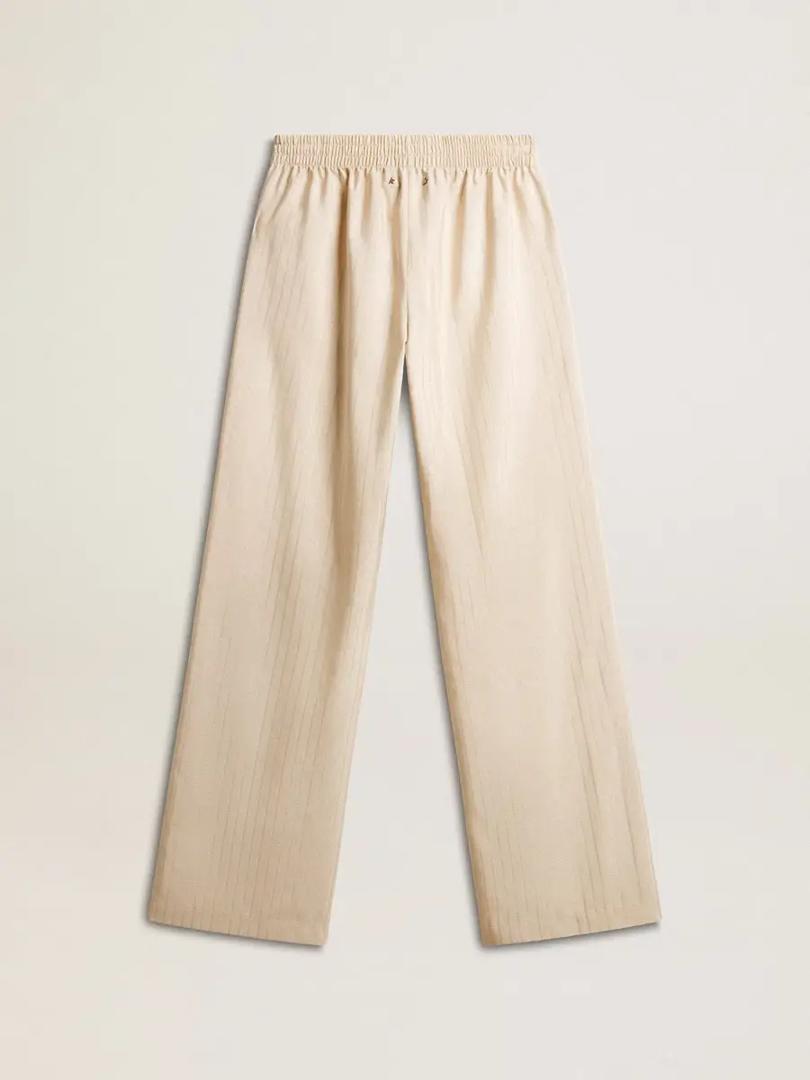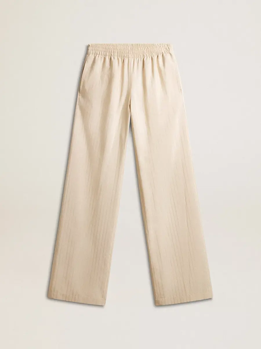 Una historia de amor dedicada a nuestra ciudad natal, Marghera. Donde todo comenzó. Nuestra última colección refleja el espíritu de nuestro lugar de origen, sus contrastes, su alma industrial y sus paisajes fabriles, entrelazando inspiraciones tanto de la vibrante energía de la ropa de trabajo como de la refinada esencia de la sastrería tradicional. Estos elegantes pantalones joggers para mujer, confeccionados en jacquard de seda y viscosa de color beige claro, presentan un corte holgado en las piernas y una cintura elástica.