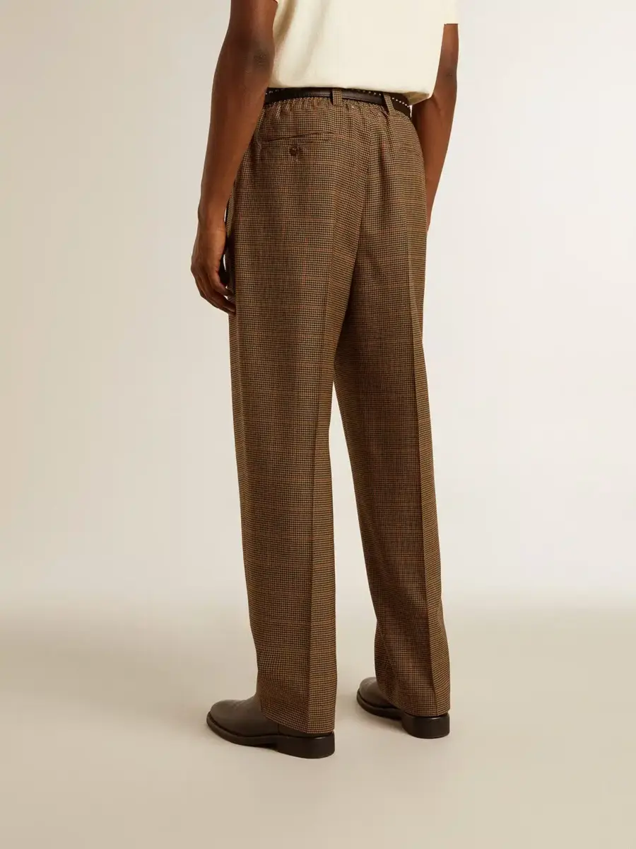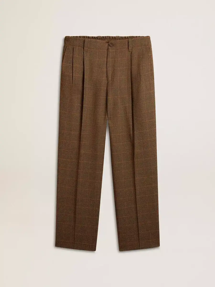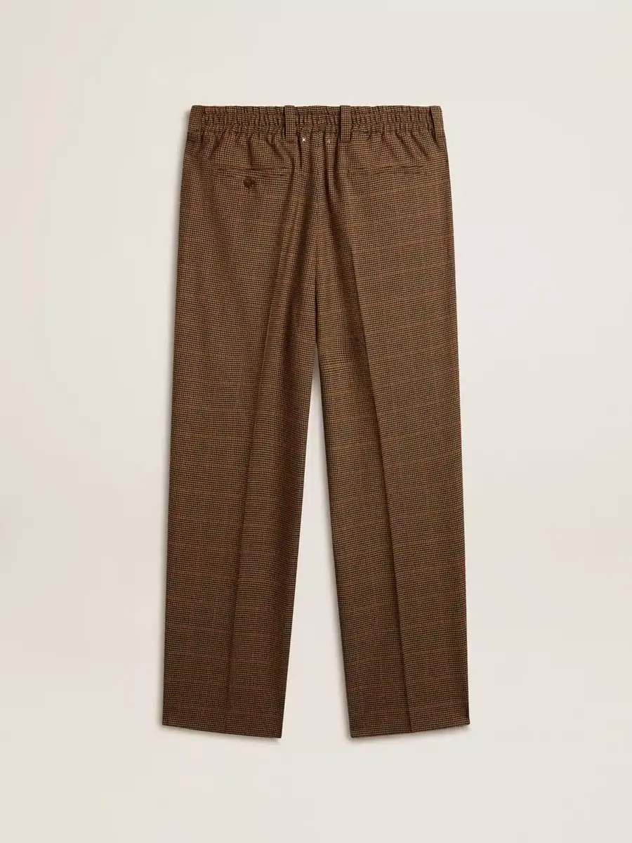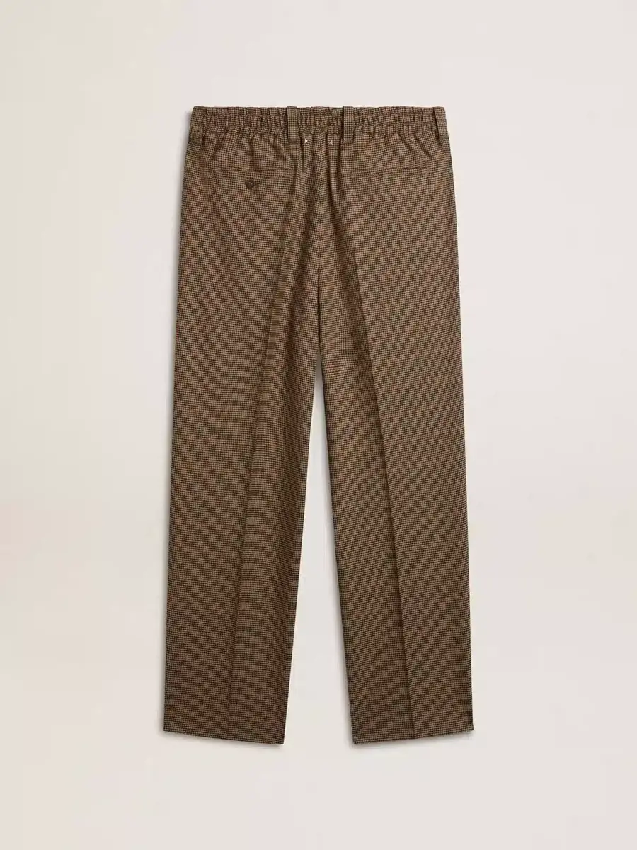 Una historia de amor con nuestra tierra natal, Marghera. Donde todo comenzó. Nuestra última colección refleja el espíritu de nuestro lugar de origen, sus contrastes, su alma industrial y sus paisajes manufactureros, entrelazando inspiraciones tanto de la vibrante energía de la ropa de trabajo como de la refinada esencia de la sastrería tradicional. Con un estampado de pata de gallo y un corte holgado, estos pantalones cuentan con cuatro bolsillos, cierre con botones de cuerno y pliegues en la parte delantera. La cintura elástica en la parte trasera añade el toque final, dando a esta prenda un aire relajado y vintage.