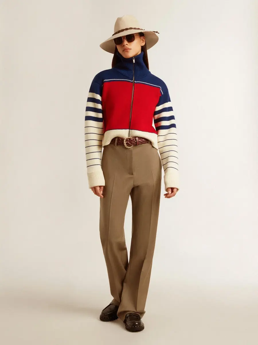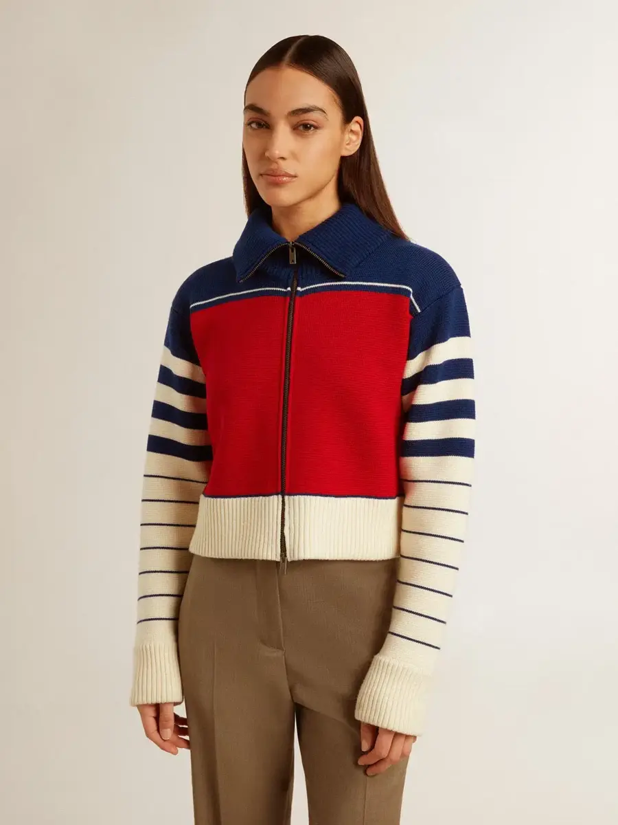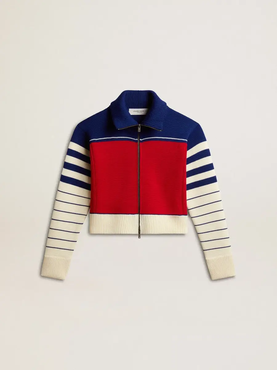 Una historia de amor con nuestra tierra natal, Marghera. Donde todo comenzó. Nuestra última colección refleja el espíritu de nuestro lugar de origen, sus contrastes, su alma industrial y sus paisajes manufactureros, entrelazando inspiraciones tanto de la vibrante energía de la ropa de trabajo como de la refinada esencia de la sastrería tradicional. Esta sudadera corta de lana, con cuello alto y cierre de cremallera, presenta un parche de nylon rojo aplicado en la espalda y mangas a rayas azules y blancas. Los detalles acanalados en el cuello, el dobladillo y los puños añaden el toque final.