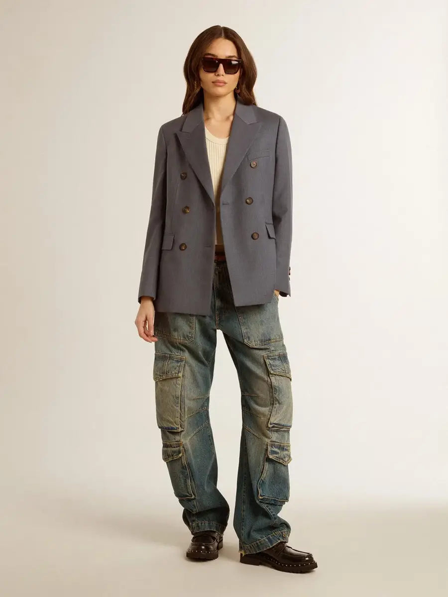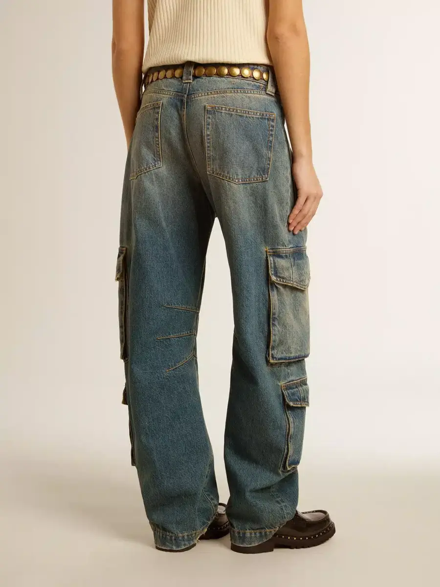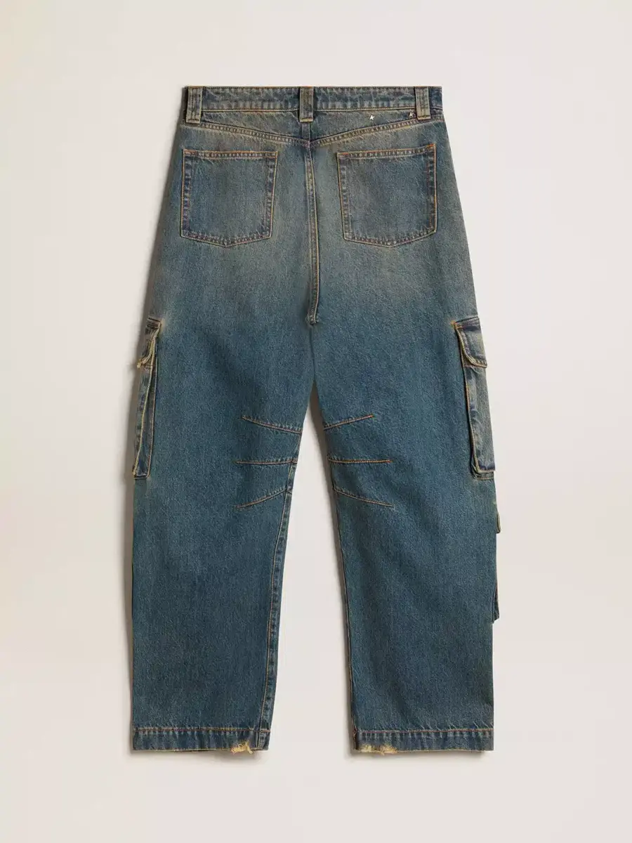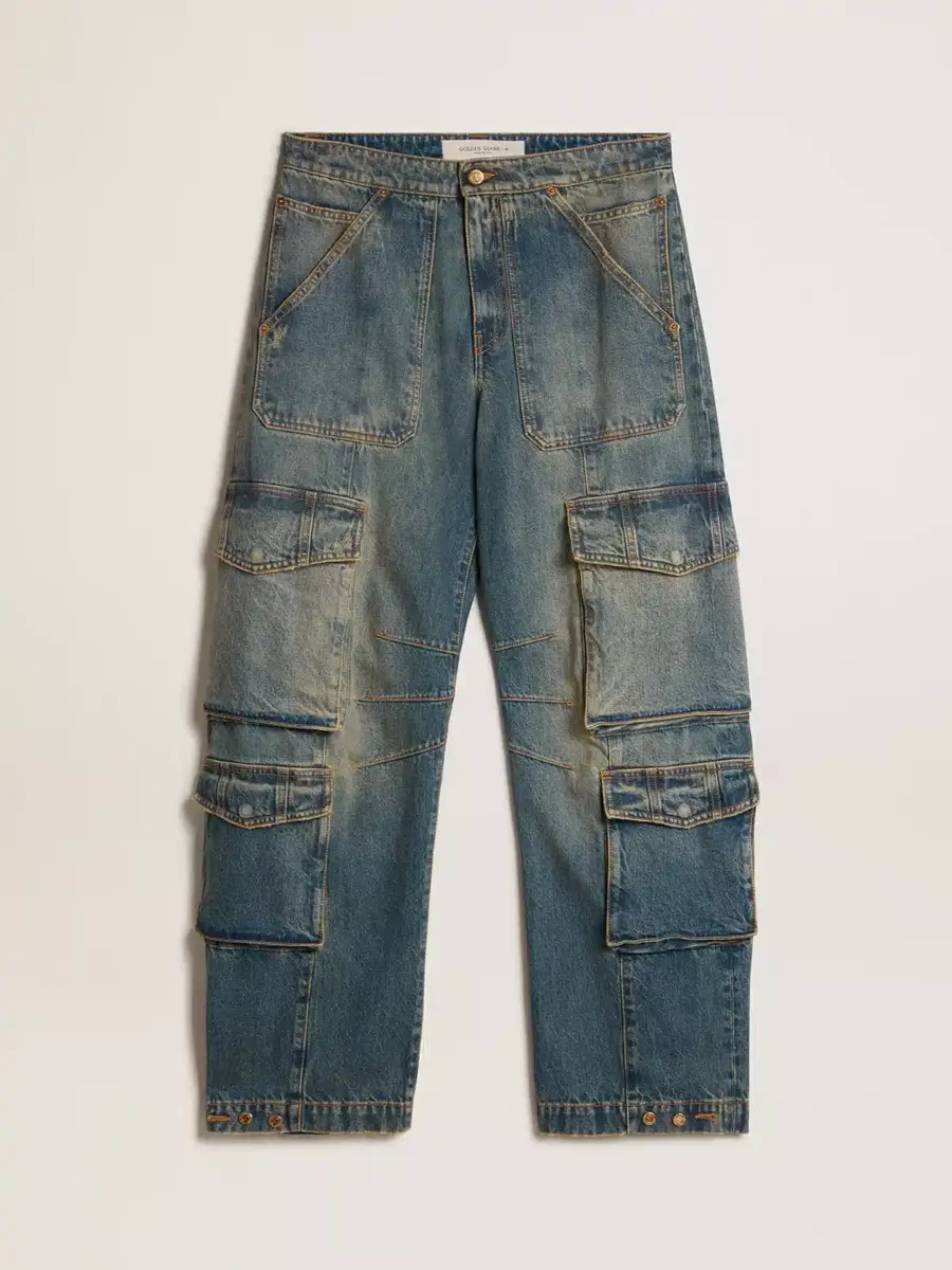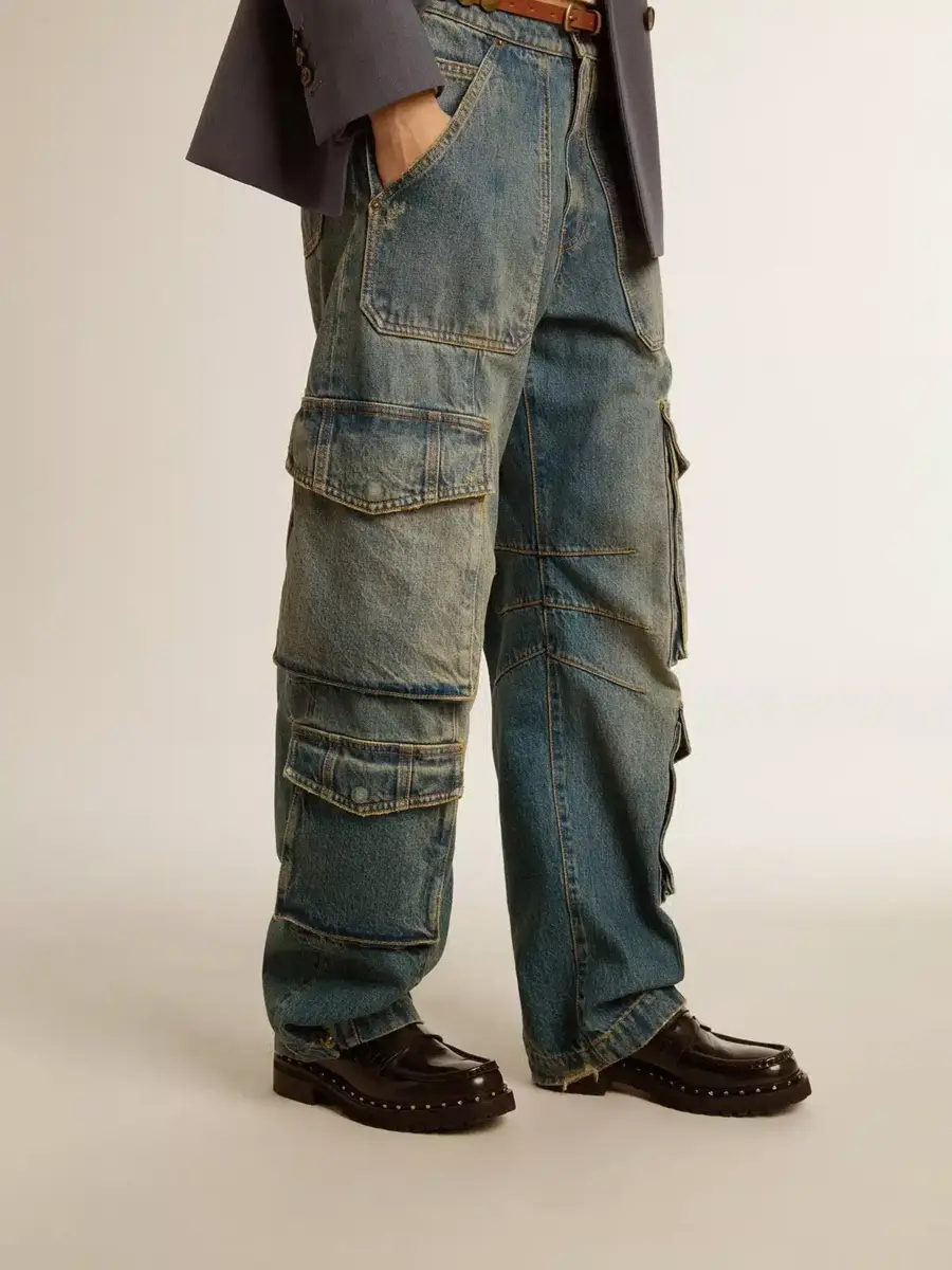 Una oda a Venecia, nuestra casa, vista con los ojos de aquellos soñadores que la viven cada día. La colección Journey explora la ciudad de nuestras raíces, inspirándose en las personas que la habitan. Lugares diferentes e icónicos que ahora se descubren a través de la vida de sus amantes. Estos vaqueros azules de denim con un aspecto desgastado son extremadamente versátiles. En el dobladillo inferior, dos botones permiten ajustar el ancho: puedes elegir una forma de pierna ancha, para llevar con botas o incluso tacones altos, o estrechar ligeramente la pierna para llevar con zapatillas. Los diez bolsillos y las zonas desgastadas a mano en los bordes, inspiradas en los típicos pantalones de trabajo, añaden el toque final.