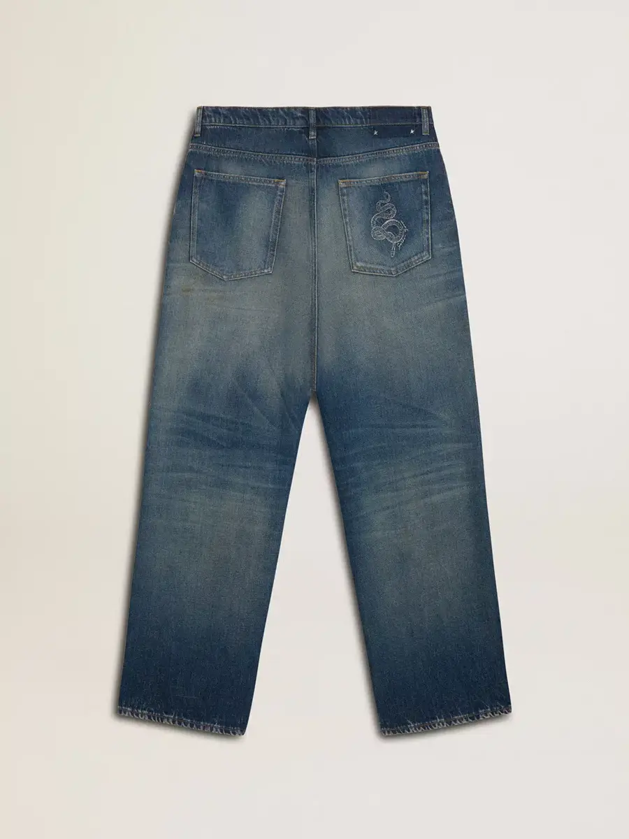 Creados para celebrar el Año Nuevo Chino y el Año de la Serpiente, estos vaqueros representan la transformación y el renacimiento, combinando elegancia y simbolismo en cada detalle. Estos vaqueros de corte holgado y lavado medio cuentan con un bordado de serpiente CNY en el bolsillo trasero. La doble estrella dorada en la parte trasera añade el toque final.