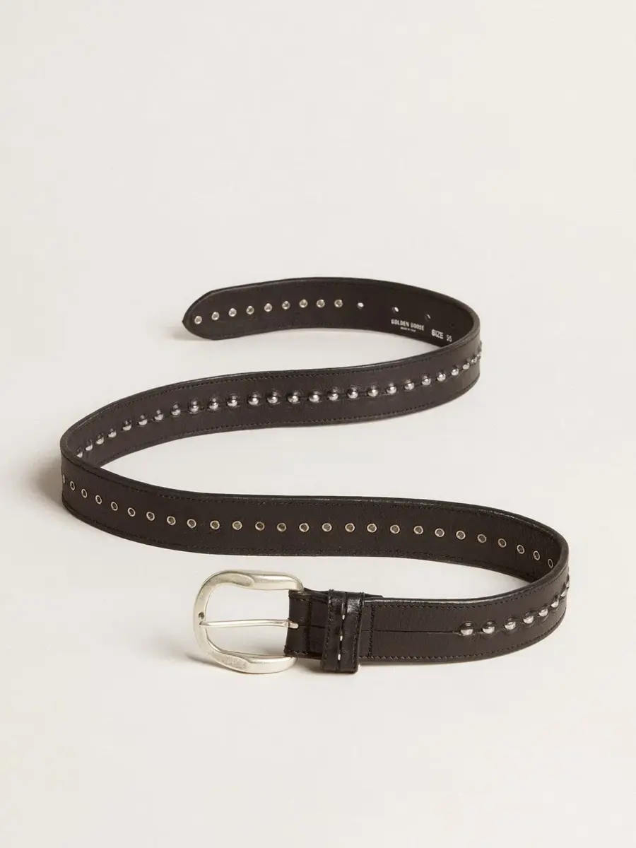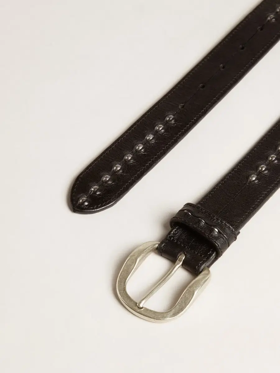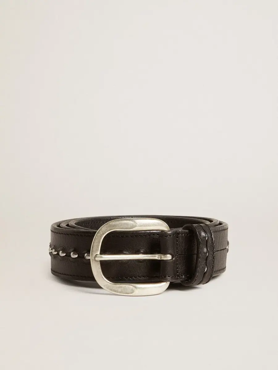Cuando la sencillez se enriquece con detalles únicos. Este modelo, confeccionado en piel lavada en negro envejecido, presenta tachuelas plateadas a lo largo de toda su longitud.