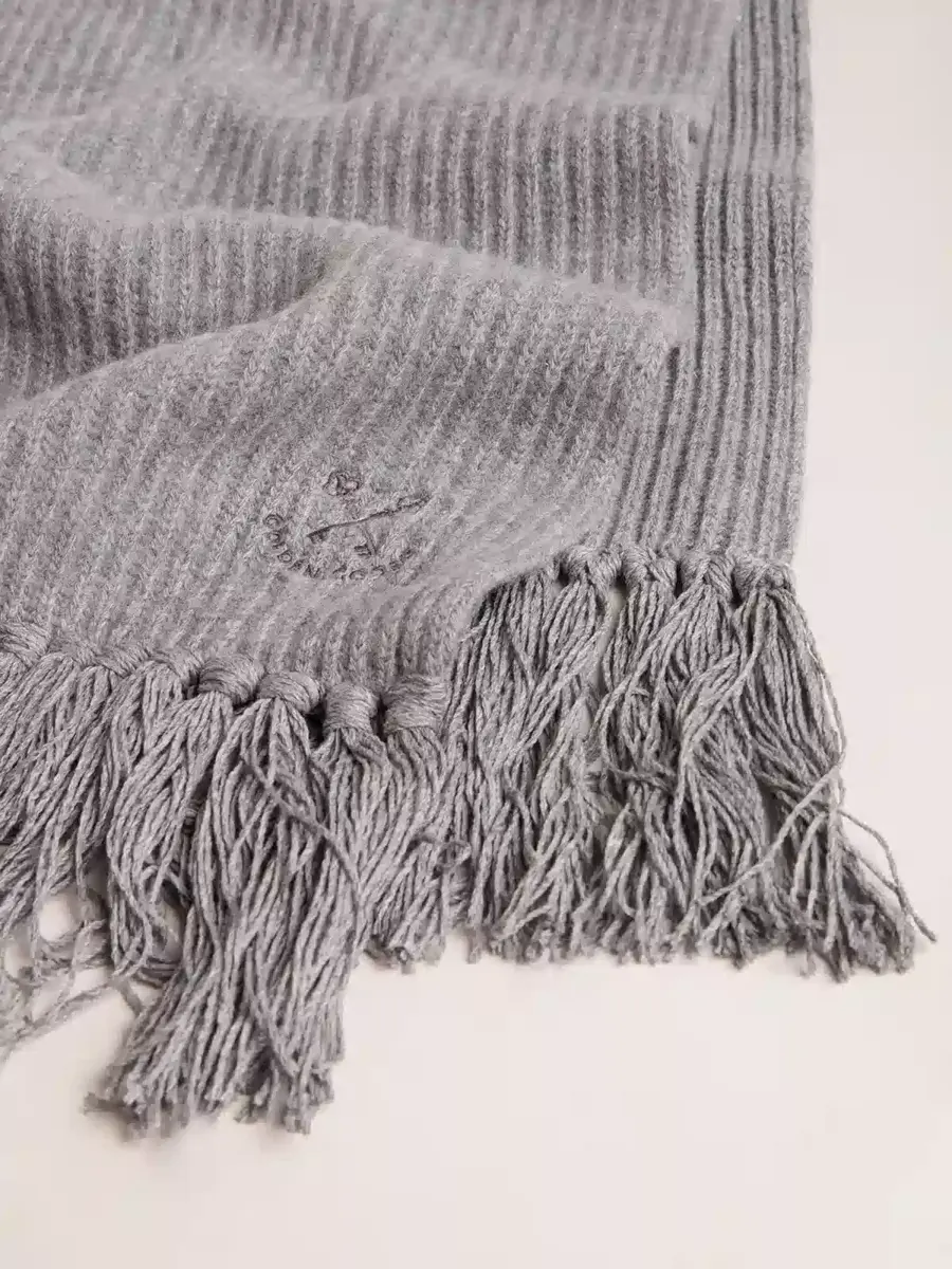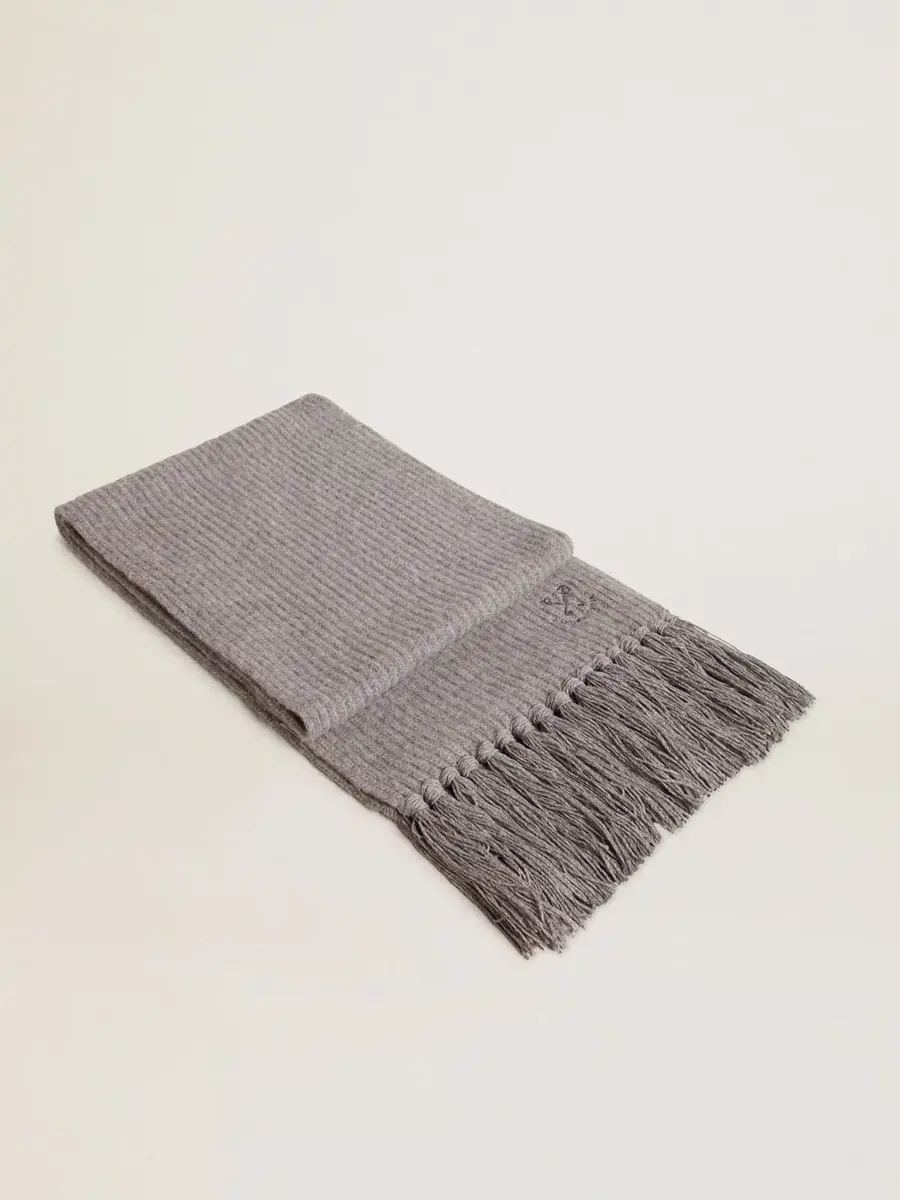 Una historia de amor con nuestra ciudad natal, Marghera. Donde todo comenzó. Nuestra última colección refleja el espíritu de nuestro lugar de origen, sus contrastes, su alma industrial y sus paisajes manufactureros, entrelazando inspiraciones tanto de la vibrante energía de la ropa de trabajo como de la refinada esencia de la sastrería tradicional. Esta bufanda de lana gris jaspeada con ribetes presenta un logotipo bordado en la parte delantera.