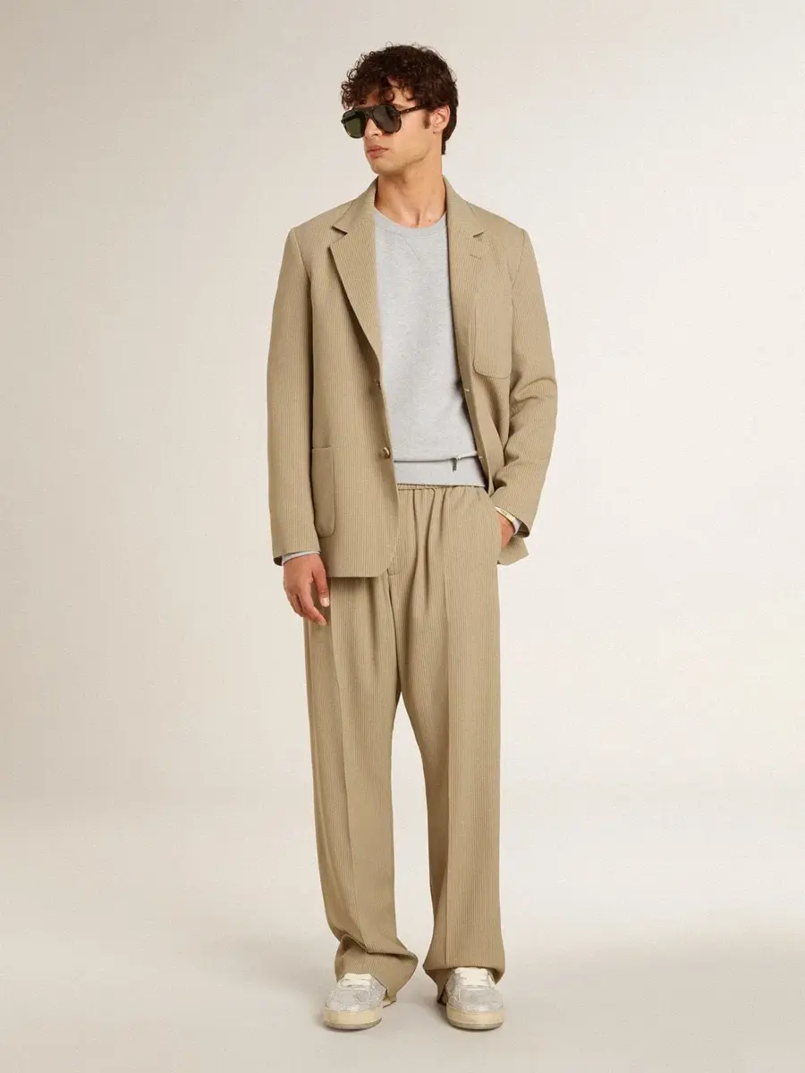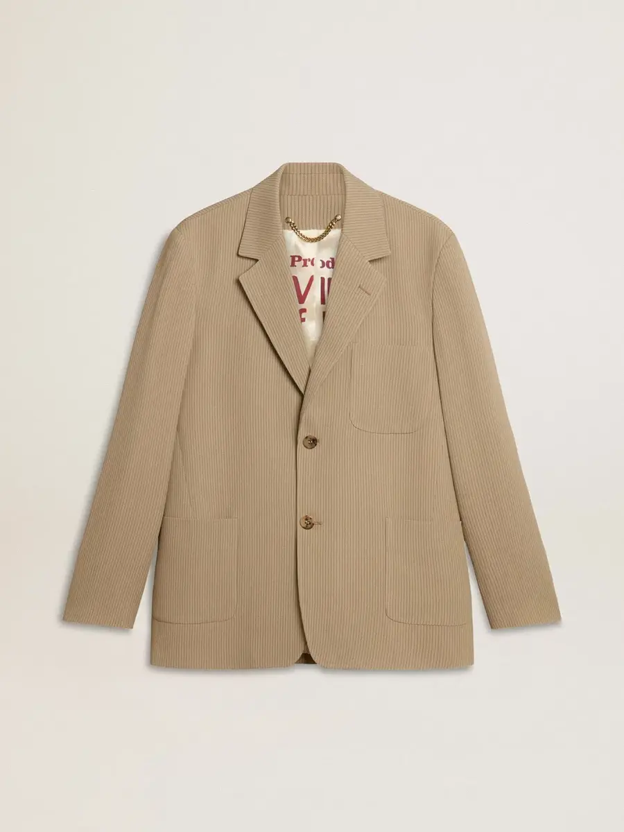 Una colección inspirada en la armonía de la naturaleza, donde cada detalle fluye con naturalidad. Esta chaqueta beige a rayas presenta un corte oversize y tres bolsillos delanteros. El cierre con dos botones de cuerno con el logotipo y el forro interior estampado añaden el toque final.