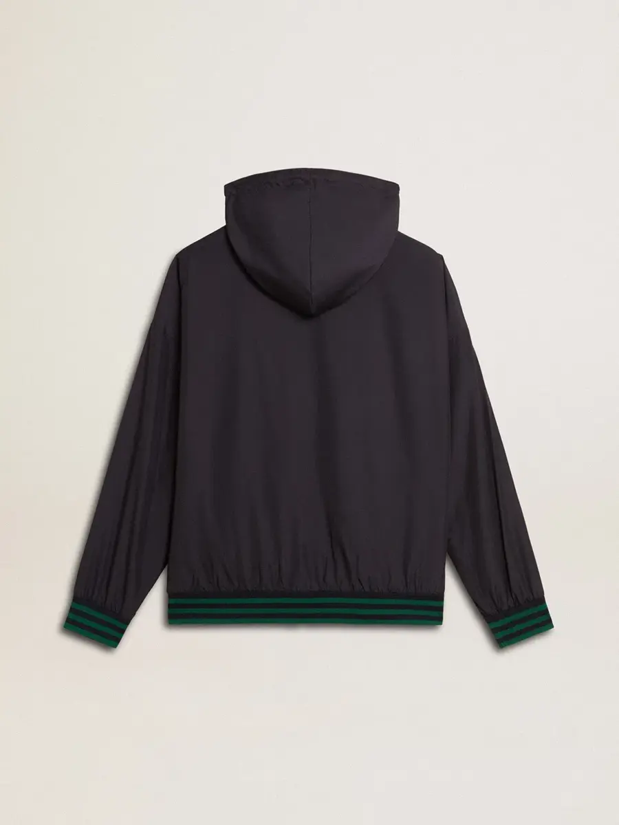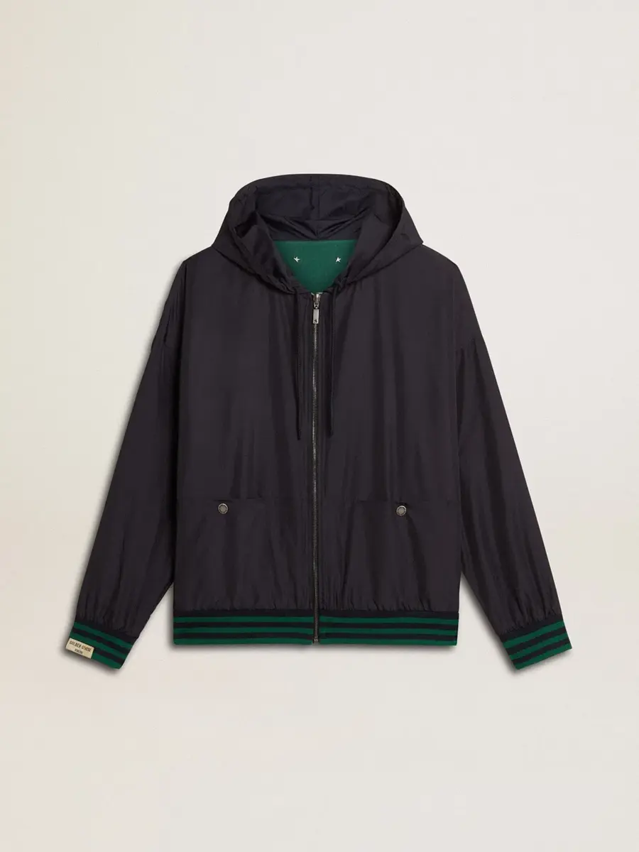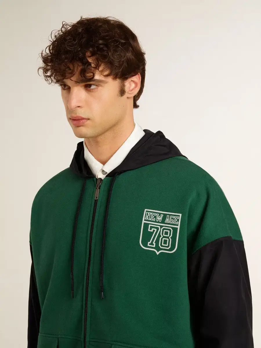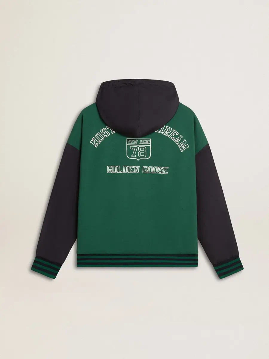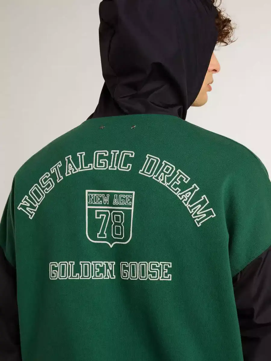 Una colección inspirada en la armonía de la naturaleza, donde cada detalle fluye con naturalidad. Esta sudadera con capucha azul y verde se caracteriza por su reversibilidad: un lado es de algodón orgánico verde con dos bolsillos y estampado, y el otro es de nailon azul impermeable con dos bolsillos. El cierre con cremallera le da el toque final.