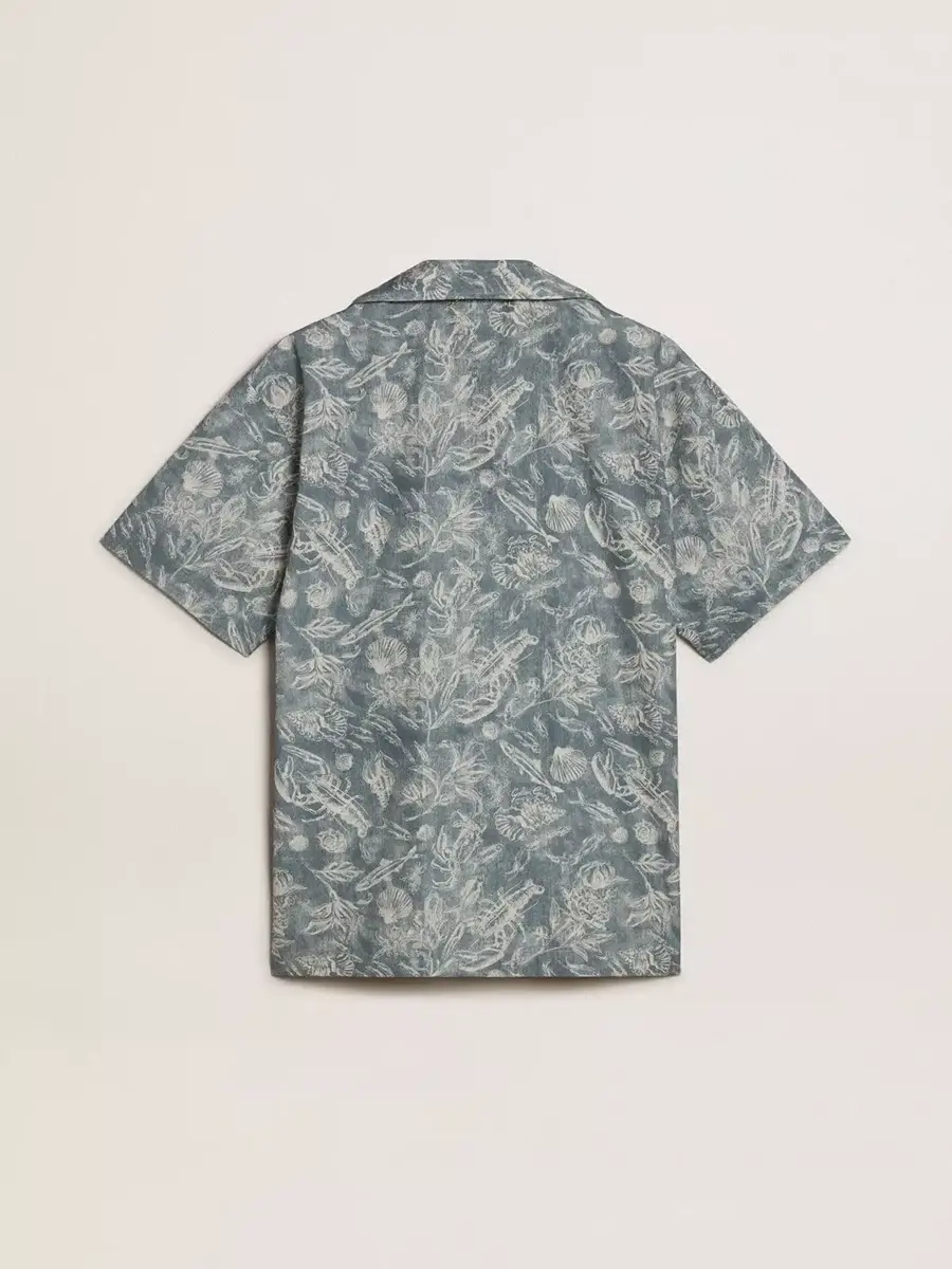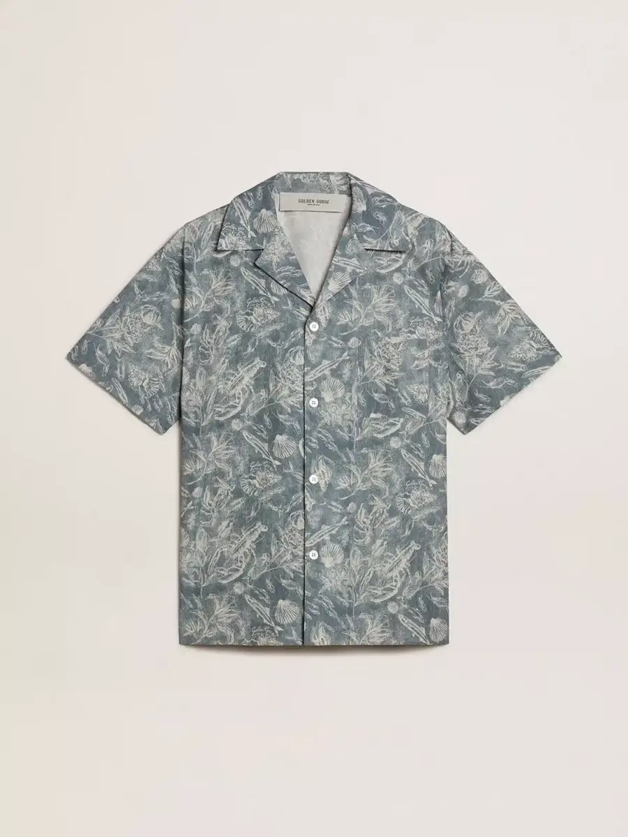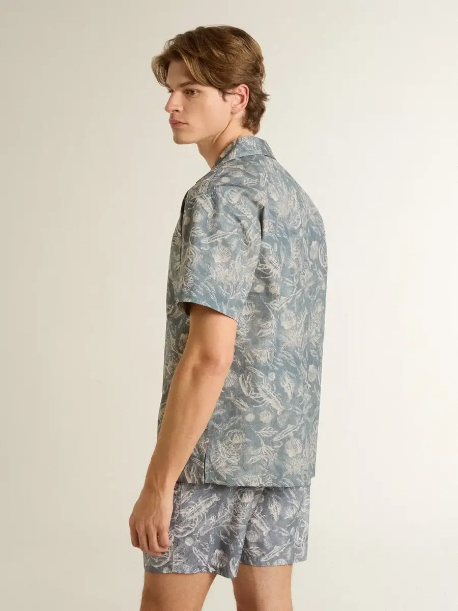 La colección Resort 2025 te invita a ralentizar el ritmo y disfrutar de la belleza natural de la vida mediterránea. Una celebración de las texturas desgastadas, los ritmos relajados y la elegancia discreta que se entreteje en los momentos más sencillos de la vida. Esta camisa de hombre, confeccionada en popelín de algodón, presenta un estampado marinero en tonos azules y blancos. El cuello abierto y el corte recto evocan un estilo atemporal, mientras que el bolsillo delantero con el logotipo de Golden Goose estampado y la doble estrella en la espalda completan el diseño.