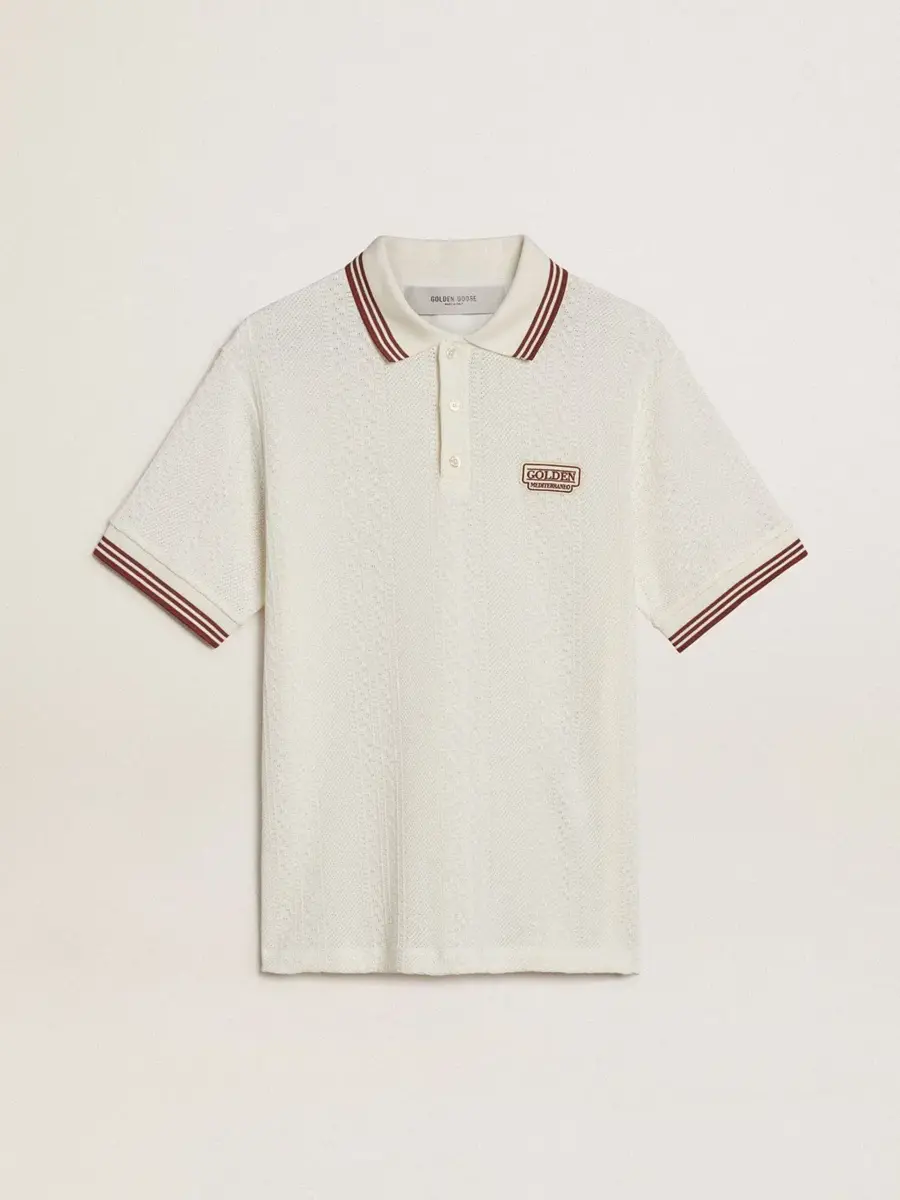 Polo de hombre en punto perforado blanco con detalles de rayas burdeos