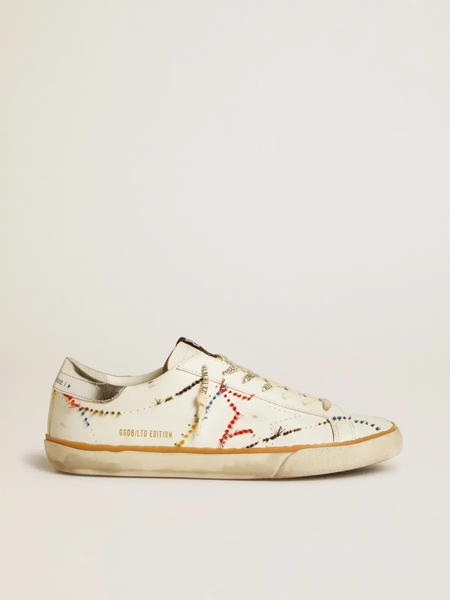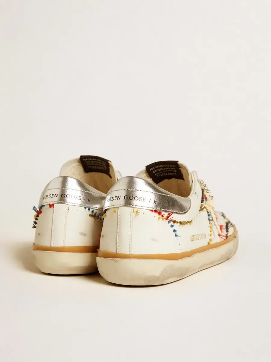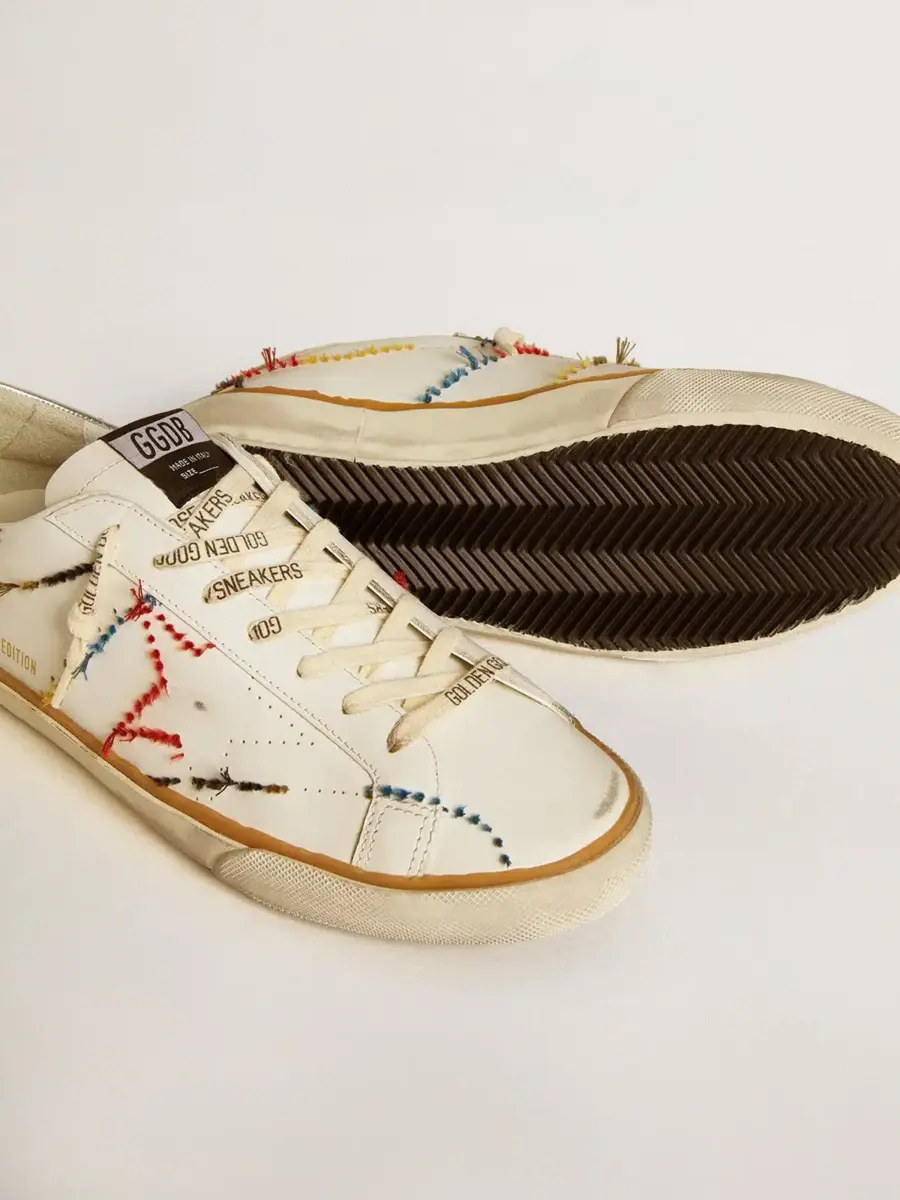 Un icono atemporal, pero en constante evolución. En Golden, nos encanta retomar nuestros clásicos y reelaborarlos constantemente, siempre desde un nuevo ángulo. Estas Super-Star para hombre, con una parte superior de cuero blanco acentuada por bordados multicolores con efecto deshilachado, cuentan con una estrella perforada y una lengüeta metálica plateada en el talón. El ribete beige y los cordones blancos con el logotipo negro en contraste añaden el toque final.