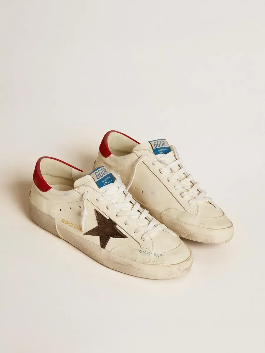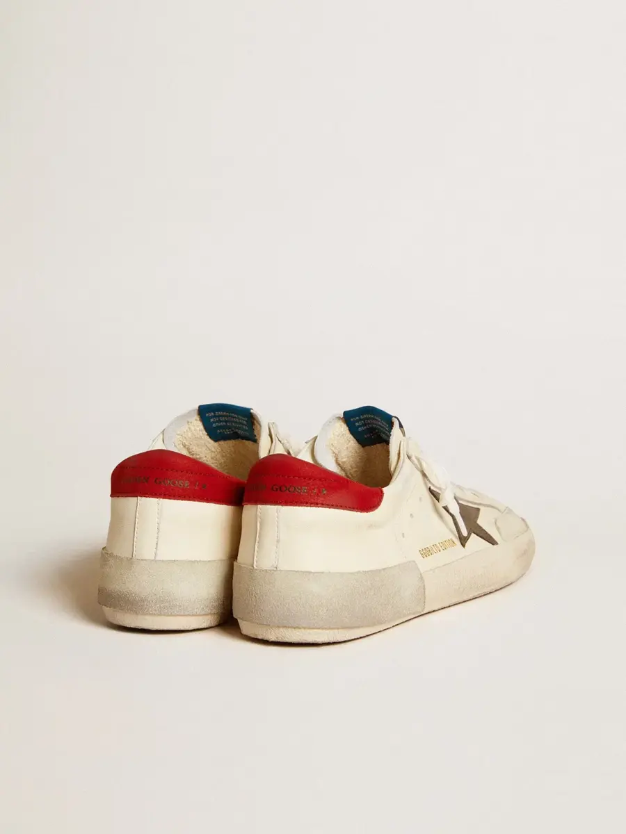Un icono atemporal, pero en constante evolución. En Golden nos encanta retocar nuestros clásicos constantemente, siempre desde un nuevo ángulo. Estas Super-Star con parte superior de napa blanca cuentan con una estrella de cuero metalizado gris oscuro, una lengüeta en el talón de nubuck rojo y doble ribete blanco desgastado. Los cordones blancos añaden el toque final.
