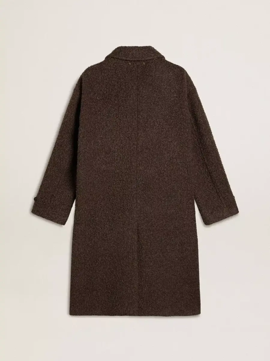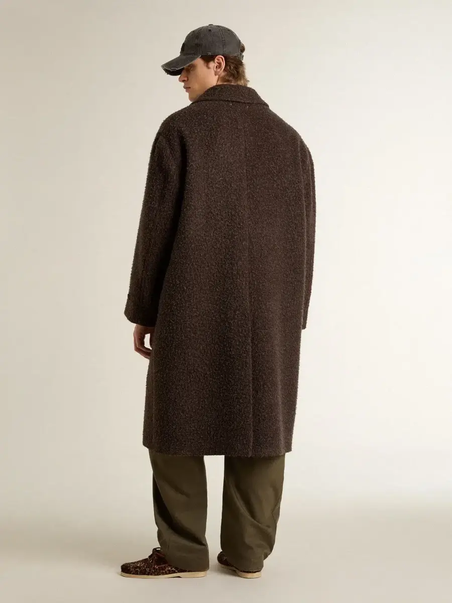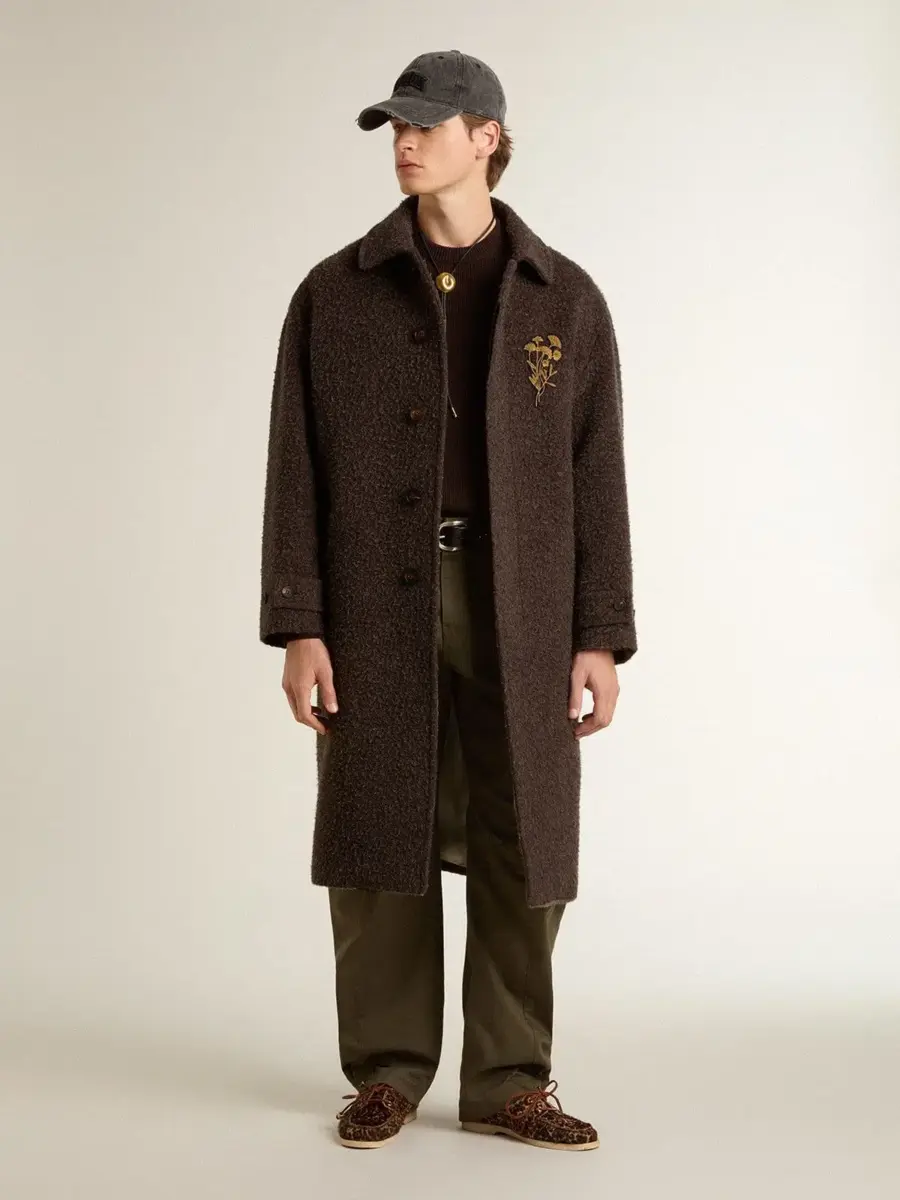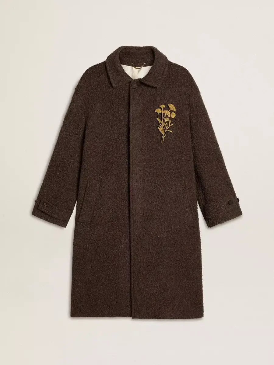 Una colección creada para estar siempre a tu lado, lista para acompañarte en días soleados y aventuras inolvidables. Este abrigo de botonadura sencilla para hombre, una versión contemporánea de un gran clásico, está confeccionado en tejido de mezcla de lana marrón oscuro con efecto arrugado y cuenta con un elegante broche floral en tono bronce en el pecho.