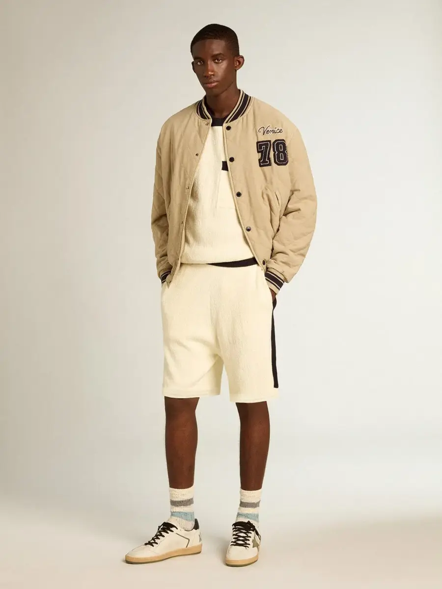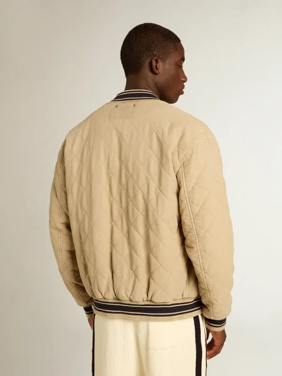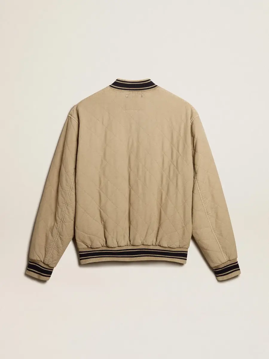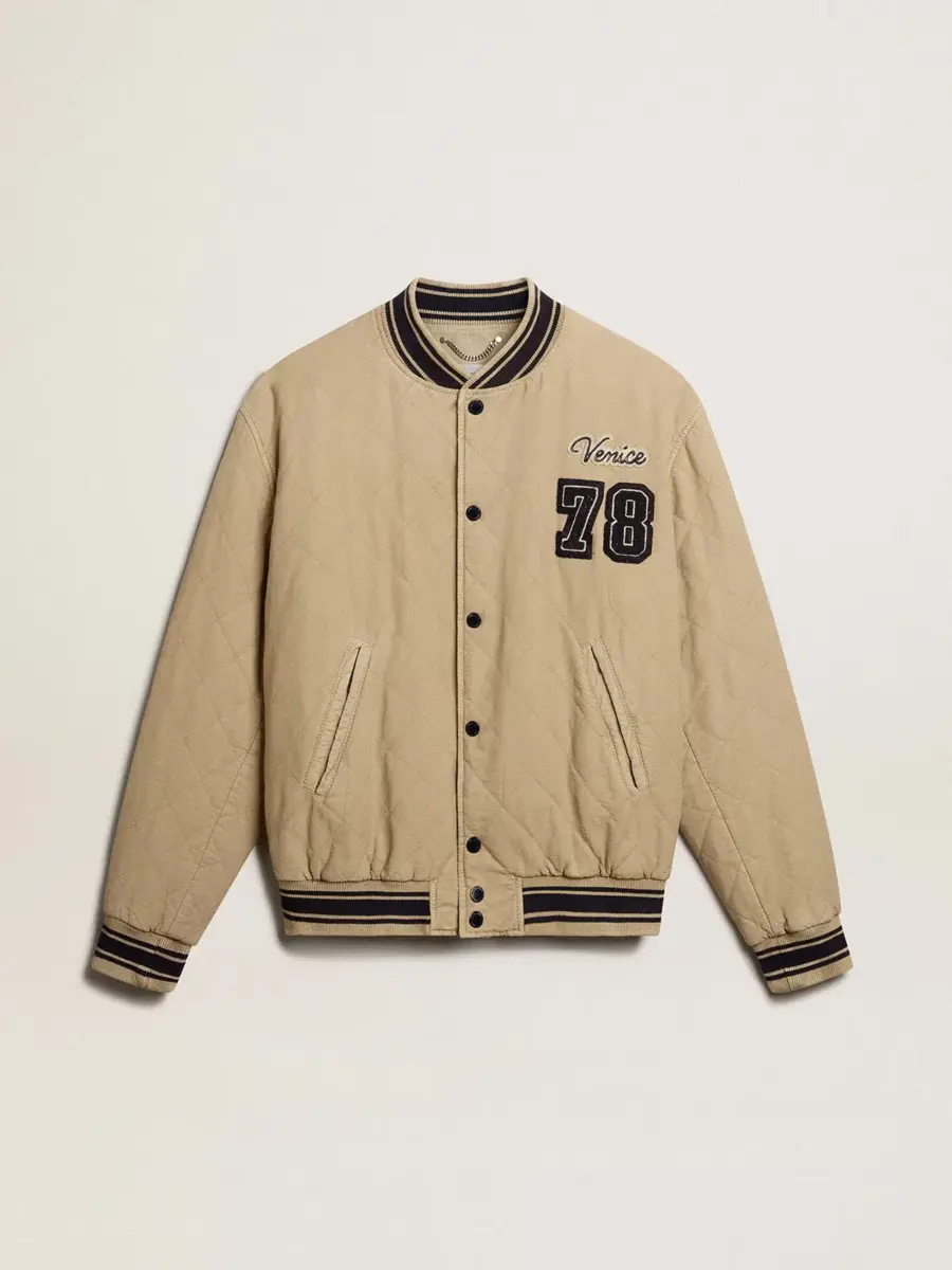 De Venecia, nuestro hogar, a París, nuestro sueño. La colección Journey captura la esencia y la belleza de los momentos cotidianos en la Ciudad de la Luz, inmersa en una atmósfera hipnótica donde la intimidad, la autenticidad y la curiosidad son el alma palpitante de la misma. Confeccionada en algodón acolchado en forma de rombos, esta chaqueta bomber caqui de corte clásico cuenta con un ligero acolchado y un parche de fieltro con bordado en la parte delantera.