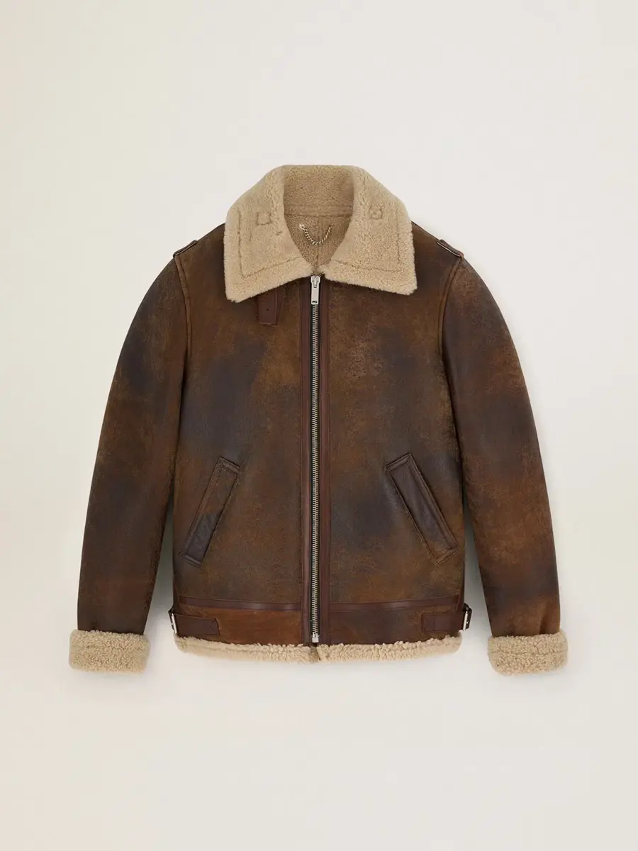 Una colección que da vida a un viaje único en busca de nuestro verdadero hogar, la naturaleza. Una historia que comienza con los elementos naturales y toma forma a través de texturas, colores y emociones íntimas. Esta chaqueta de cuero marrón oscuro presenta detalles de piel de oveja en contraste en el cuello y los puños, y un forro de piel de oveja.