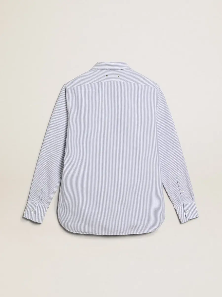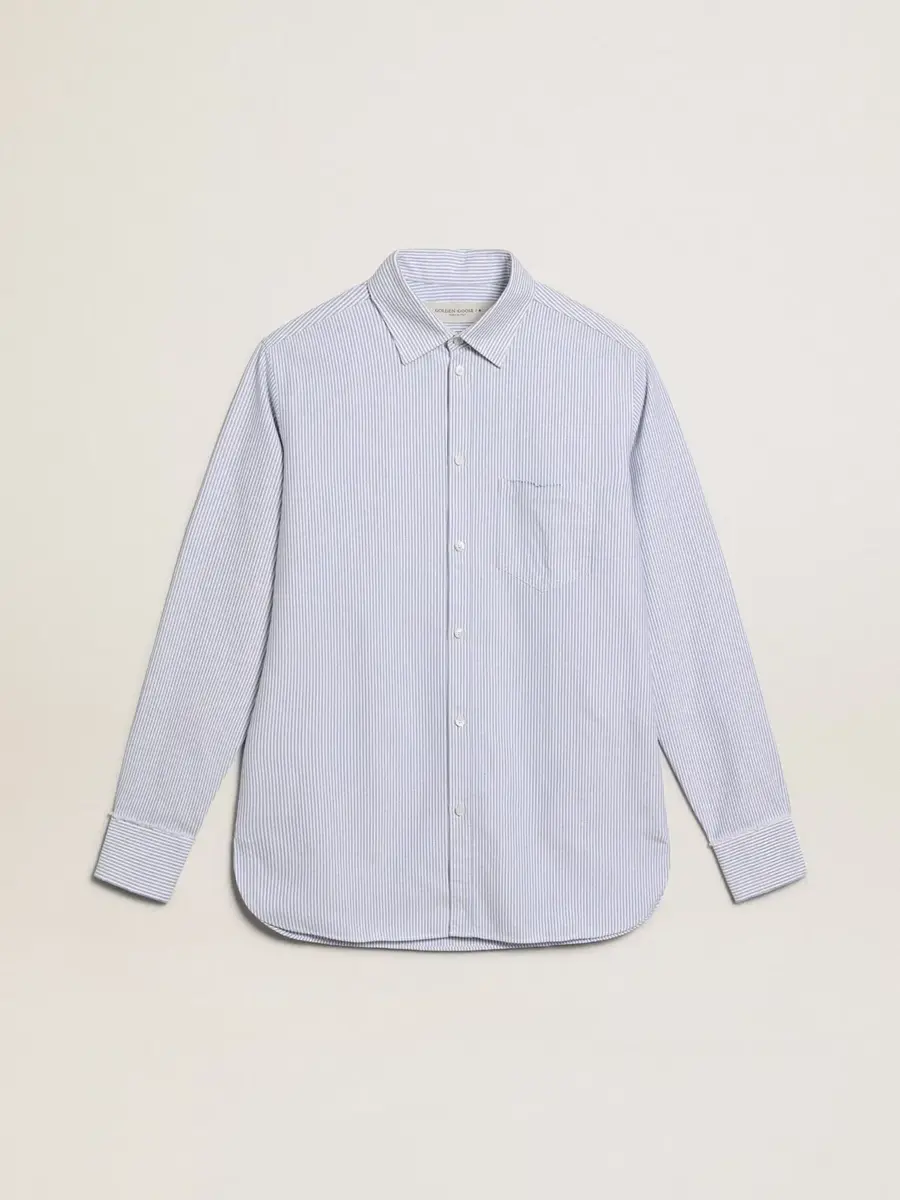 Una colección única y atemporal que encapsula el ADN de Golden Goose, diseñada para acompañarte cada día, en las buenas y en las malas, llueva o haga sol. Confeccionada en algodón blanco con un tratamiento desgastado, esta camisa de corte regular para hombre presenta rayas azules claras.