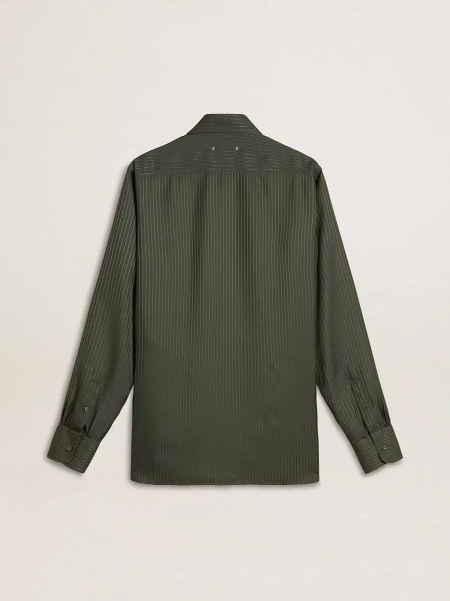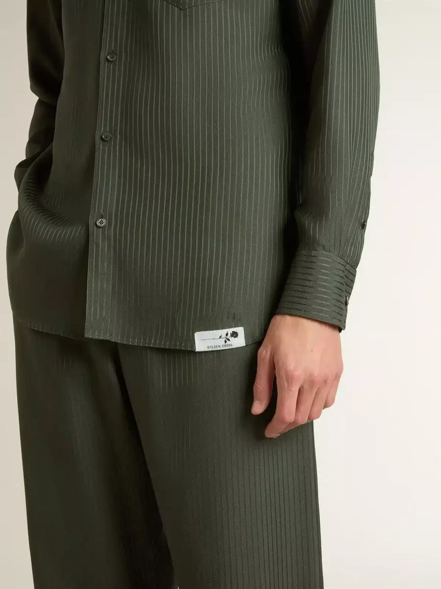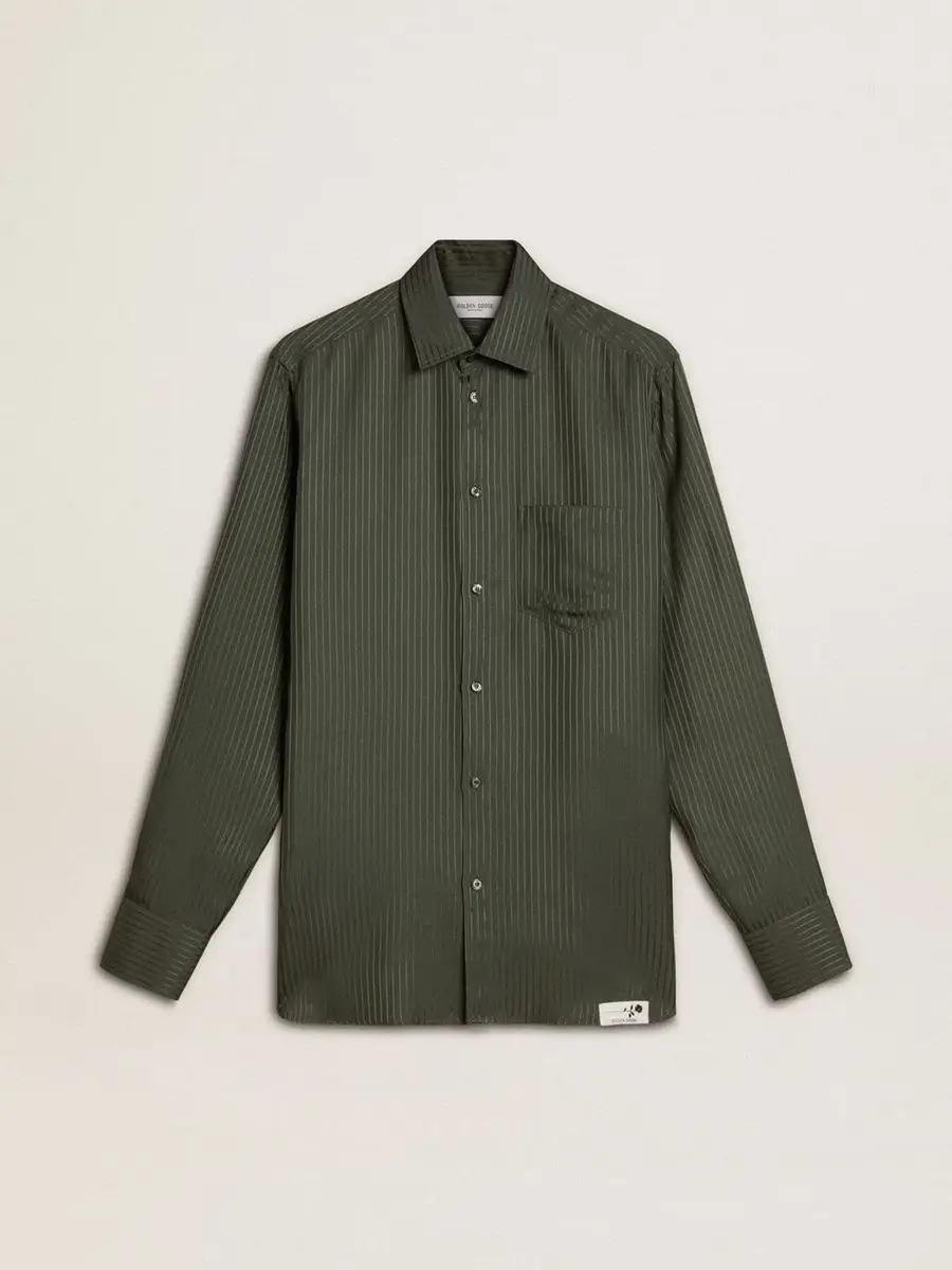 Inspirada en los icónicos años setenta, el espíritu desenfadado de esa época cobra vida con el primer lanzamiento de nuestra colección Otoño/Invierno 25. Esta camisa de hombre en verde oscuro suave presenta un estampado de rayas verticales y un bolsillo en el pecho. La etiqueta blanca con la marca en el dobladillo y dos pequeñas estrellas le dan el toque final.