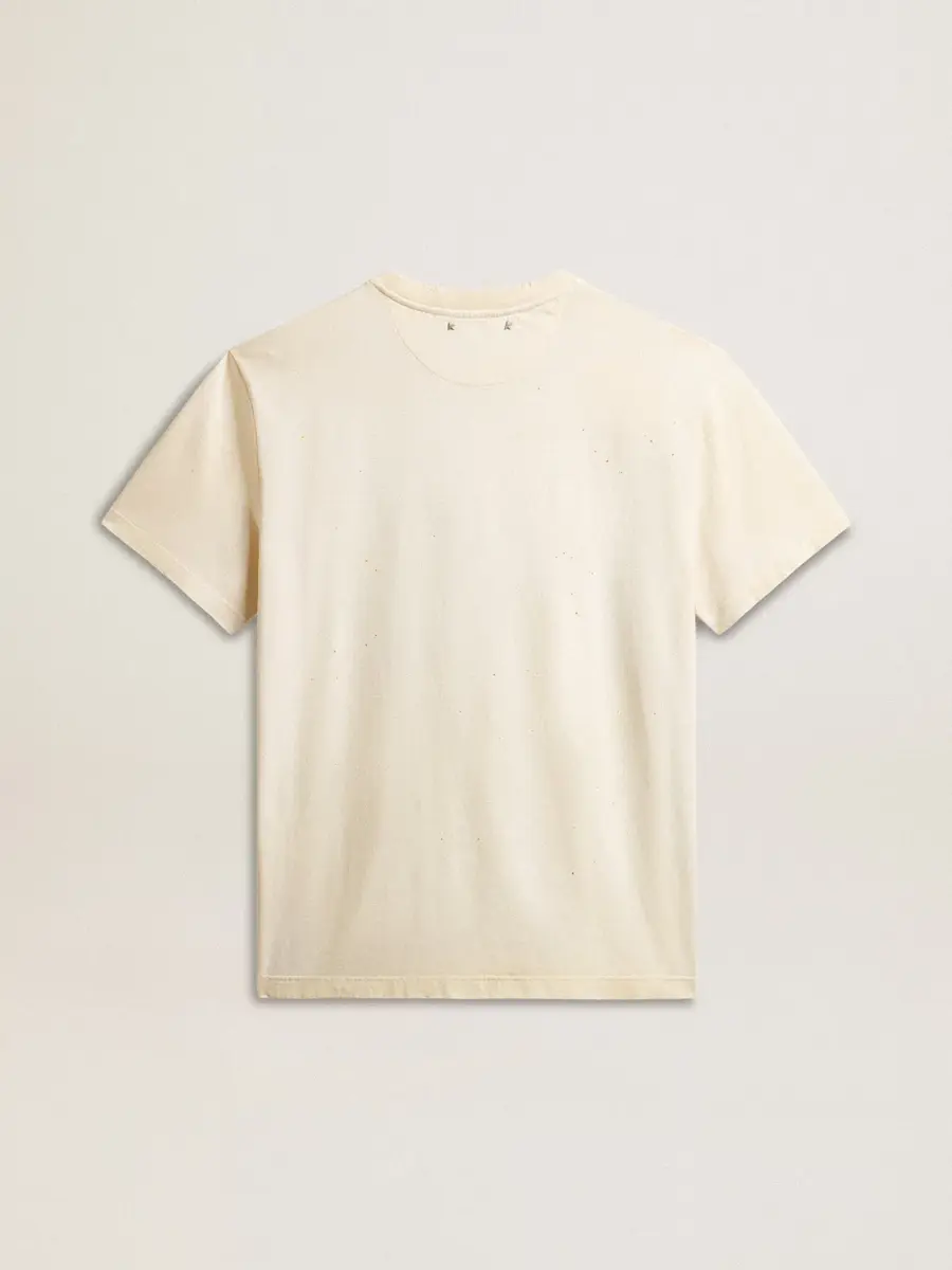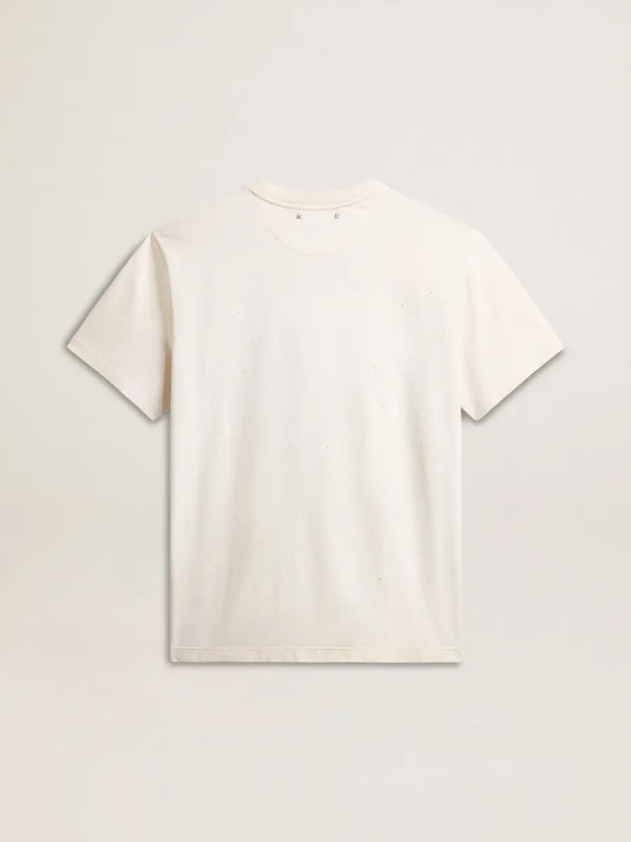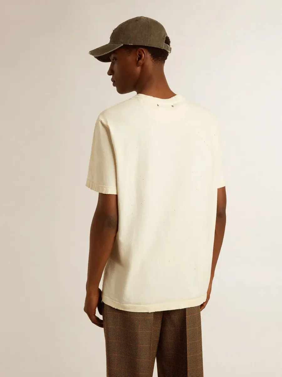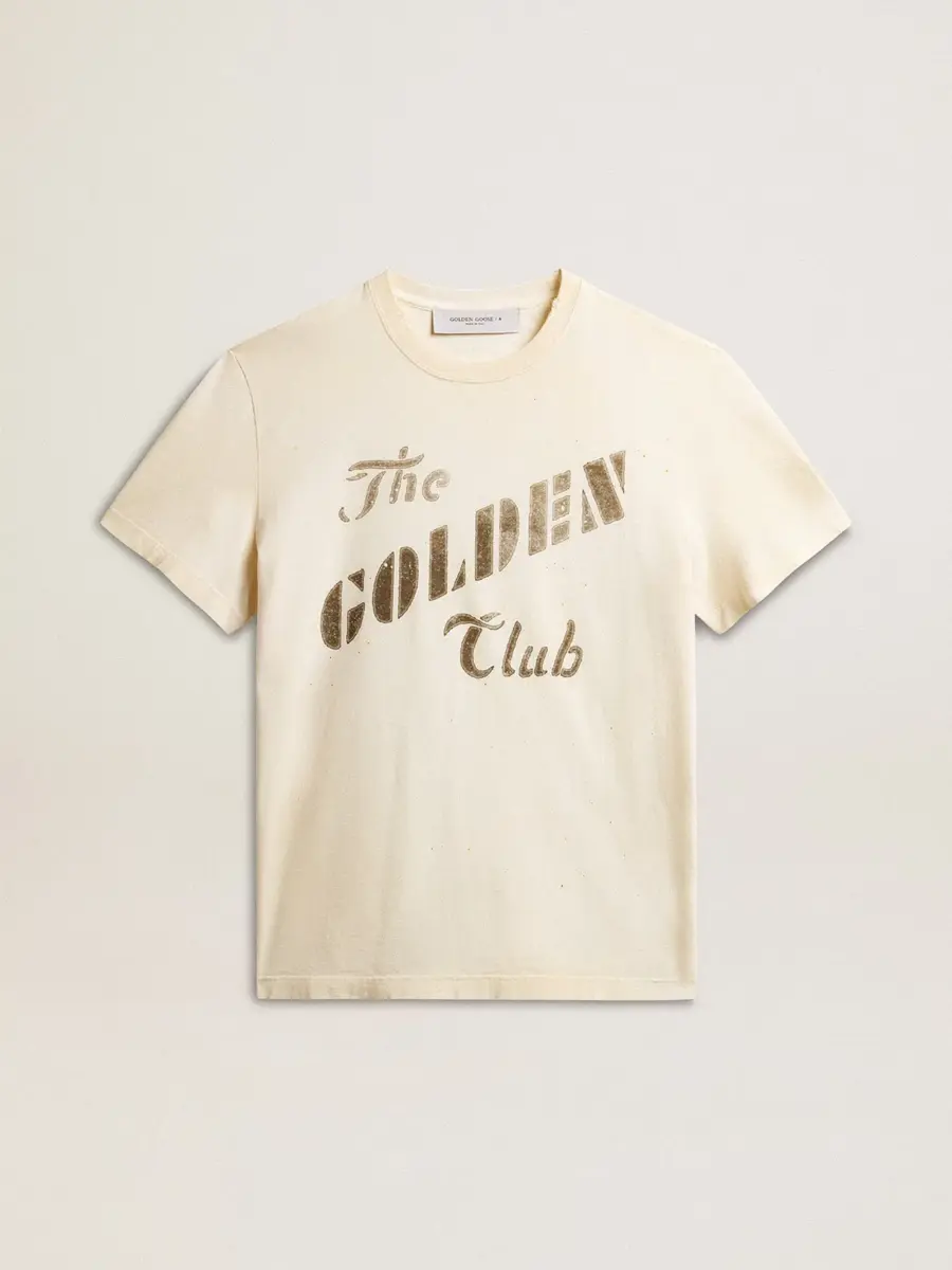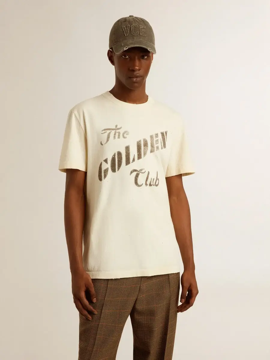 Una historia de amor con nuestra ciudad natal, Marghera. Donde todo comenzó. Nuestra última colección refleja el espíritu de nuestro lugar de origen, sus contrastes, su alma industrial y sus paisajes manufactureros, entrelazando inspiraciones tanto de la vibrante energía de la ropa de trabajo como de la refinada esencia de la sastrería tradicional. Confeccionada en jersey de algodón blanco envejecido, esta camiseta para hombre presenta un estampado dorado «The Golden Club» en acuarela en la parte delantera. Como toque final, los detalles desgastados en el cuello, los bordes y las mangas añaden un efecto vivido a la prenda.