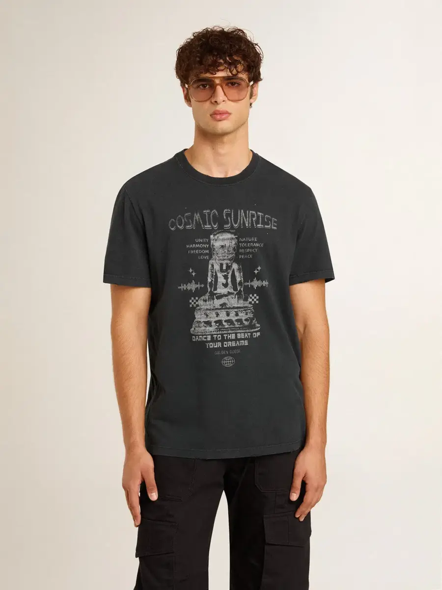Inspirada en la energía eléctrica de los años noventa, la colección celebra el poder ilimitado de los sueños compartidos. Movidos por la pasión, cada diseño captura el significado de la unión y el poder de la música. En color negro desgastado, esta camiseta de algodón presenta el estampado de temporada Cosmic Sunrise, en blanco, en la parte delantera.