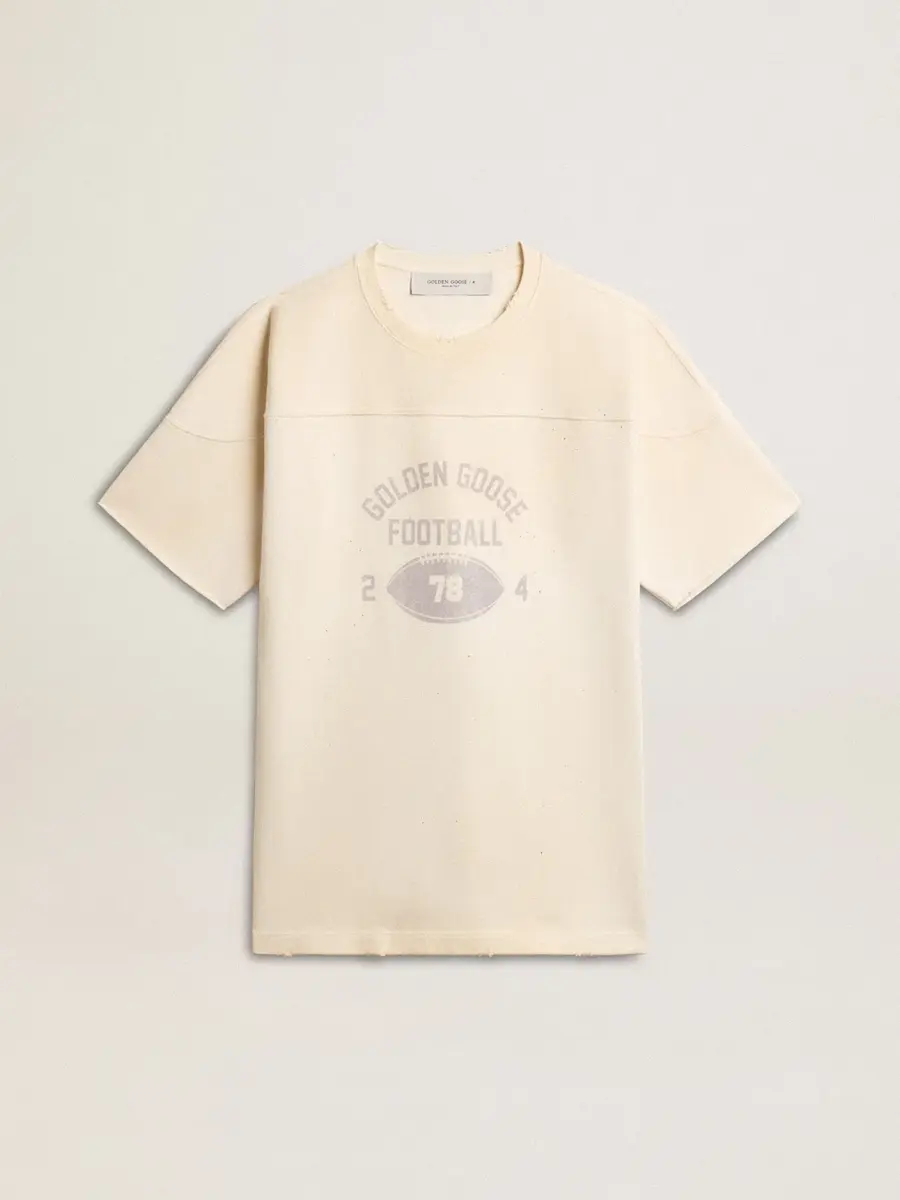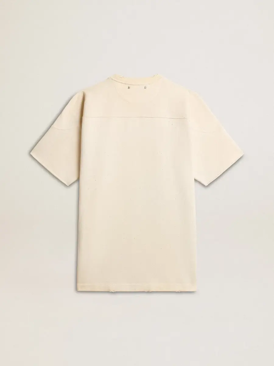 Una historia de amor dedicada a nuestra ciudad natal, Marghera. Donde todo comenzó. Nuestra última colección refleja el espíritu de nuestro lugar de origen, sus contrastes, su alma industrial y sus paisajes manufactureros, entrelazando inspiraciones tanto de la vibrante energía de la ropa de trabajo como de la refinada esencia de la sastrería tradicional. Confeccionada en jersey de algodón blanco envejecido, esta camiseta para hombre presenta un borde sin rematar en el pecho, los hombros y las mangas que divide la prenda en dos partes. El toque final lo dan el estampado de efecto vintage en la parte delantera y los detalles desgastados en el cuello, los bordes y las mangas, que le dan un aspecto vivido a la prenda.