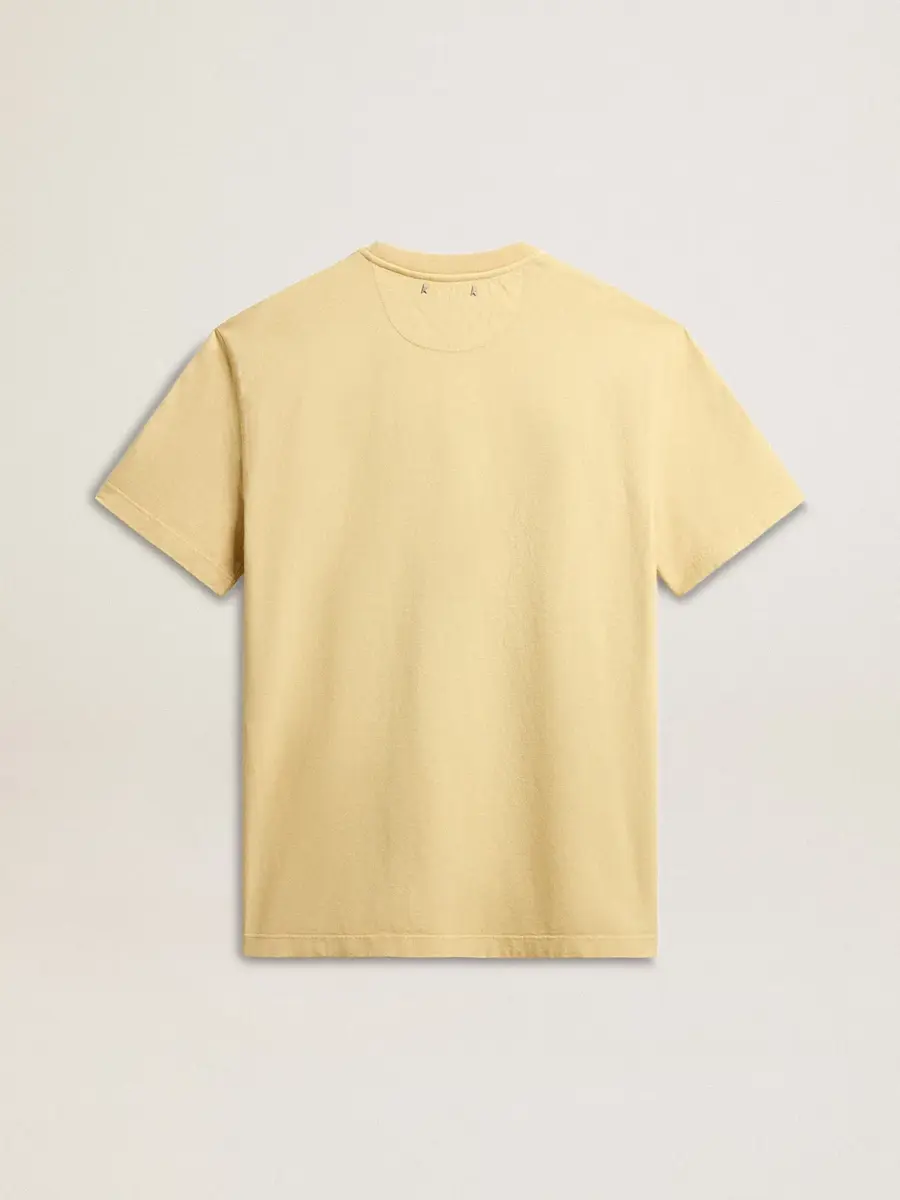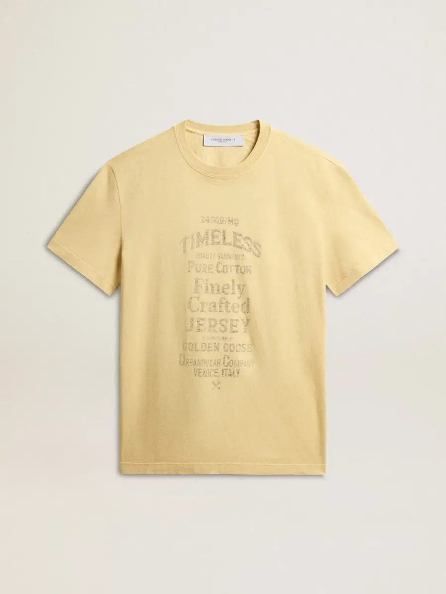 Una historia de amor a nuestra tierra natal, Marghera. Donde todo comenzó. Nuestra última colección refleja el espíritu de nuestro lugar de origen, sus contrastes, su alma industrial y sus paisajes manufactureros, entrelazando inspiraciones tanto de la vibrante energía de la ropa de trabajo como de la refinada esencia de la sastrería tradicional. Con un corte regular, esta camiseta de cuello redondo para hombre en jersey de algodón amarillo pálido presenta una inscripción de temporada estampada en el interior para crear un efecto descolorido en el exterior.