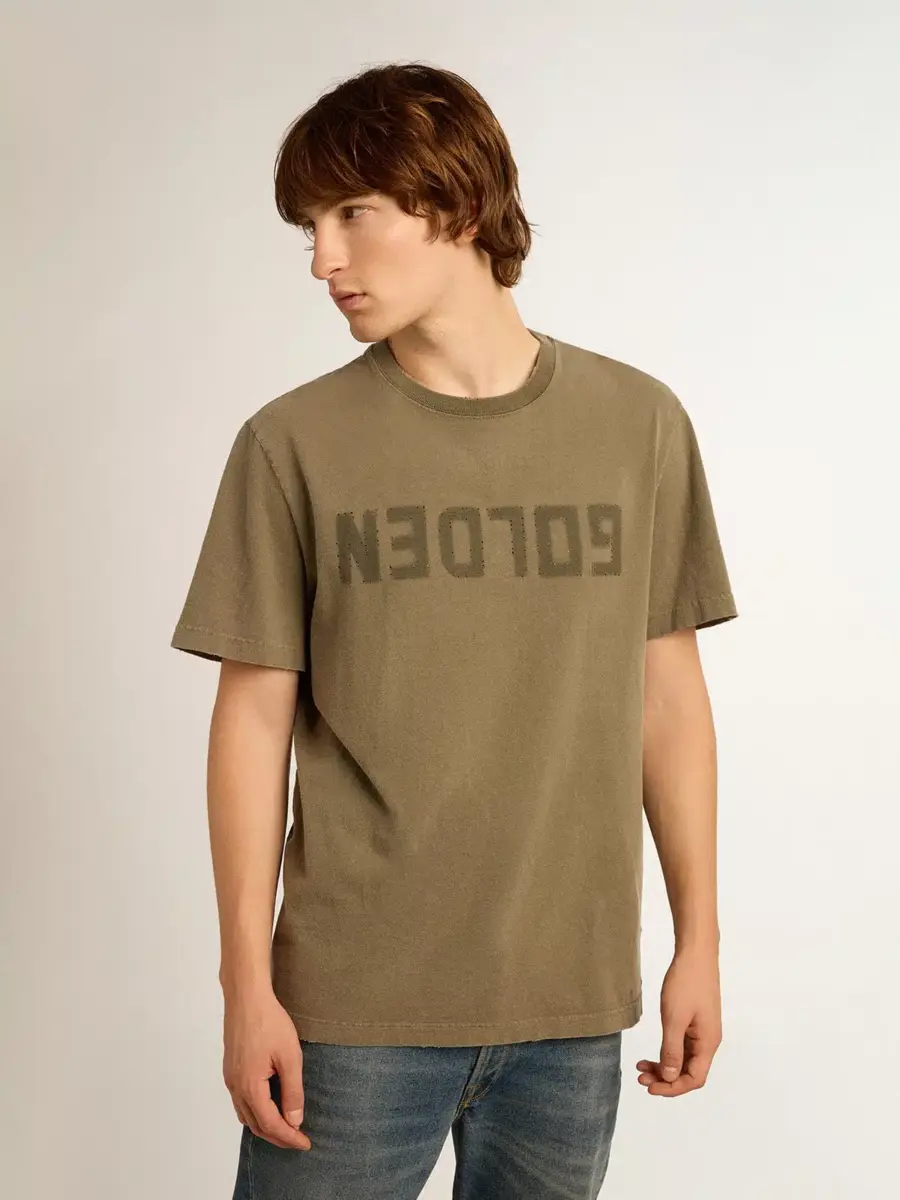 Una colección única y atemporal que encapsula el ADN de Golden Goose, diseñada para acompañarte cada día, en las buenas y en las malas, llueva o haga sol. Esta camiseta de cuello redondo y corte recto en algodón puro verde oliva presenta un efecto desgastado y letras doradas tono sobre tono en la parte delantera.