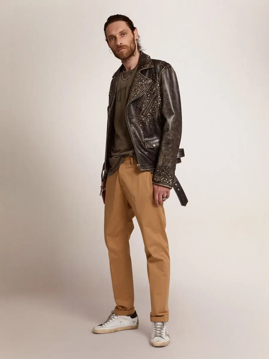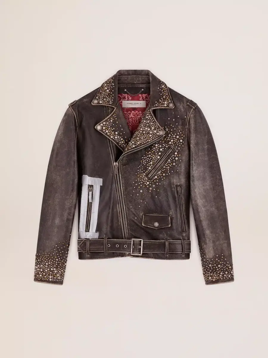 Una colección única y atemporal que engloba la esencia de Golden Goose, diseñada para acompañarte cada día y compartir tus alegrías y tus penas, llueva o haga sol. Confeccionada con nuestra tradicional piel de toro, esta chaqueta motera de corte recto presenta tachuelas martilladas, cinta adhesiva y un tratamiento desgastado. El forro con estampado de cachemira burdeos le da el toque final.