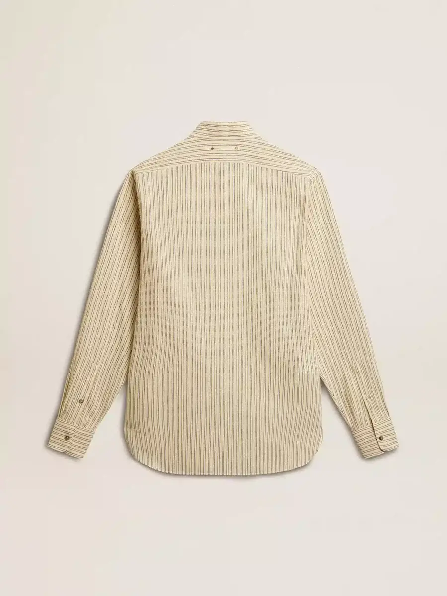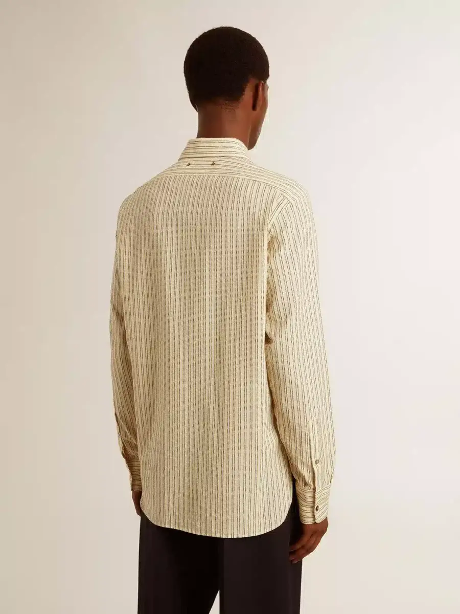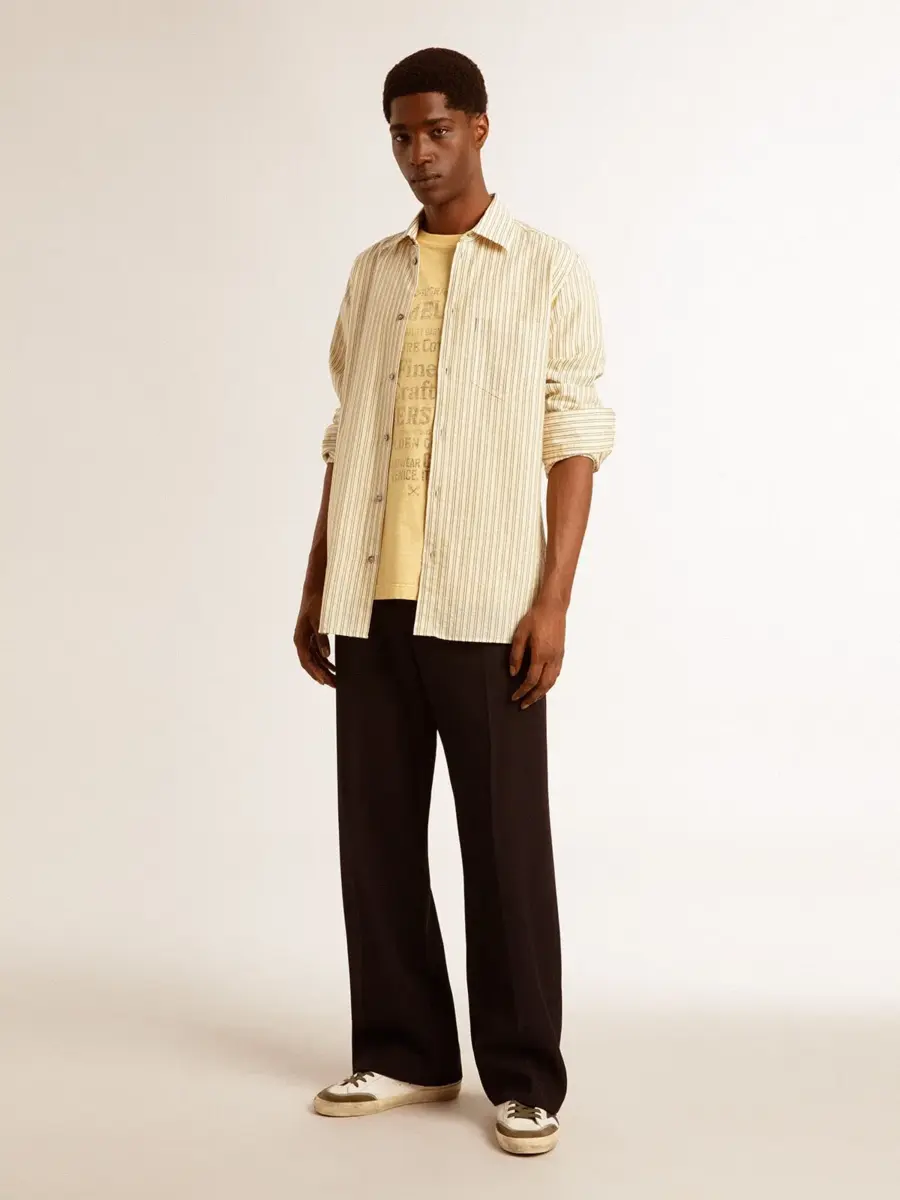 Una historia de amor con nuestra ciudad natal, Marghera. Donde todo comenzó. Nuestra última colección refleja el espíritu de nuestro lugar de origen, sus contrastes, su alma industrial y sus paisajes manufactureros, entrelazando inspiraciones tanto de la vibrante energía de la ropa de trabajo como de la refinada esencia de la sastrería tradicional. Esta camisa de corte regular para hombre, confeccionada en algodón puro crudo, presenta un motivo jacquard de finas rayas negras en toda la prenda y un bolsillo en la parte delantera.