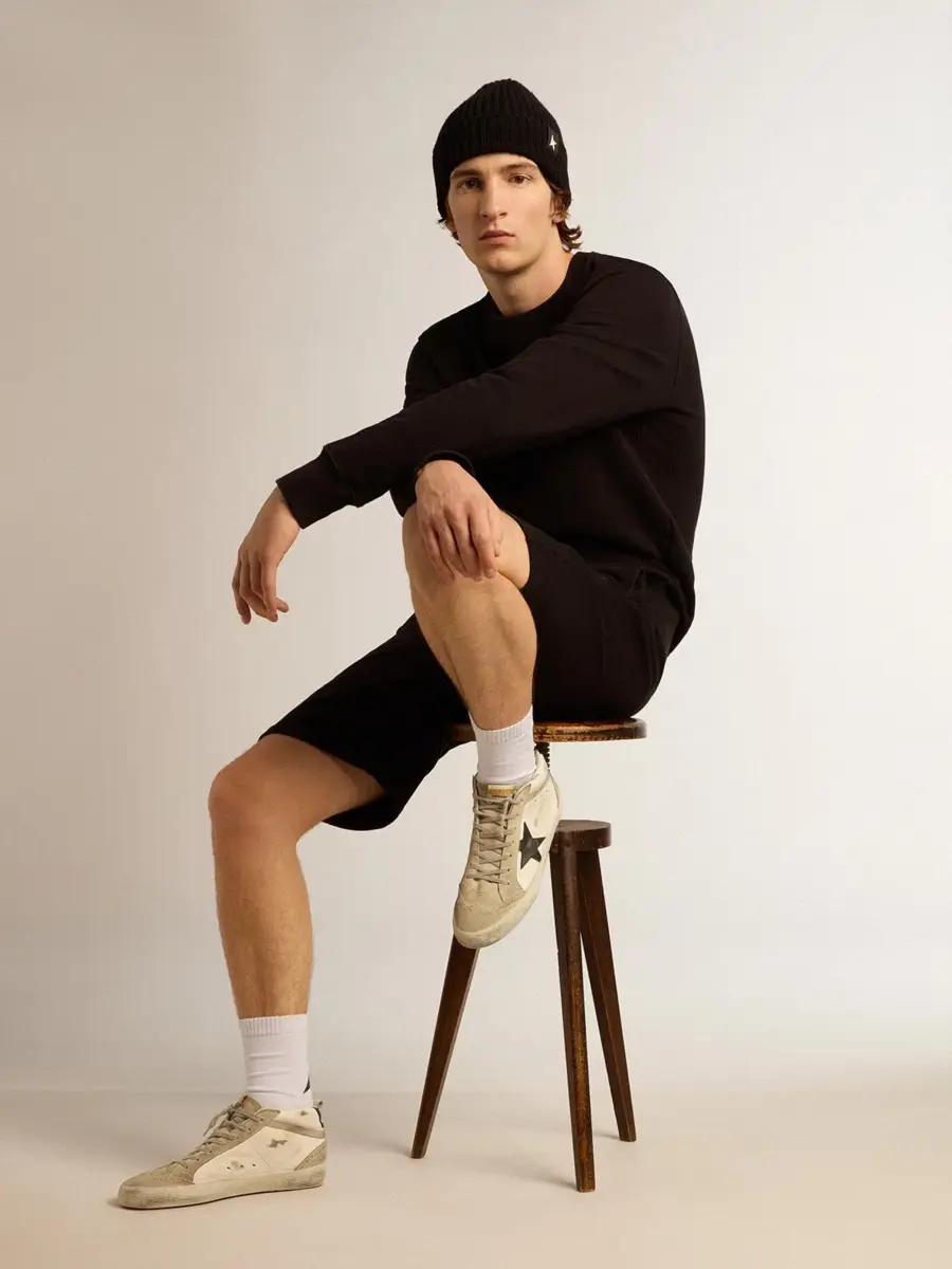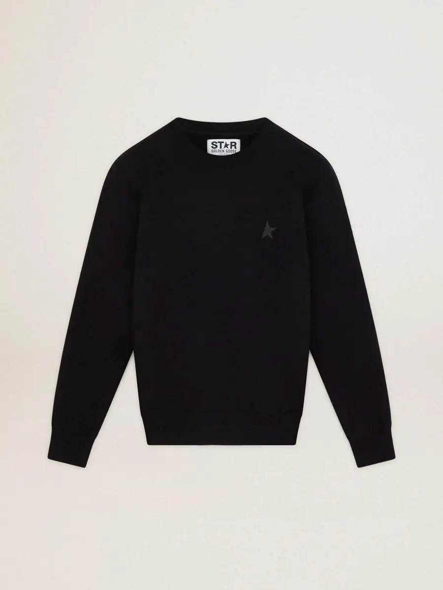 Una colección con un espíritu informal pero versátil: inspirada en los años setenta, tiene un atractivo vintage atemporal, adecuado para cualquier ocasión o look. Esta sudadera de cuello redondo y corte recto en algodón puro negro presenta una estrella tono sobre tono en la parte delantera.