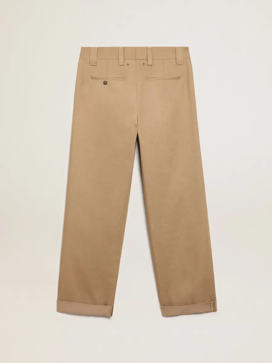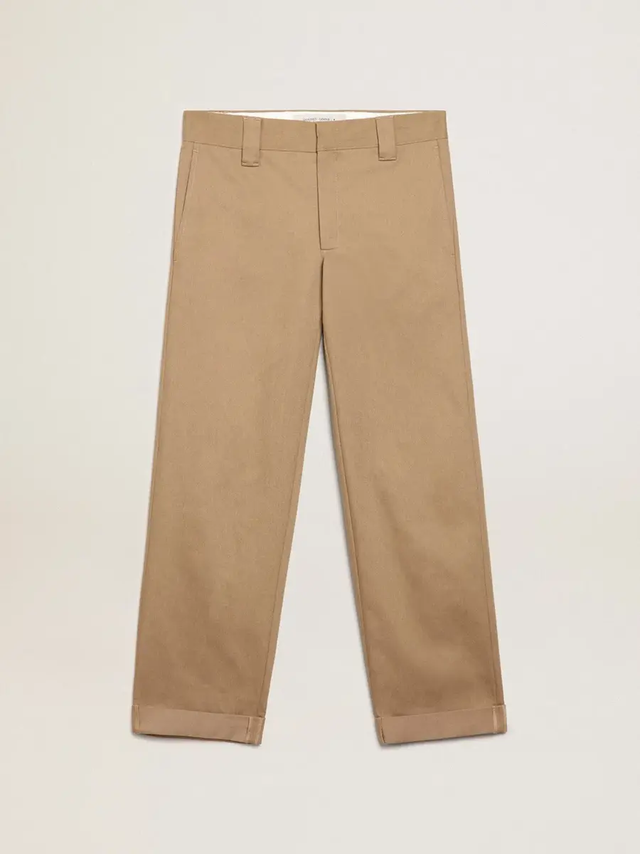 Una colección única y atemporal que encapsula el ADN de Golden Goose, diseñada para acompañarte cada día, en las buenas y en las malas, llueva o haga sol. Estos pantalones chinos beige caqui presentan un corte recto y dos bolsillos delanteros.