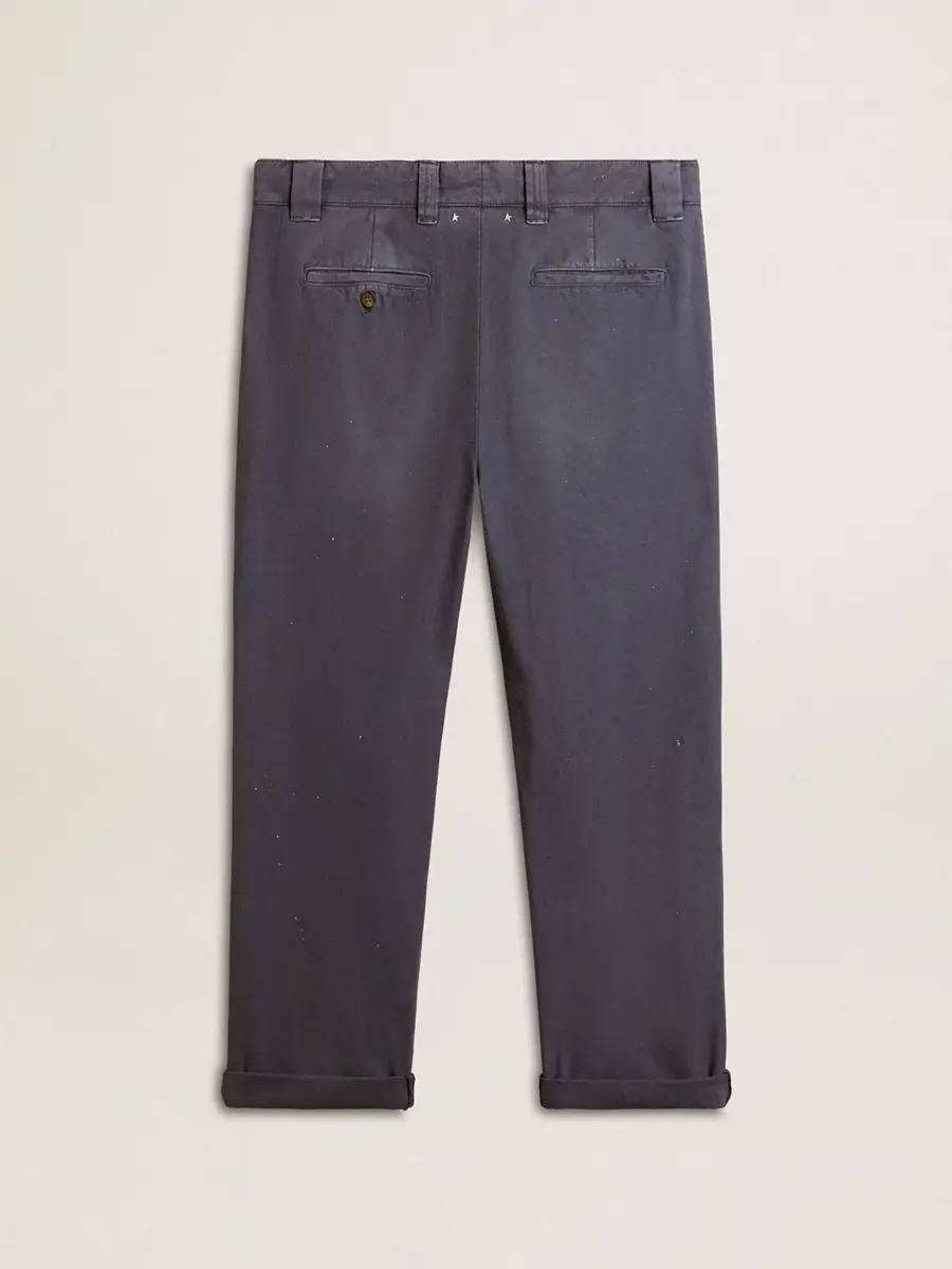 Una historia de amor con nuestra ciudad natal, Marghera. Donde todo comenzó. Nuestra última colección refleja el espíritu de nuestro lugar de origen, sus contrastes, su alma industrial y sus paisajes manufactureros, entrelazando inspiraciones tanto de la vibrante energía de la ropa de trabajo como de la refinada esencia de la sastrería tradicional. Estos pantalones chinos de algodón azul utilizan deliberadamente el tejido del revés y presentan una pierna recta y dos bolsillos delanteros. Las salpicaduras de blanco añaden el toque final, dando a la prenda un efecto desgastado.