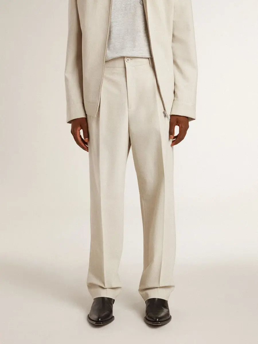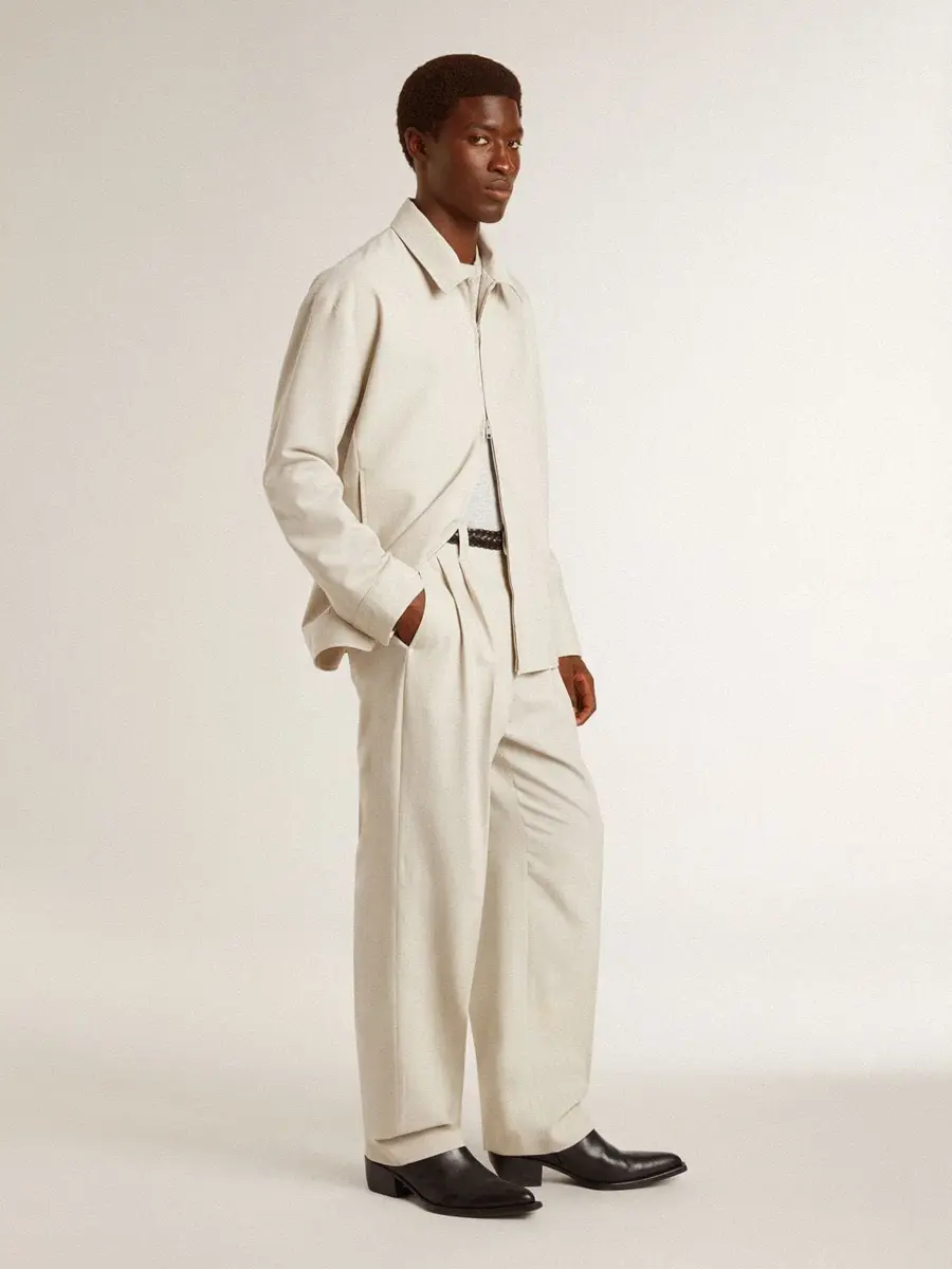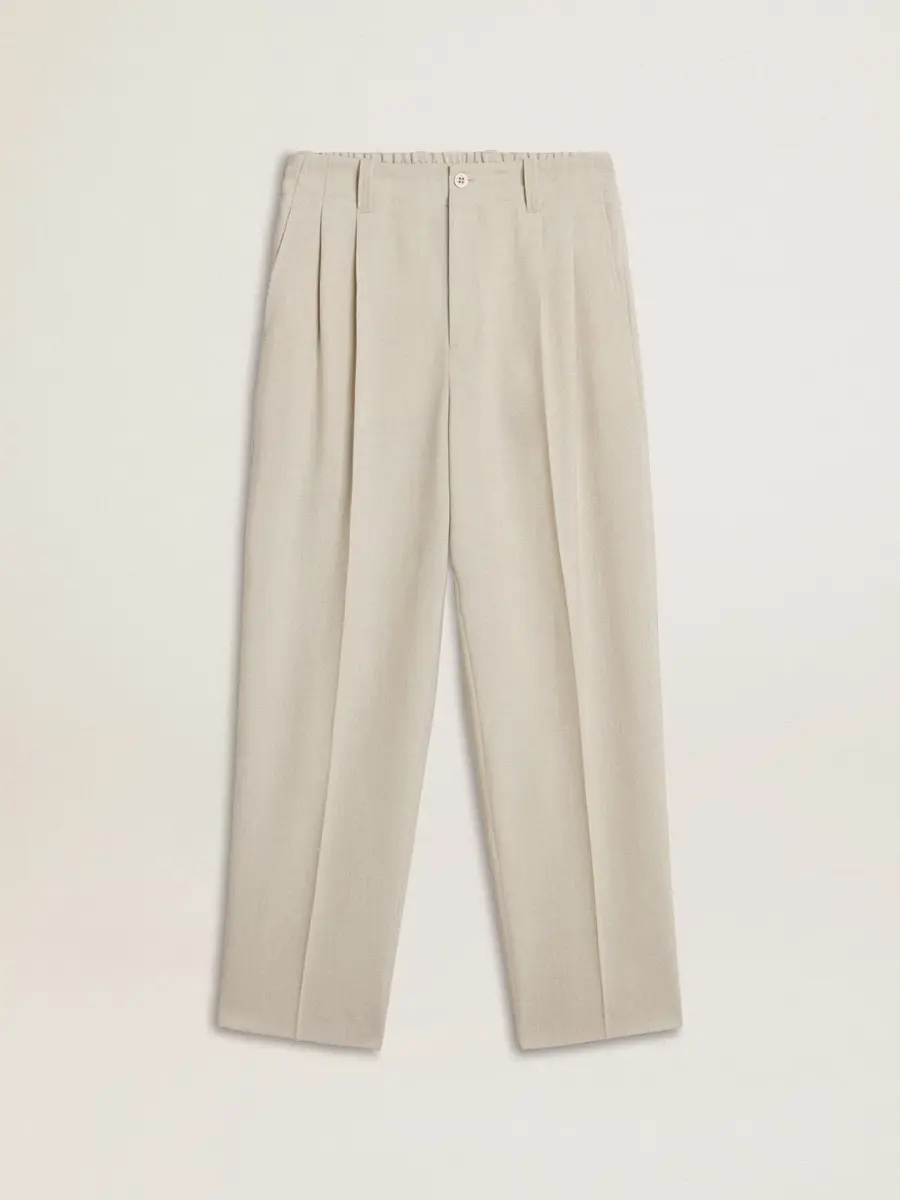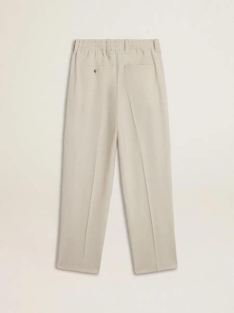 Abrazando la esencia de la temporada, esta colección irradia vitalidad y libertad, combinando una elegancia aireada con chispas dinámicas de energía. En una mezcla de lana de color caqui, estos pantalones de jogging para hombre presentan una pierna holgada, con pliegues delanteros de estilo sartorial. La cintura elástica en la parte trasera y el botón de cuerno con el logotipo como cierre añaden el toque final.