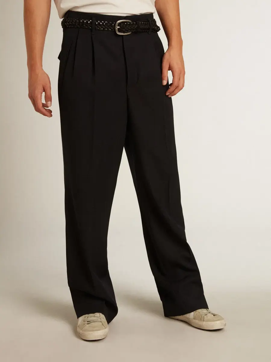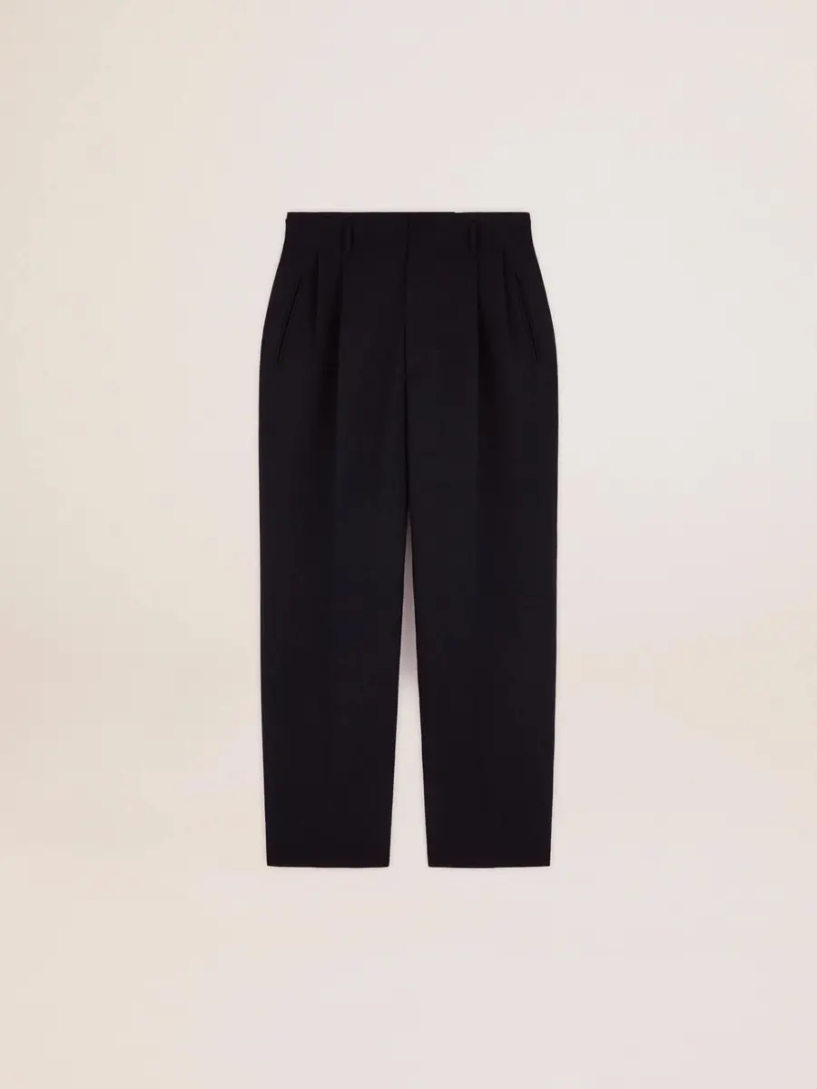 Una colección única y atemporal que engloba la esencia de Golden Goose, diseñada para acompañarte cada día y acompañarte en tus altibajos, llueva o haga sol. Estos pantalones de lana azul oscuro presentan un corte ancho y pinzas en la parte delantera.