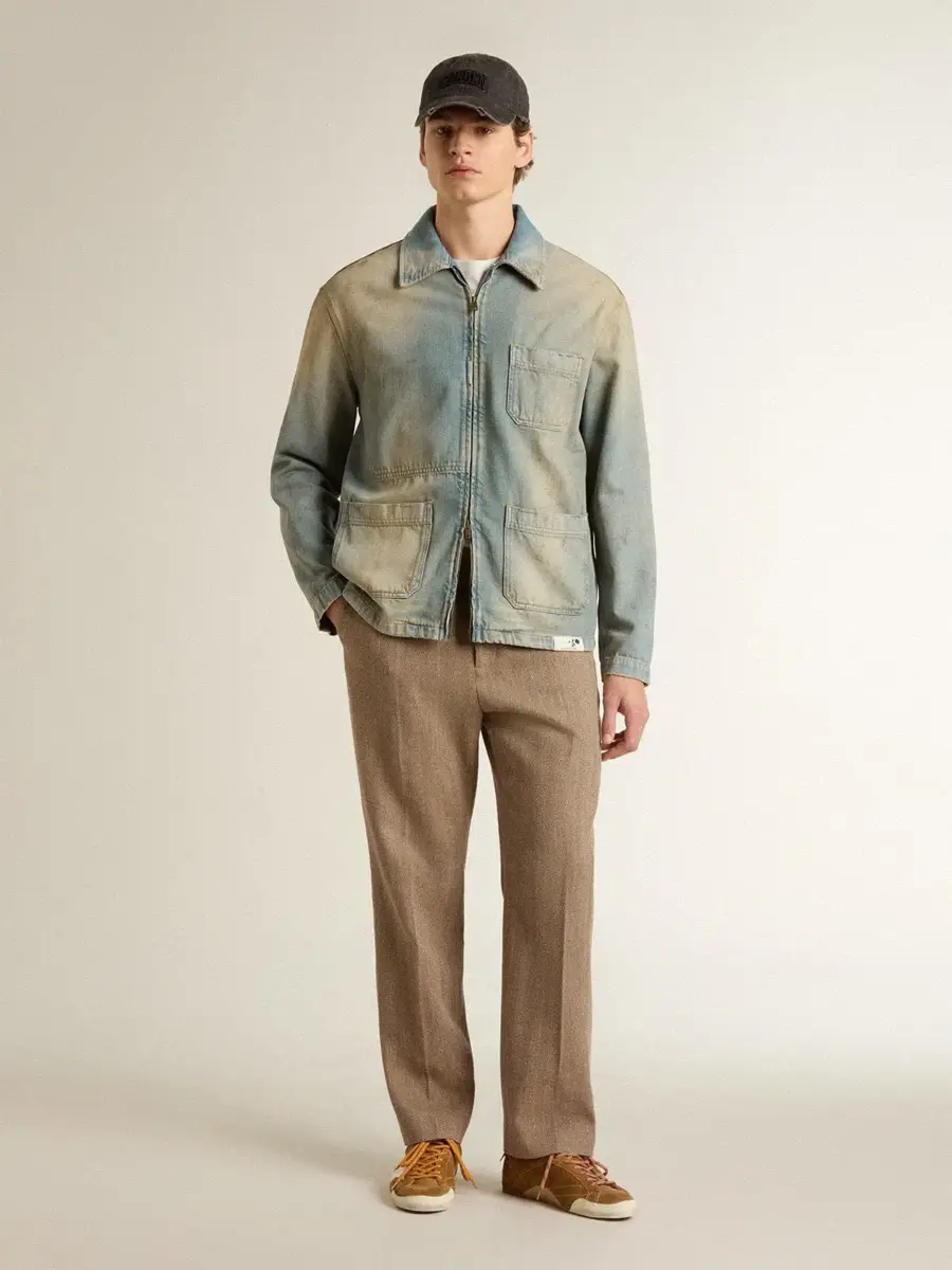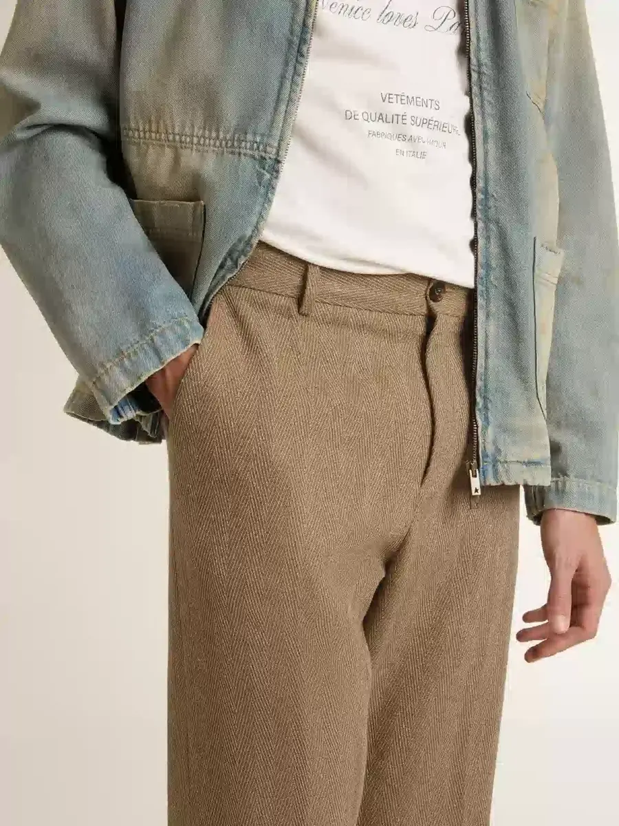 Inspirados en los icónicos años setenta, el espíritu desenfadado de esa época cobra vida con el primer lanzamiento de nuestra colección Otoño/Invierno 25. Estos pantalones de sastrería para hombre en color arena, confeccionados en mezcla de lino con diseño en forma de chevron, presentan un corte holgado y cuatro bolsillos. La doble estrella en la parte trasera añade el toque final.