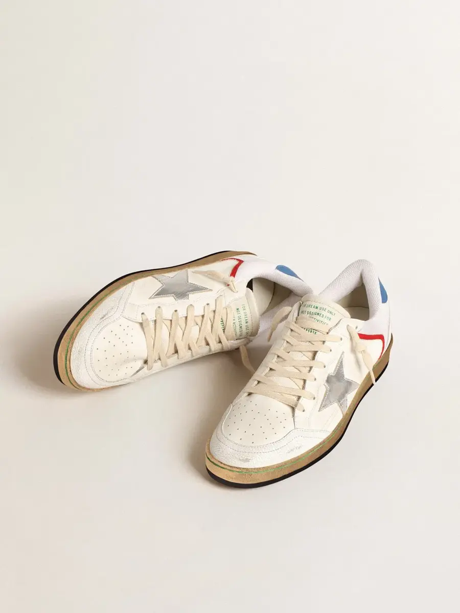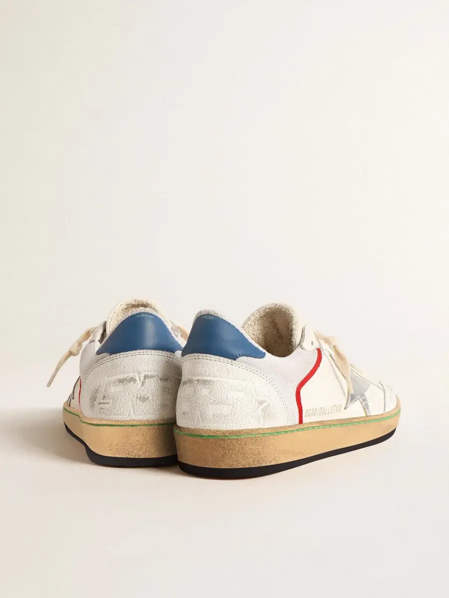 Soñando con los años ochenta. Nuestras zapatillas Ball Star tienen un aire universitario americano, a caballo entre el baloncesto y el skate. Este modelo, con parte superior de piel napa blanca y malla, cuenta con una estrella de piel metalizada plateada y una lengüeta trasera de piel azul. Los insertos de piel craquelada blanca, los detalles rojos y los cordones beige añaden el toque final: cosas bonitas que nunca pasan de moda.