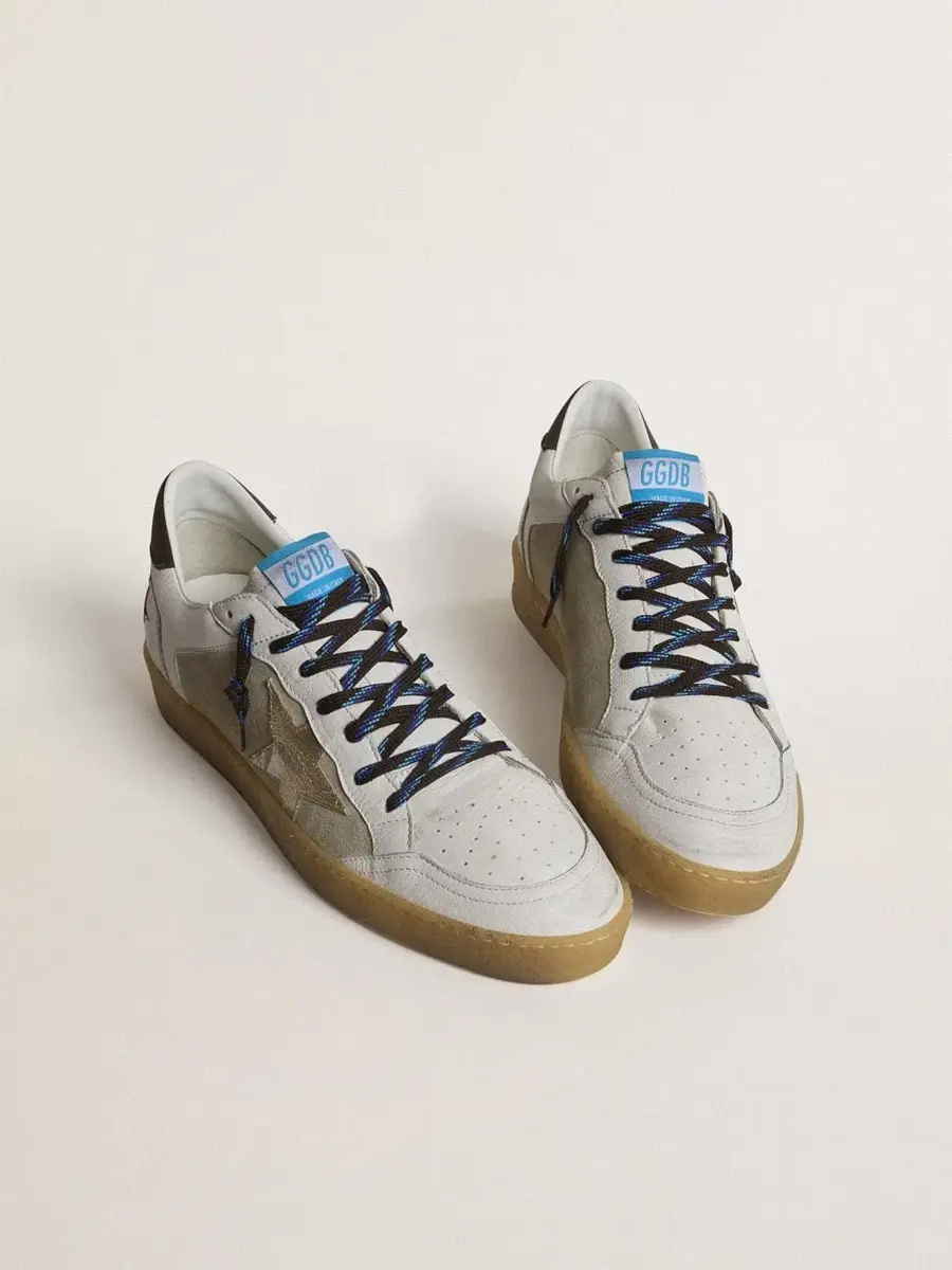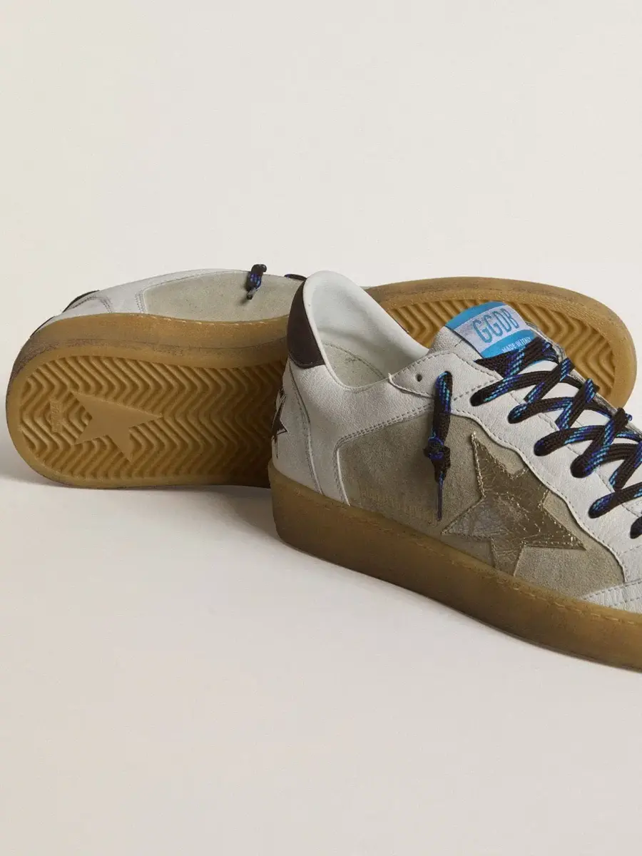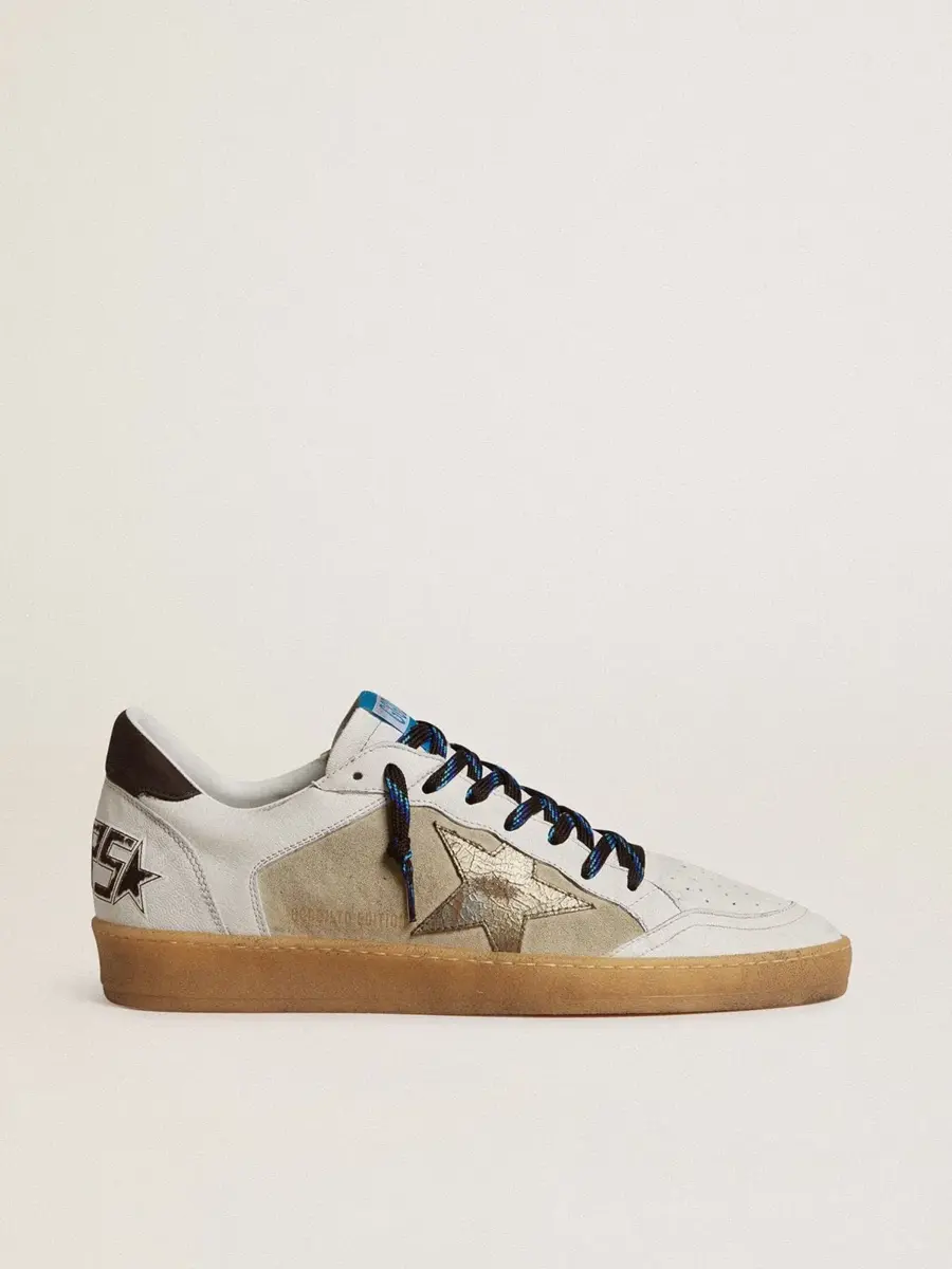 Soñando con los años ochenta. Nuestras zapatillas Ball Star tienen un aire universitario americano, a caballo entre el baloncesto y el skate. Como este modelo confeccionado con ante beige y piel napa blanca en la parte superior, con una estrella de piel metalizada con efecto craquelado y lengüeta marrón en el talón. Los cordones negros y azul claro y la inscripción «Sneakers» en el talón con una fuente marrón «heavy metal» añaden el toque final: cosas bonitas que nunca pasan de moda.
