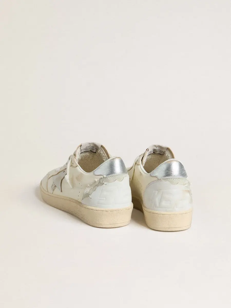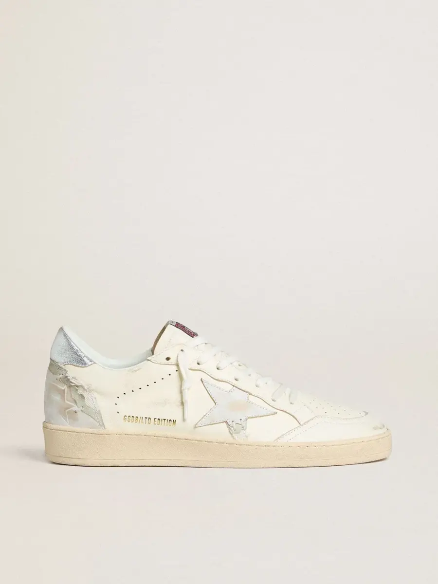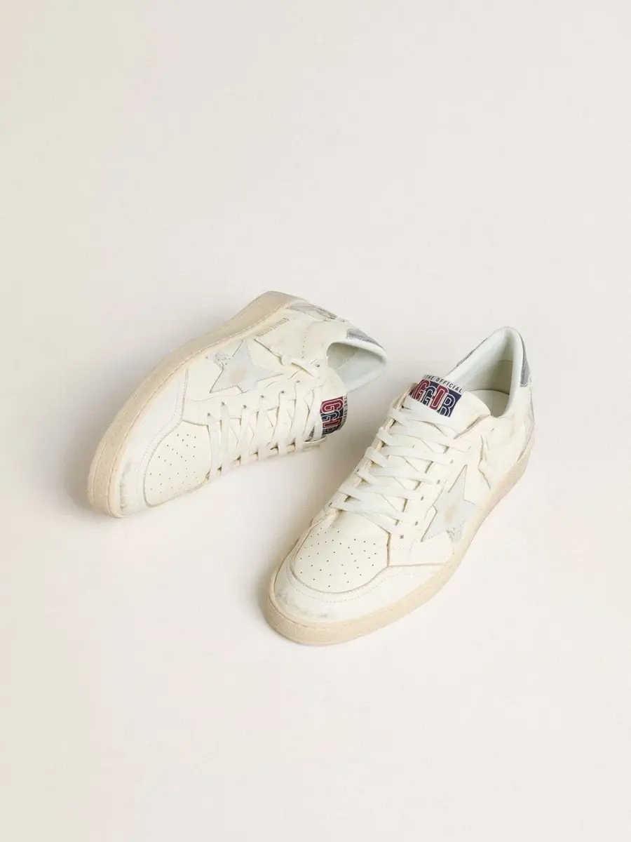 Soñando con los años ochenta. Nuestras zapatillas Ball Star tienen un aire universitario americano, a caballo entre el baloncesto y el skate. Como este modelo confeccionado en piel napa color crema, con una estrella de piel blanca y una lengüeta metálica plateada en el talón. Los cordones blancos, la inserción blanca en la parte trasera con efecto desgastado y las letras «Sneakers» en el talón en una fuente blanca de metal pesado añaden el toque final.