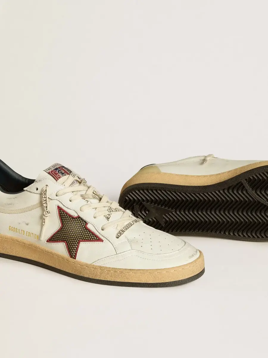 Soñando con los años ochenta. Nuestras zapatillas Ball Star tienen un aire universitario americano, a medio camino entre el baloncesto y el skate. Este modelo para hombre, con parte superior de piel blanca, presenta una estrella de malla azul medianoche con forro beige y ribete rojo, y una lengüeta de piel azul medianoche en el talón. La inserción de TPU beige con efecto texturizado en la parte trasera y los cordones blancos con el logotipo en contraste añaden el toque final: cosas bonitas que nunca pasan de moda.
