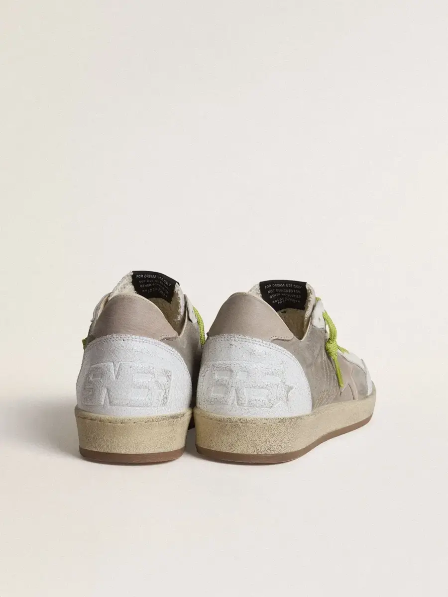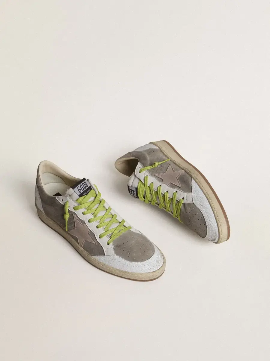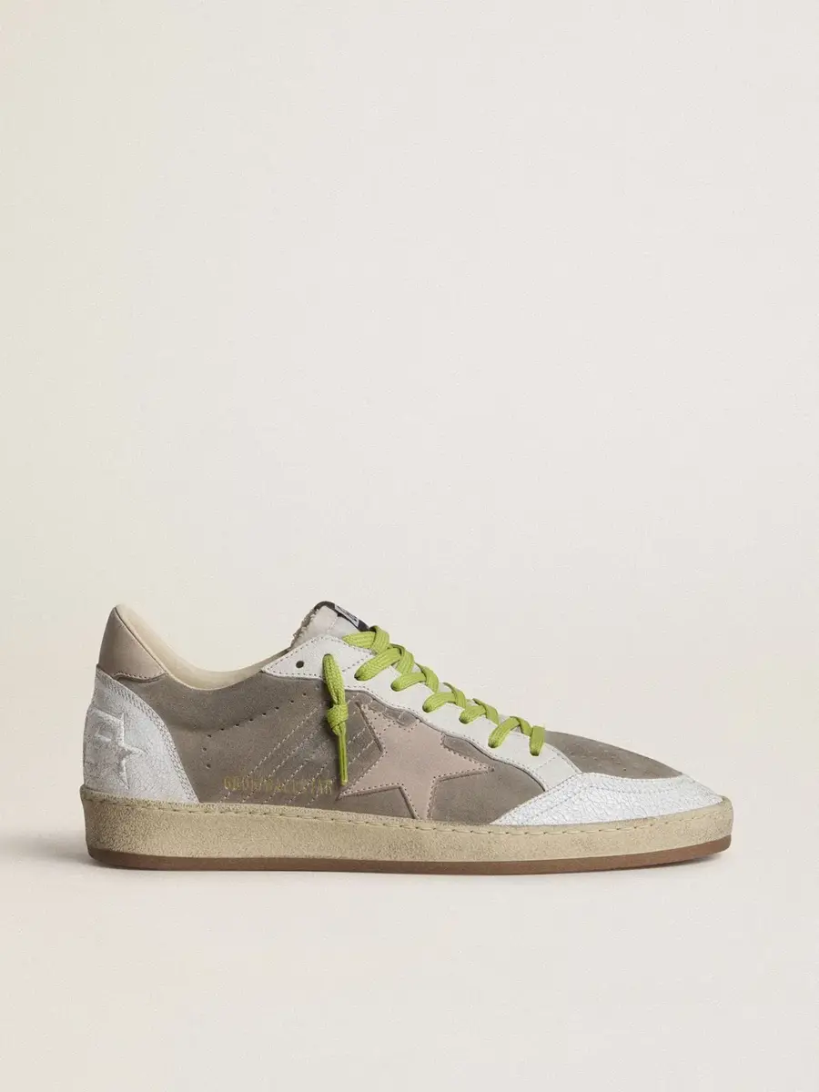 Soñando con los años ochenta. Nuestras zapatillas Ball Star tienen un aire universitario americano, a caballo entre el baloncesto y el skate. Este modelo, con parte superior de ante gris e inserciones de piel craquelada blanca, presenta una estrella de ante rosa antiguo y una lengüeta de cuero beige en el talón. Y los cordones verdes añaden el toque final: cosas bonitas que nunca pasan de moda.