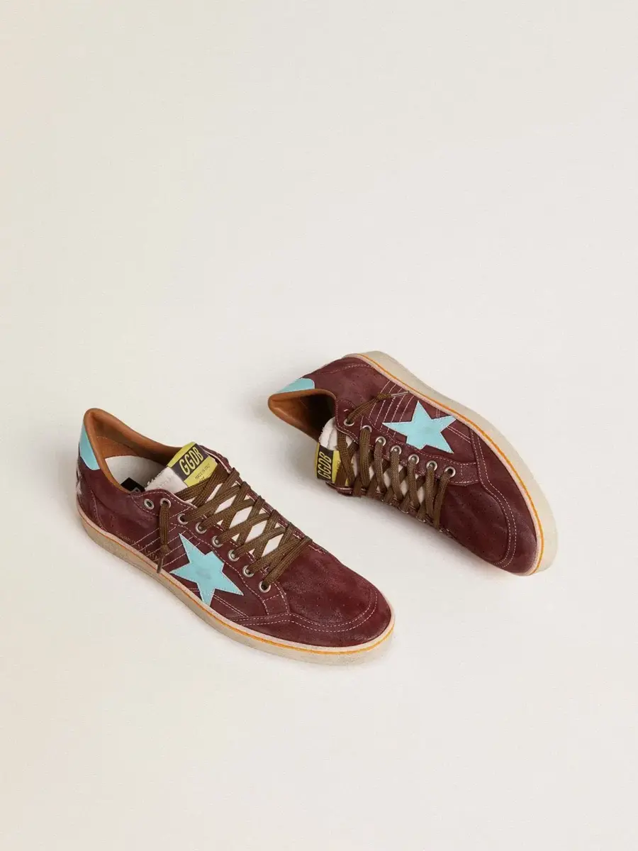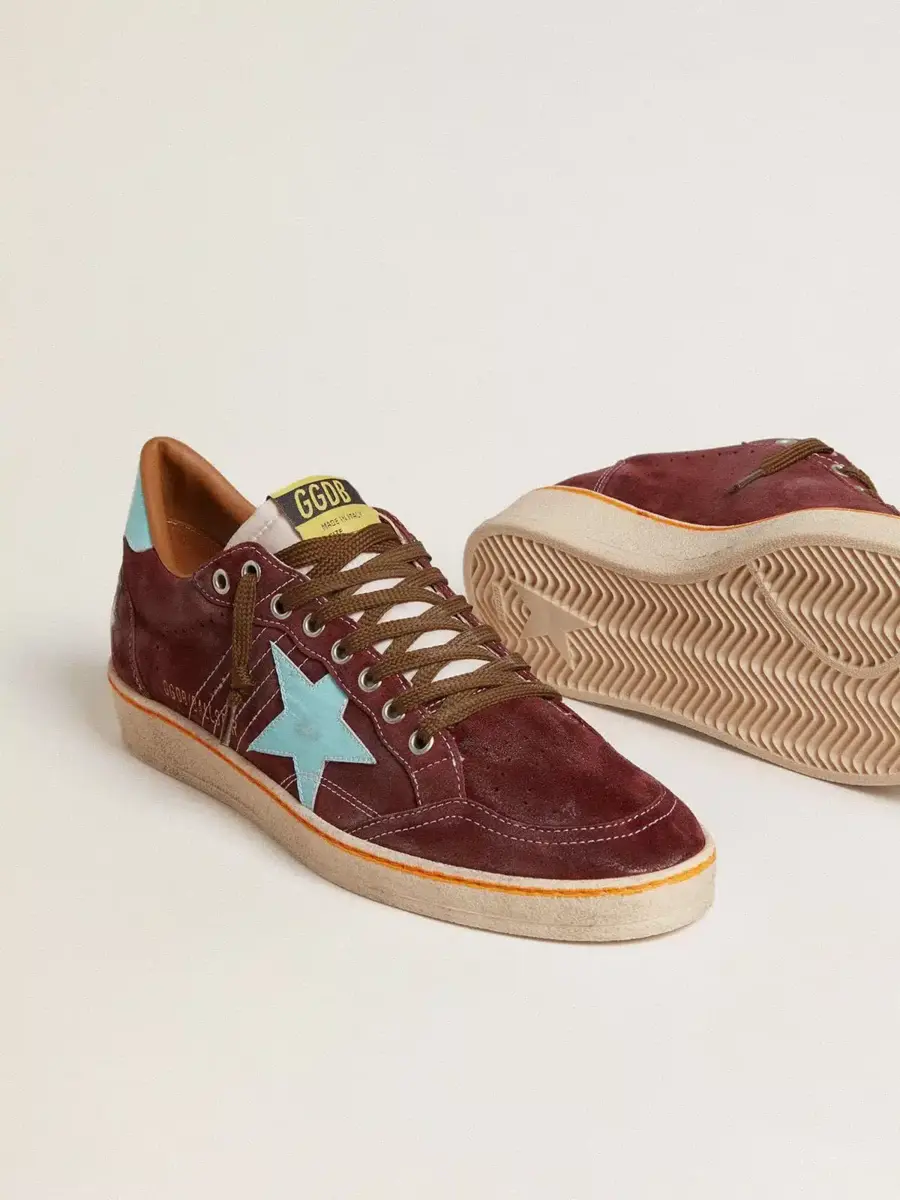 Soñando con los años ochenta. Nuestras zapatillas Ball Star tienen un aire universitario americano, a medio camino entre el baloncesto y el skate. Este modelo, con parte superior de ante rojo oscuro, presenta una estrella y una lengüeta en el talón de piel laminada azul Tiffany. Los cordones marrones, la lengüeta de nailon y las letras «Sneakers» en el talón, en una fuente blanca de estilo heavy metal, le dan el toque final.