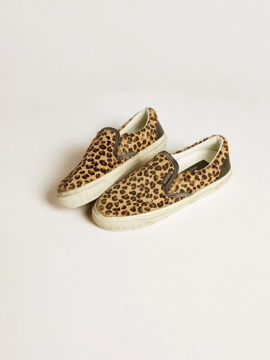 VCE habla un lenguaje sencillo. Canalizando la imagen desenfadada de la cultura del skate californiana, el diseño sin cordones encarna la comodidad, la versatilidad y la libertad de movimiento. Con puntera de goma y parte superior de piel de potro con estampado de leopardo en beige y marrón, este modelo para hombre cuenta con una lengüeta de cuero negro en el talón.