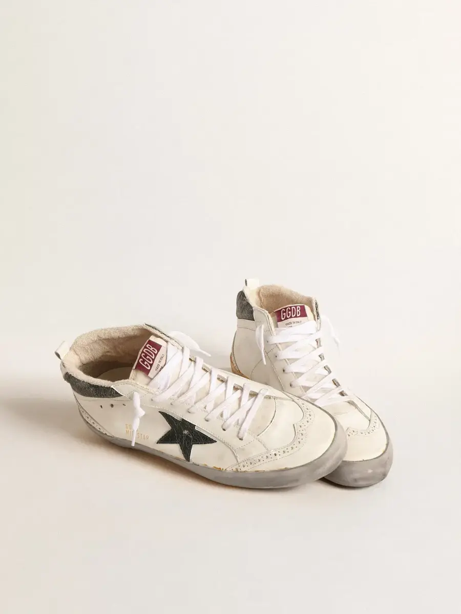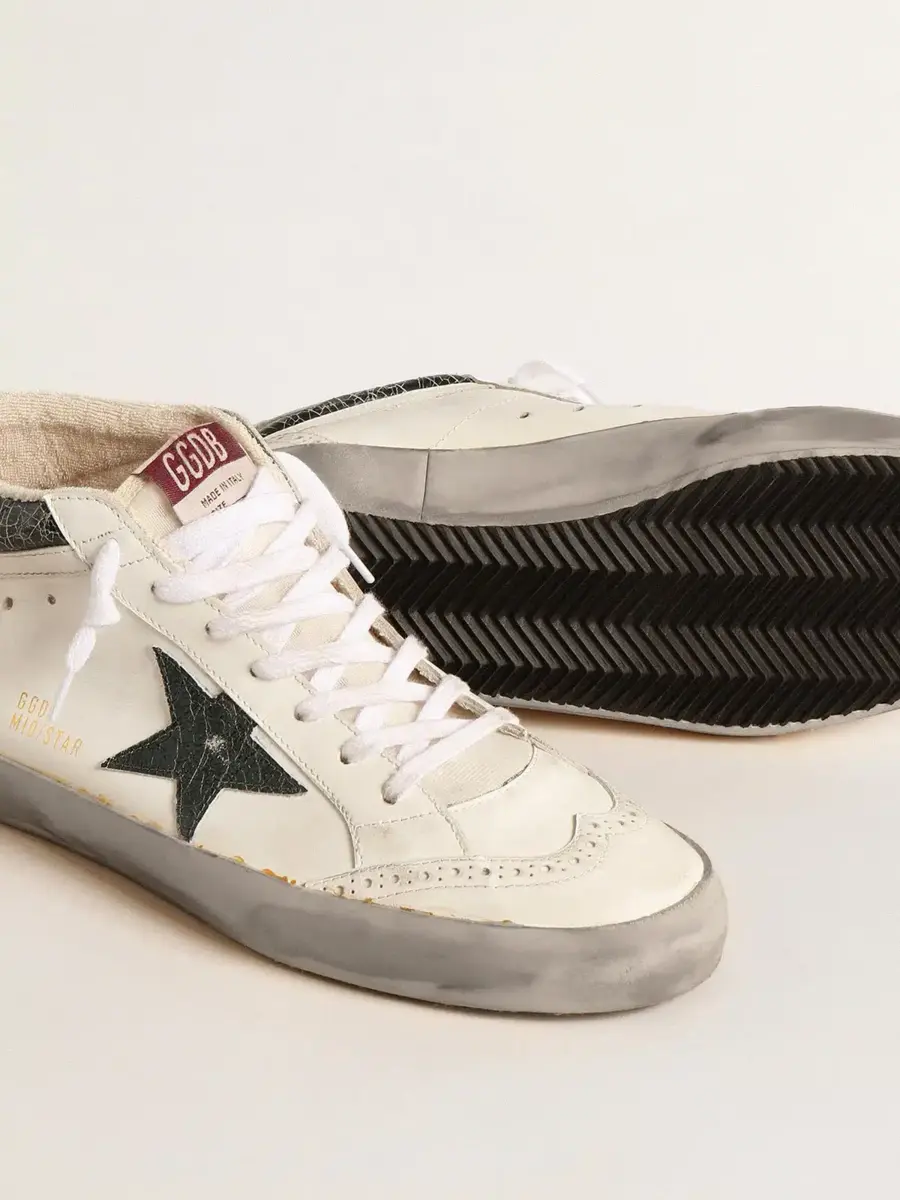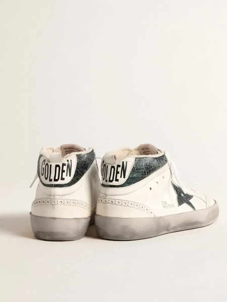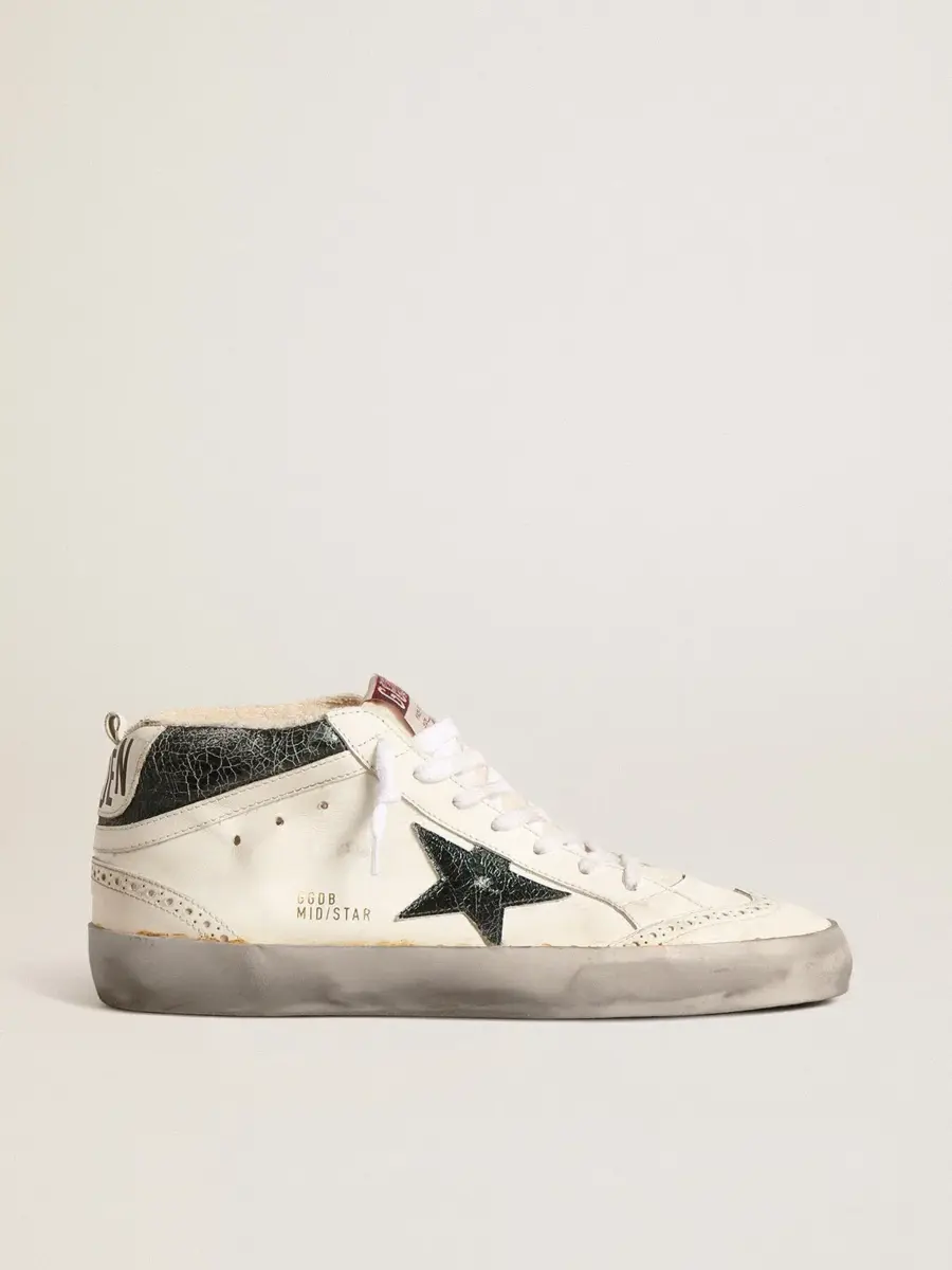 Versatilidad única y elegante: las zapatillas Mid Star adoptan un enfoque refinado de su inspiración en la escena del skate de los noventa. Con una parte superior de piel blanca e inserciones tono sobre tono con brogue, este modelo presenta una estrella de piel metalizada verde esmeralda craquelada y un flash de piel blanca. La piel metalizada verde esmeralda craquelada y la lengüeta del talón de piel blanca, el ribete gris y los cordones blancos completan el look.