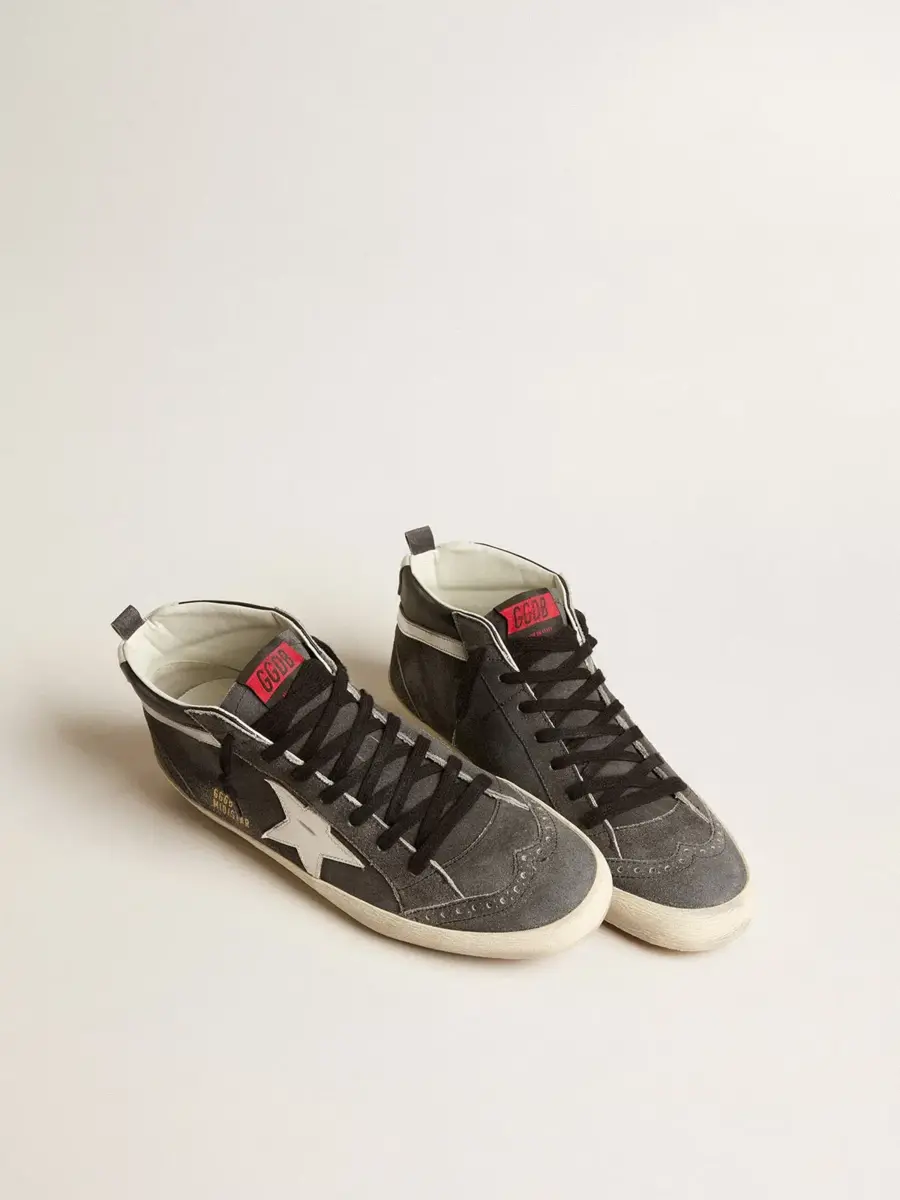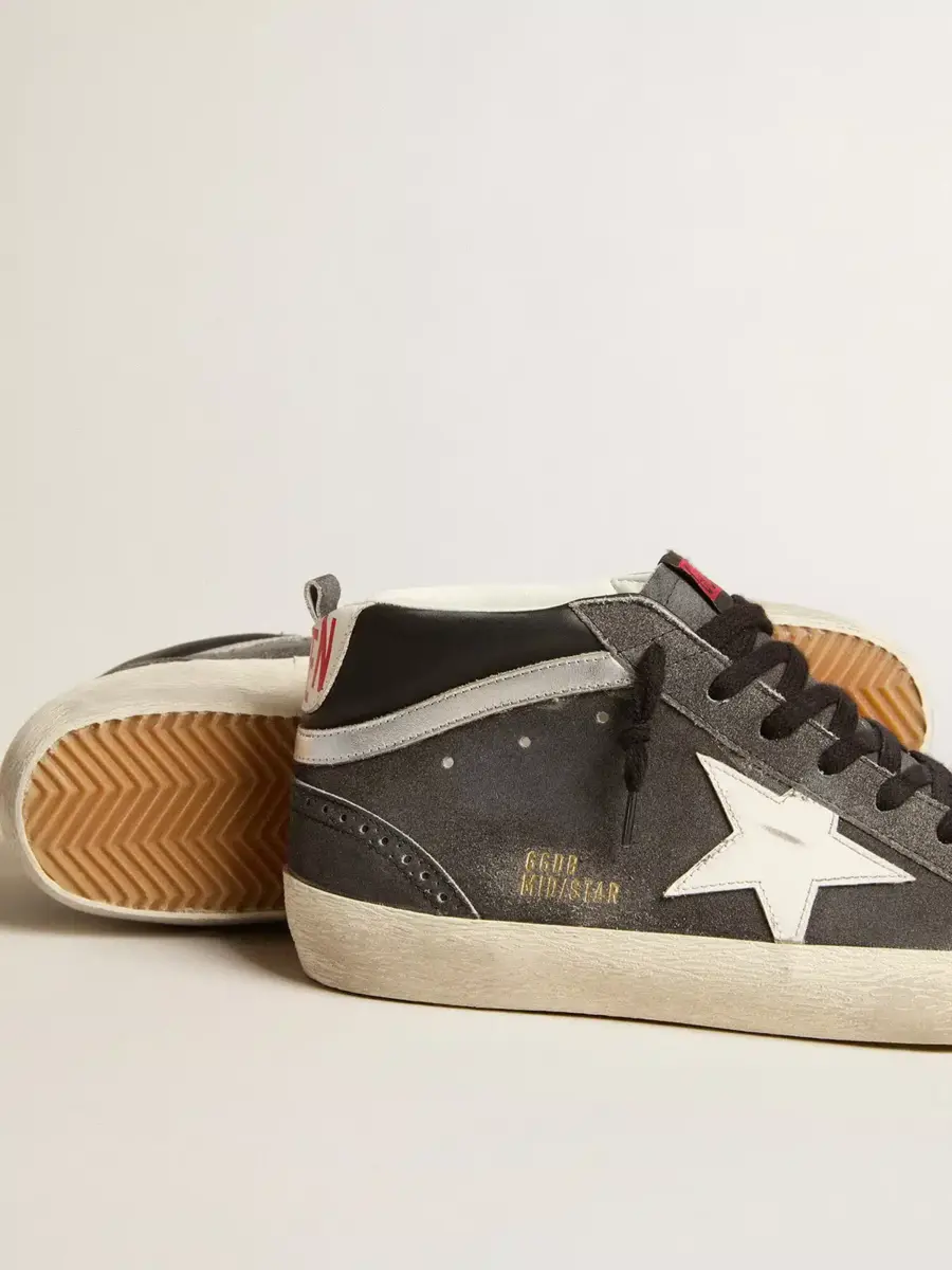 Versatilidad única y elegante: las zapatillas Mid Star adoptan un enfoque refinado de su inspiración en la escena del skate de los noventa. Este modelo con parte superior de ante negro cuenta con una estrella de cuero blanco y un detalle metálico plateado de cuero. La lengüeta del talón de cuero blanco, la inserción de cuero negro en el tobillo y los cordones negros completan el look.