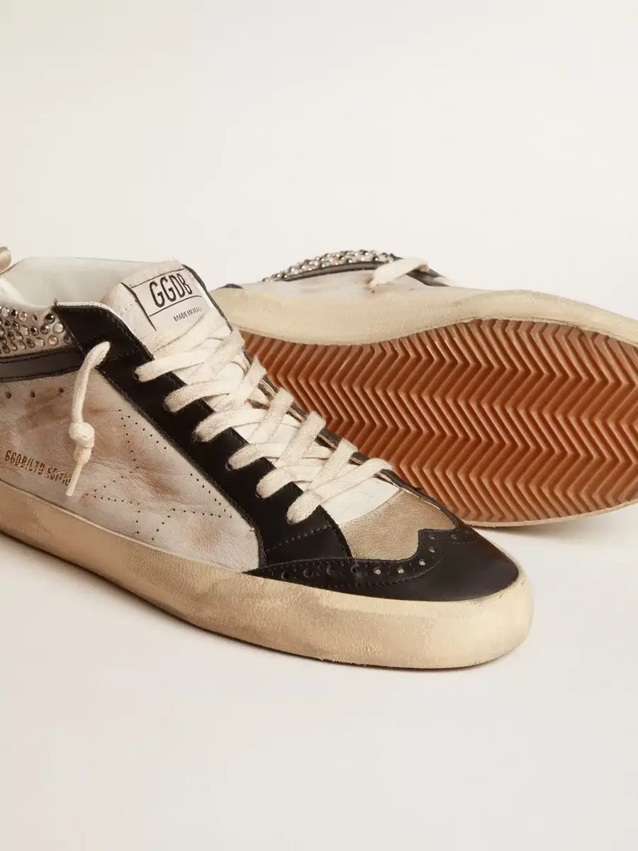 Versatilidad única y elegante: las zapatillas Mid Star aportan un toque refinado a su inspiración en la escena skater de los noventa. Este modelo para hombre, con una parte superior de piel blanca decorada con perlas multicolores, presenta una estrella perforada y un detalle de piel negra. Las inserciones de piel negra, la lengüeta del talón de piel metalizada platino y los cordones blancos completan el look. Item No. GMF00247.F005950.82373 GMF00247.F005950.82373