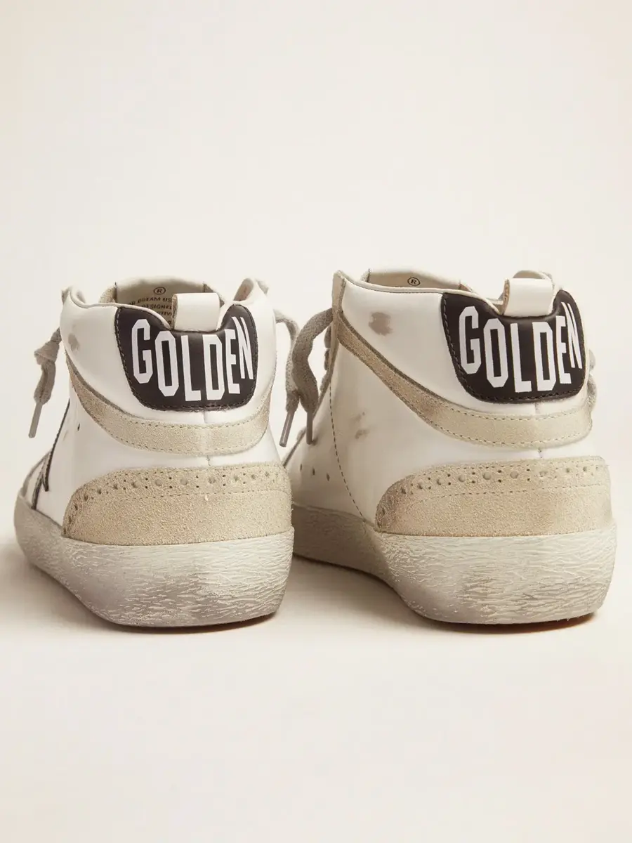 Un look informal que destila elegancia streetwear: un modelo que interpreta el estilo Golden Goose gracias al uso de tratamientos y acabados exclusivos. Estas zapatillas Mid Star presentan una parte superior de piel y ante blanco y gris y una estrella negra.