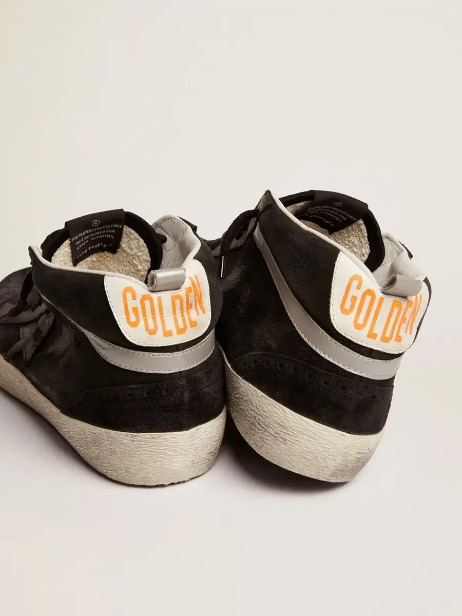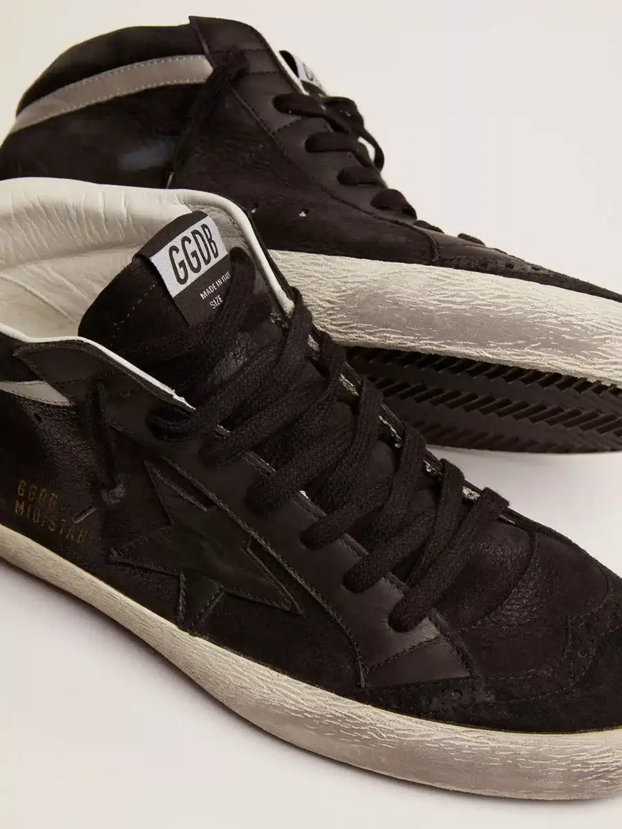 Versatilidad única y elegante: las zapatillas Mid Star aportan un toque refinado a su inspiración en la escena del skate de los noventa. Este modelo con parte superior de nubuck negro cuenta con inserciones de cuero y ante tono sobre tono, una estrella de cuero negro y un detalle laminado plateado. La lengüeta del talón de cuero blanco y los cordones negros añaden el toque final.