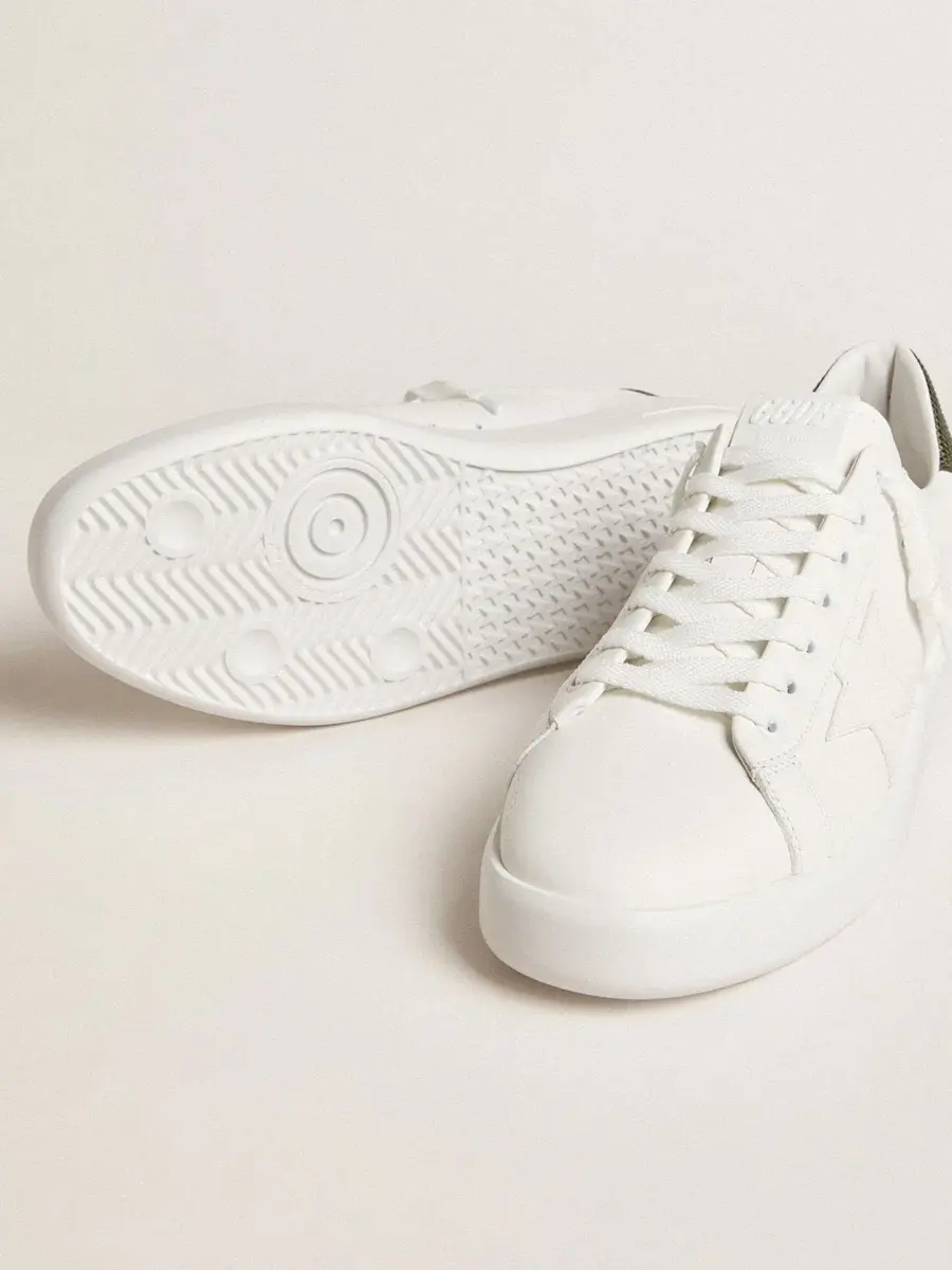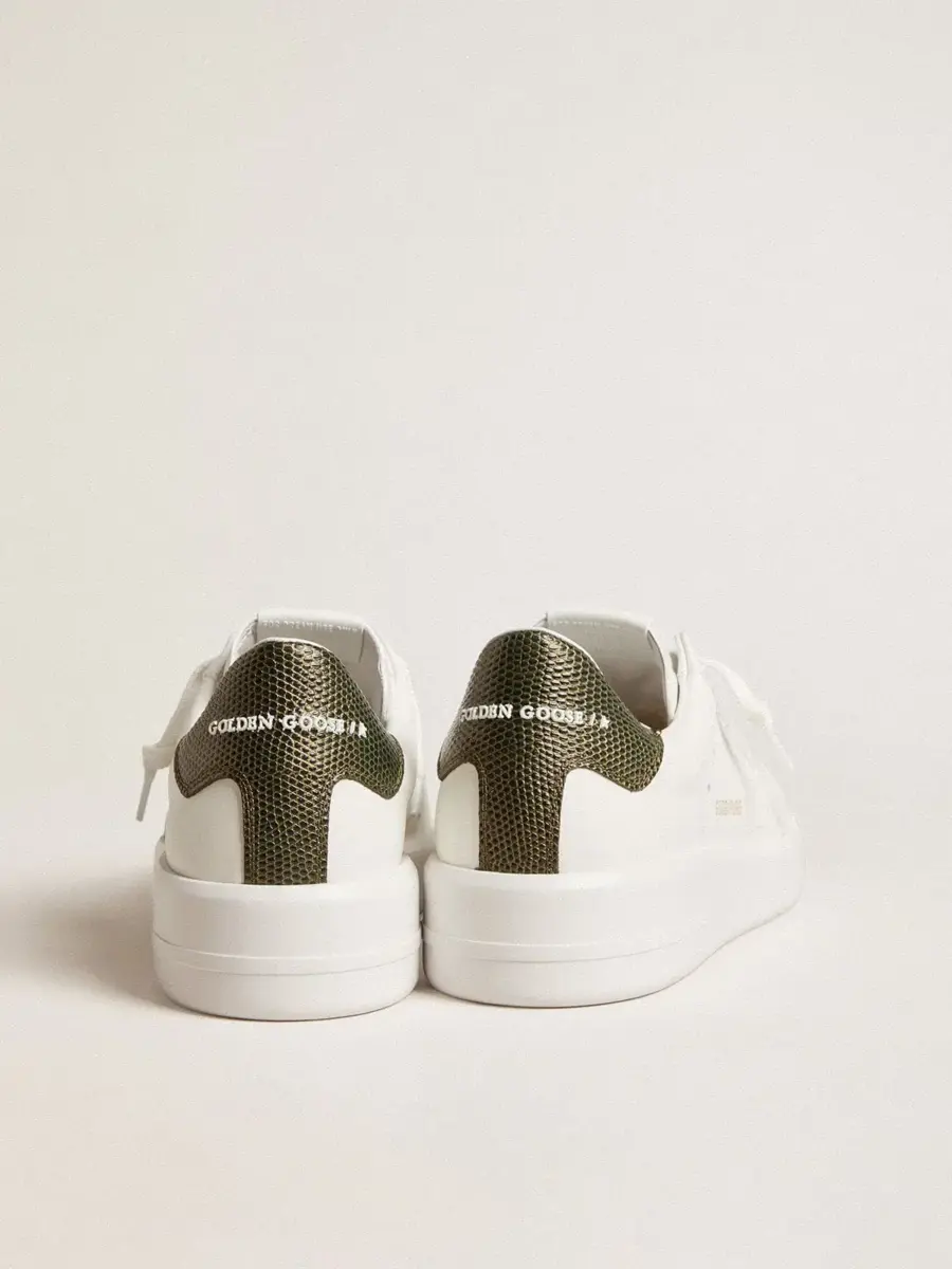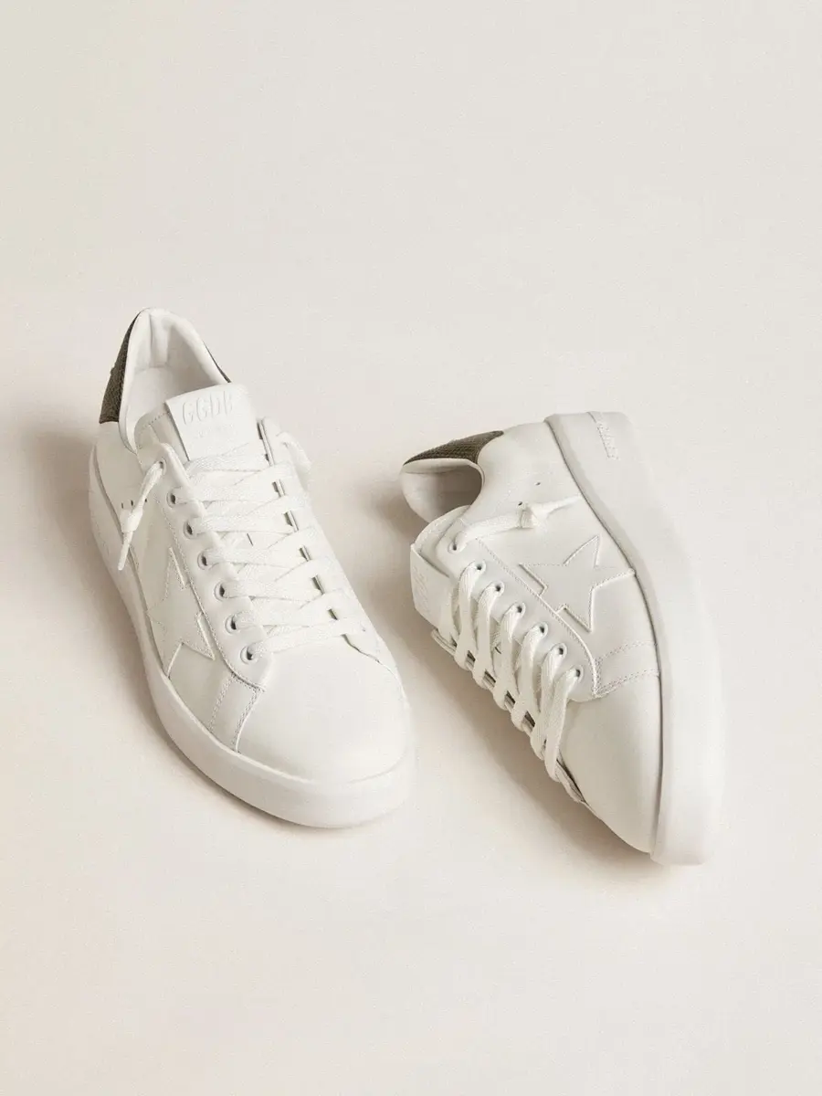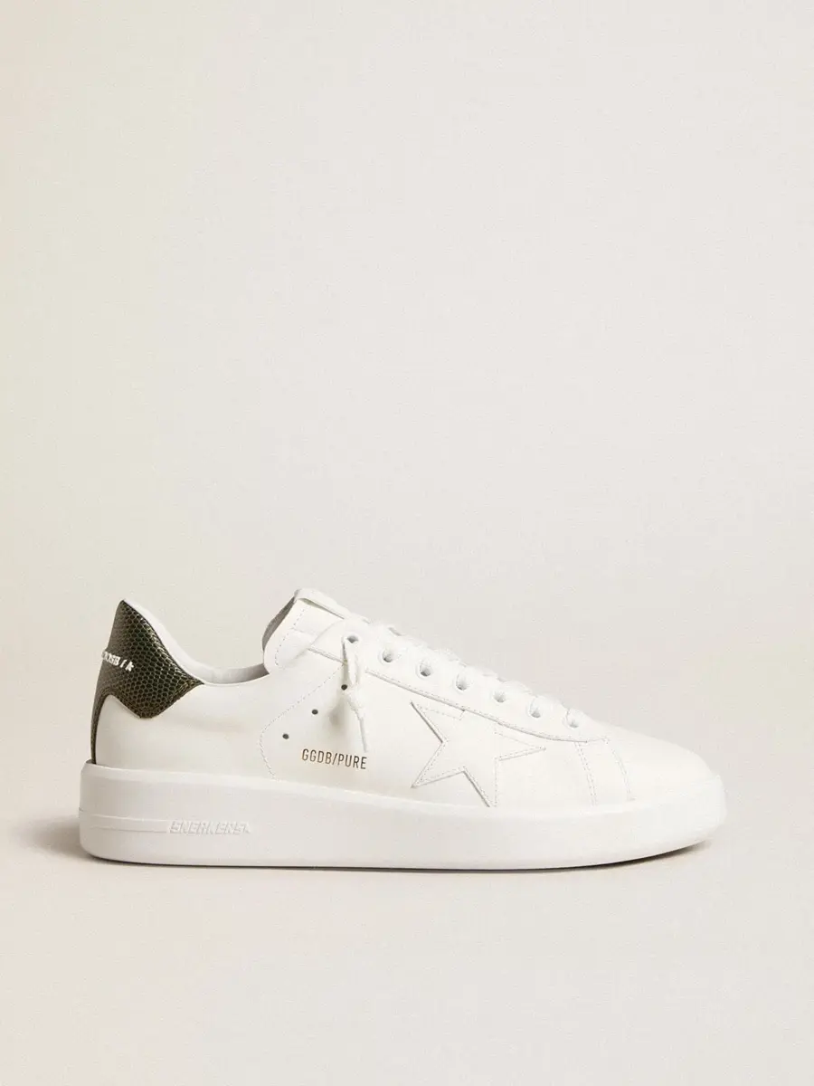 Cuando el minimalismo de la forma se une a la fuerza de los detalles: nuestras zapatillas Purestar combinan un estilo discreto con una comodidad extrema gracias a su tecnología de absorción de impactos. Este modelo para hombre, confeccionado en piel blanca, presenta una estrella de piel blanca y una lengüeta en el talón de piel verde oscuro con estampado de cocodrilo. Los cordones blancos completan el look.